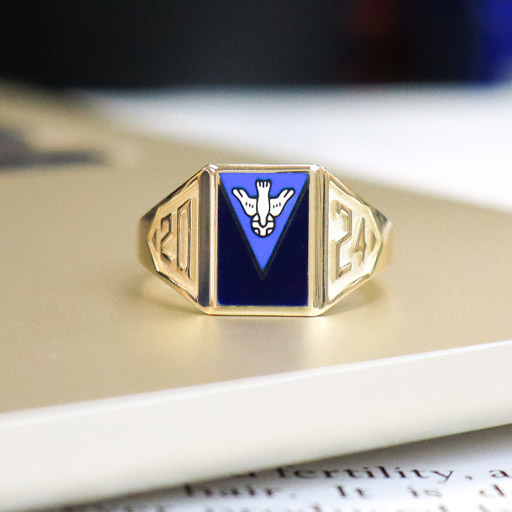 Rings are available in 4 head sizes. The “head size” refers to the square crest across the top of the ring, not the wearer’s ring size. All rings are available in Sterling Silver, Yellow, and White Gold, in either 10 KT , 14 KT or 18 KT. You can choose between a plain or antiquing background for your graduation year. Backdating is also available for an additional $15 charge. A fifty percent deposit is required when ordering your Graduation Ring, the remainder is due upon arrival.