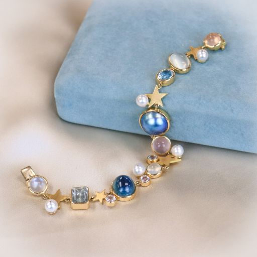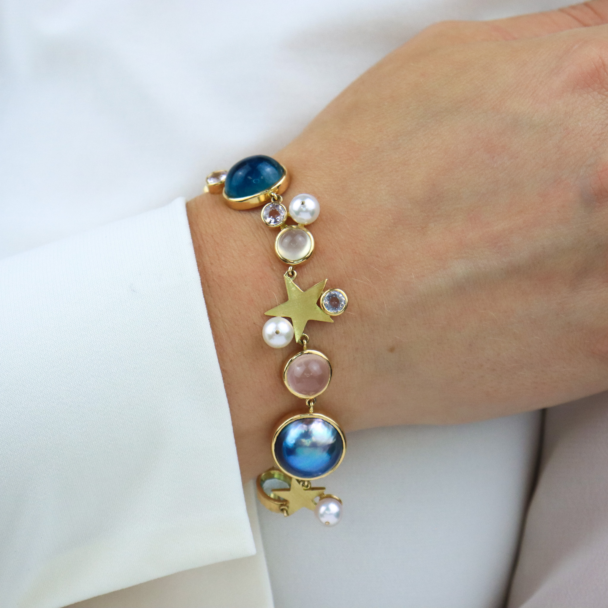 A custom made 18k bracelet set with Cat's eye moonstone, sapphires, aquamarine, star rose quartz, tourmaline, moonstones, blue topaz, mabé & Akoya pearls, and 18ky stars creates a ribbon of celestial beauty around the wrist. Thoughtfully crafted, this bracelet contains a secret for only the wearer: a hidden box clasp, and with pressure in exactly the right spot on one moonstone, releases the closure allowing the bracelet to open.