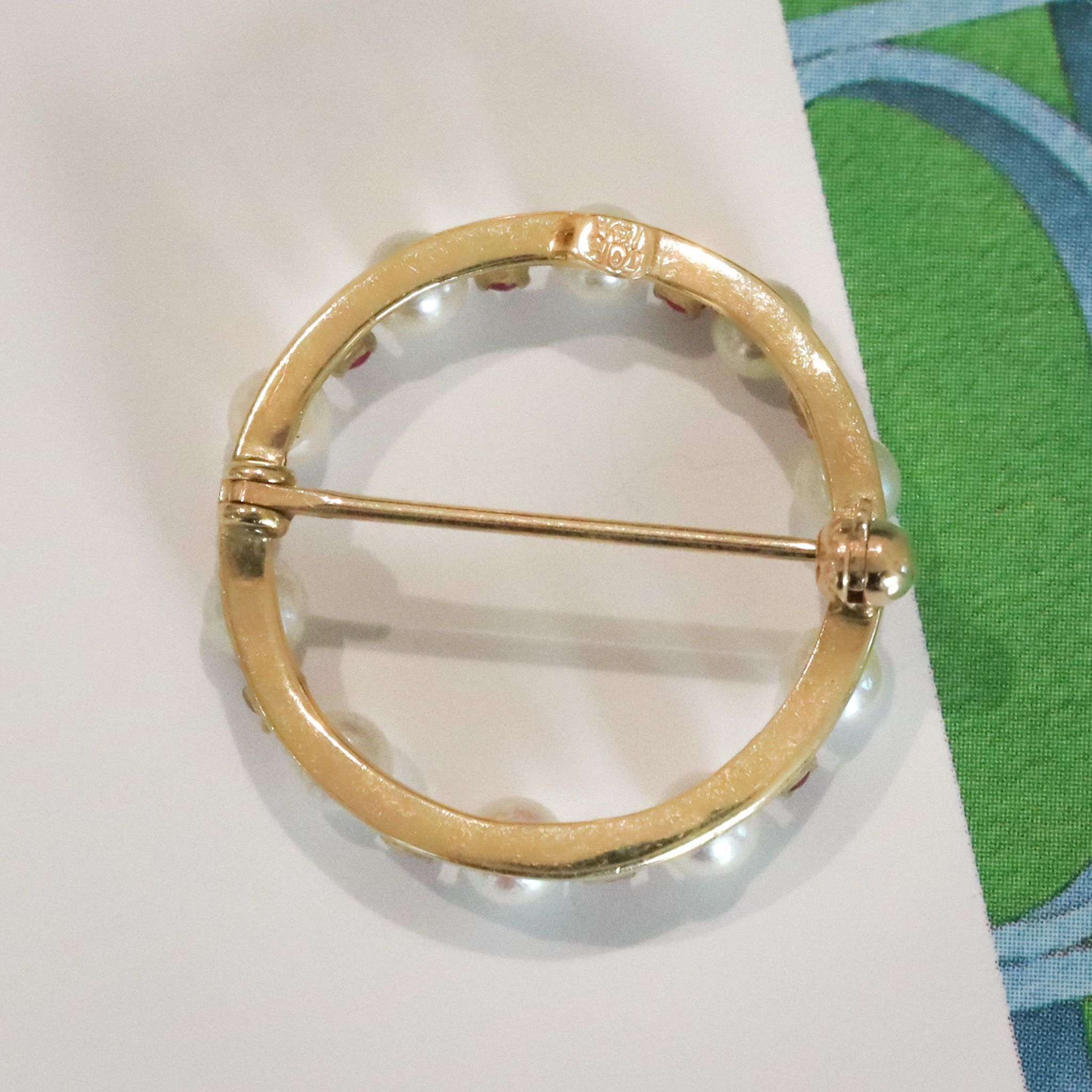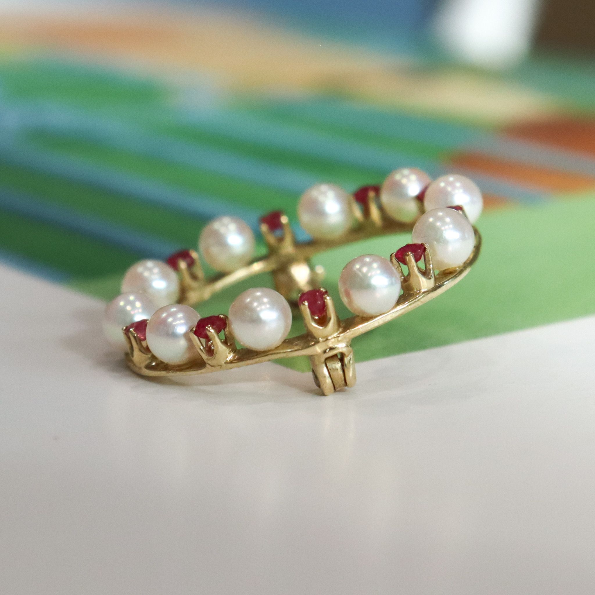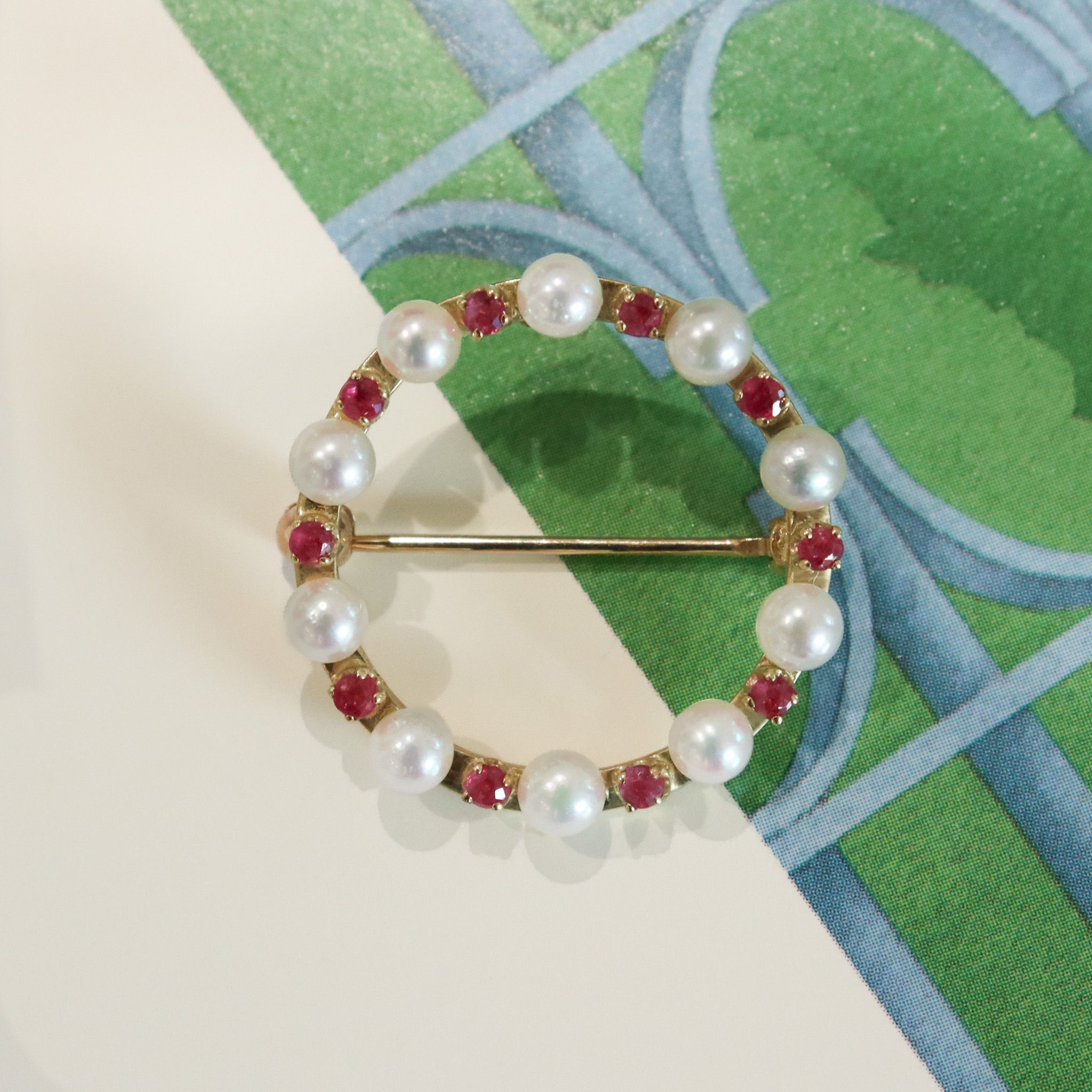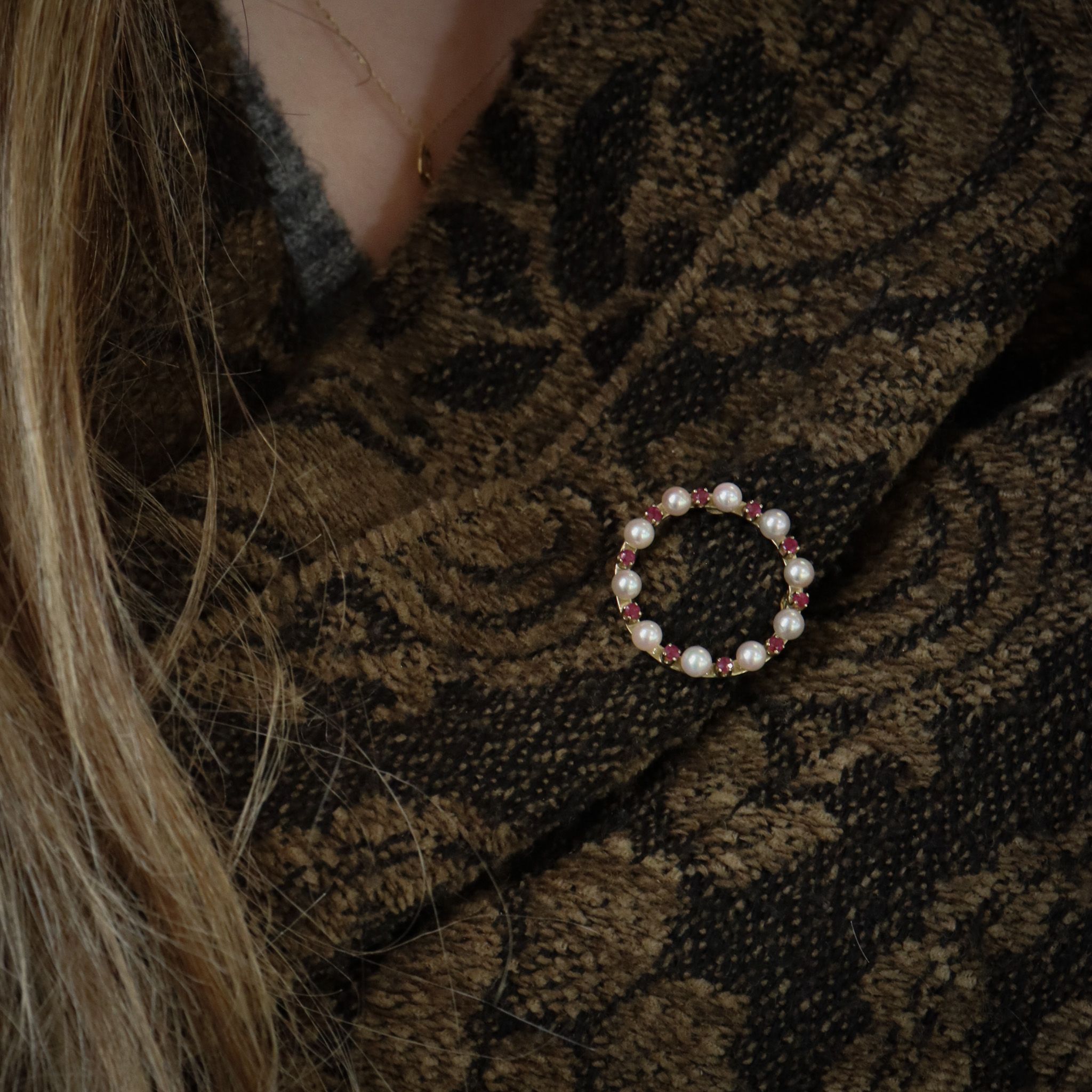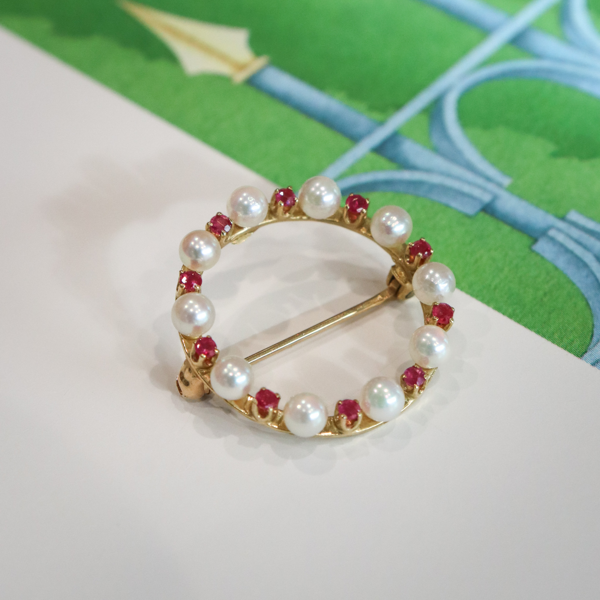If you're looking for a classic brooch to fasten your scarf in style, look no further.  The warmth of the yellow gold and rubies allow the luminescent ivory pearls to be the star of the show.