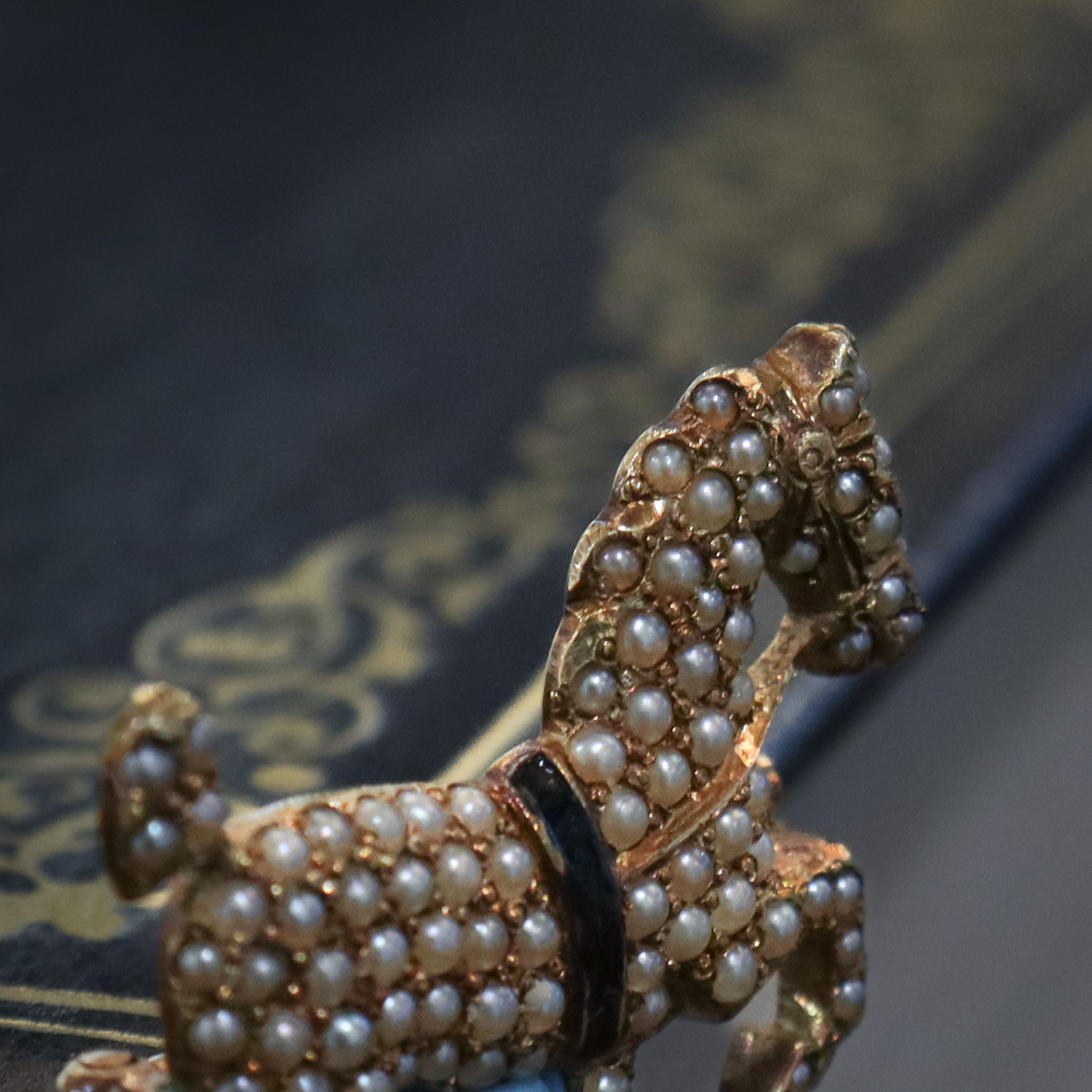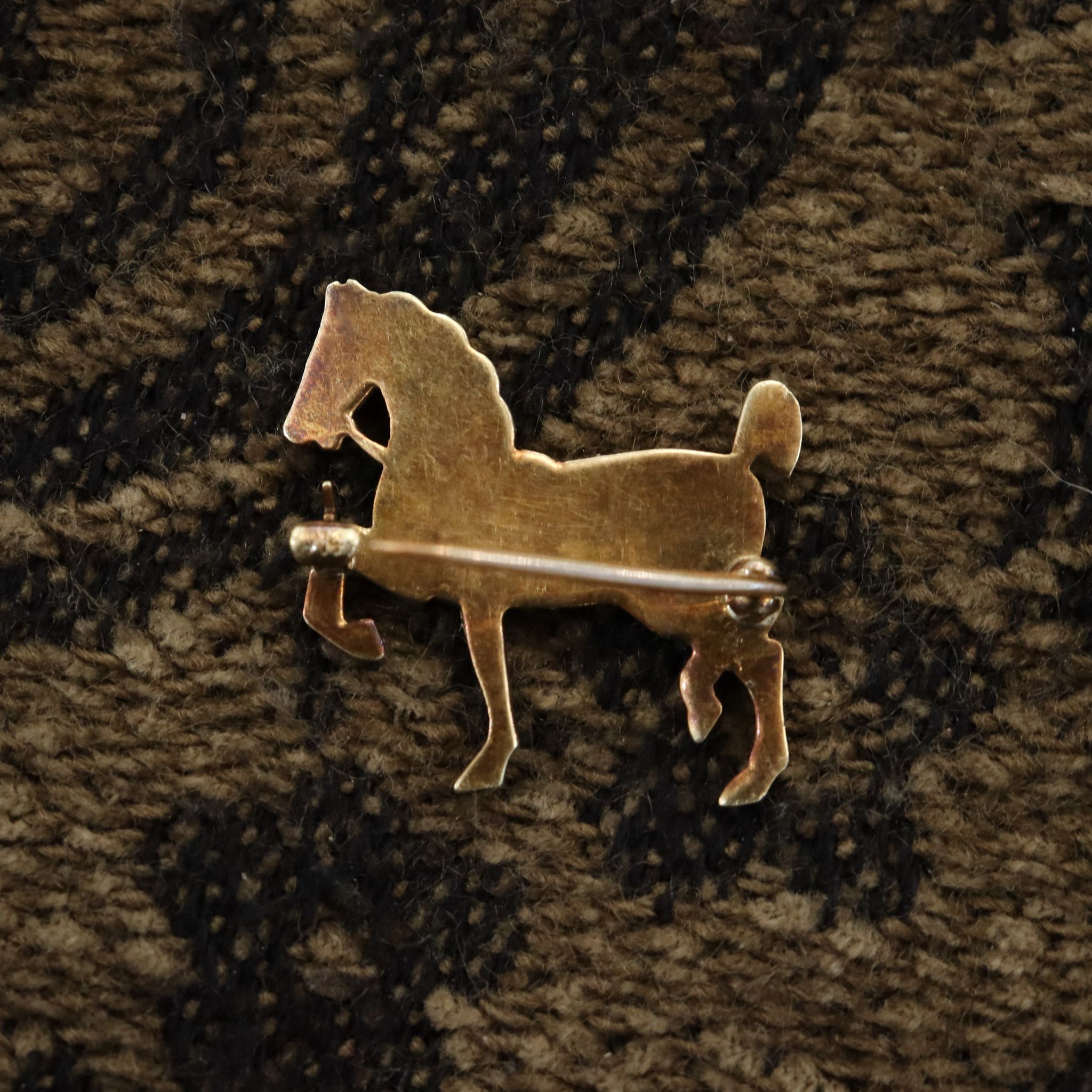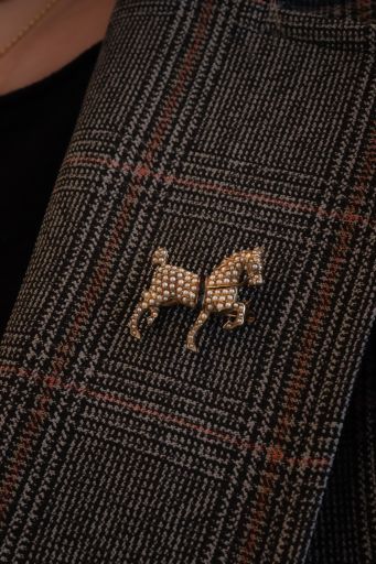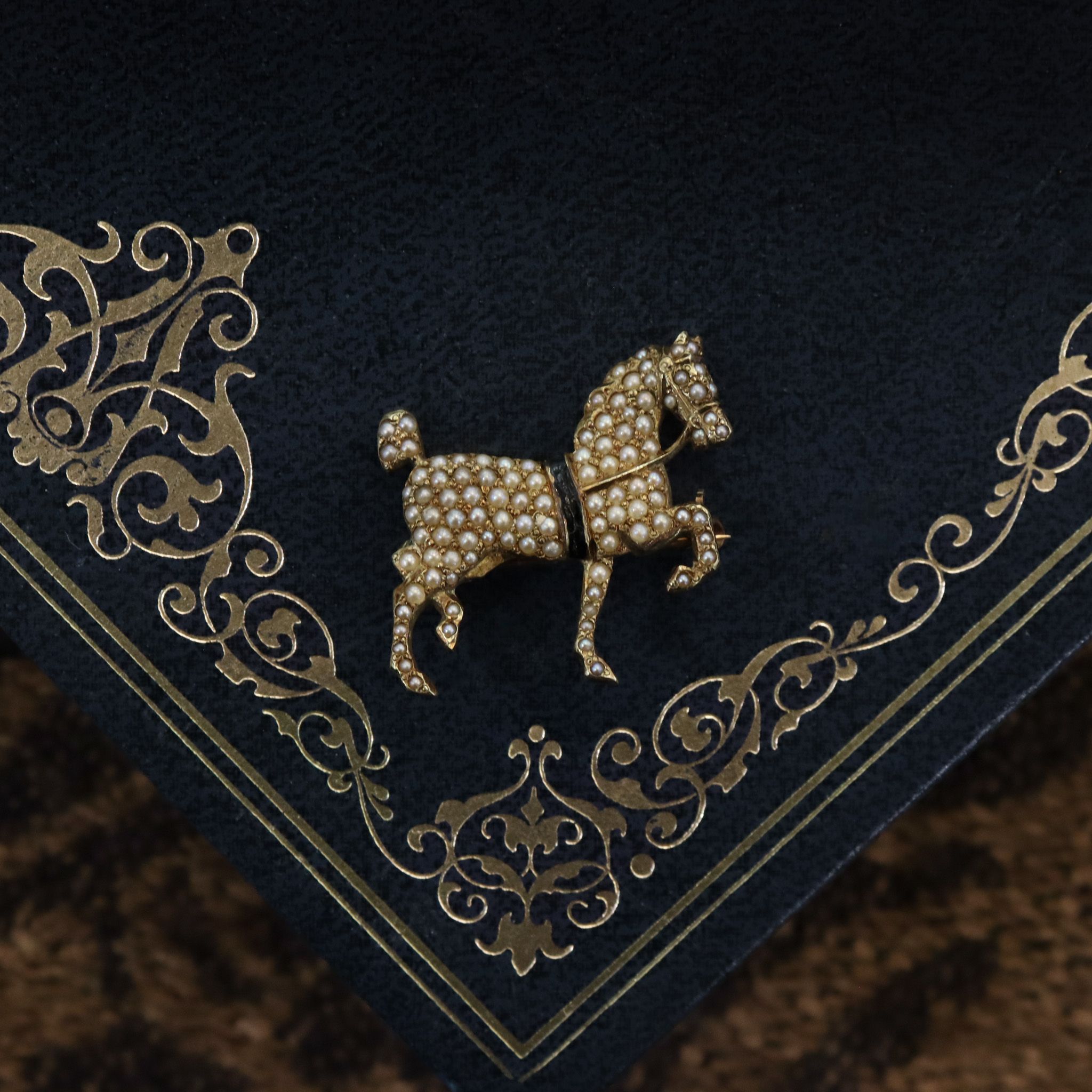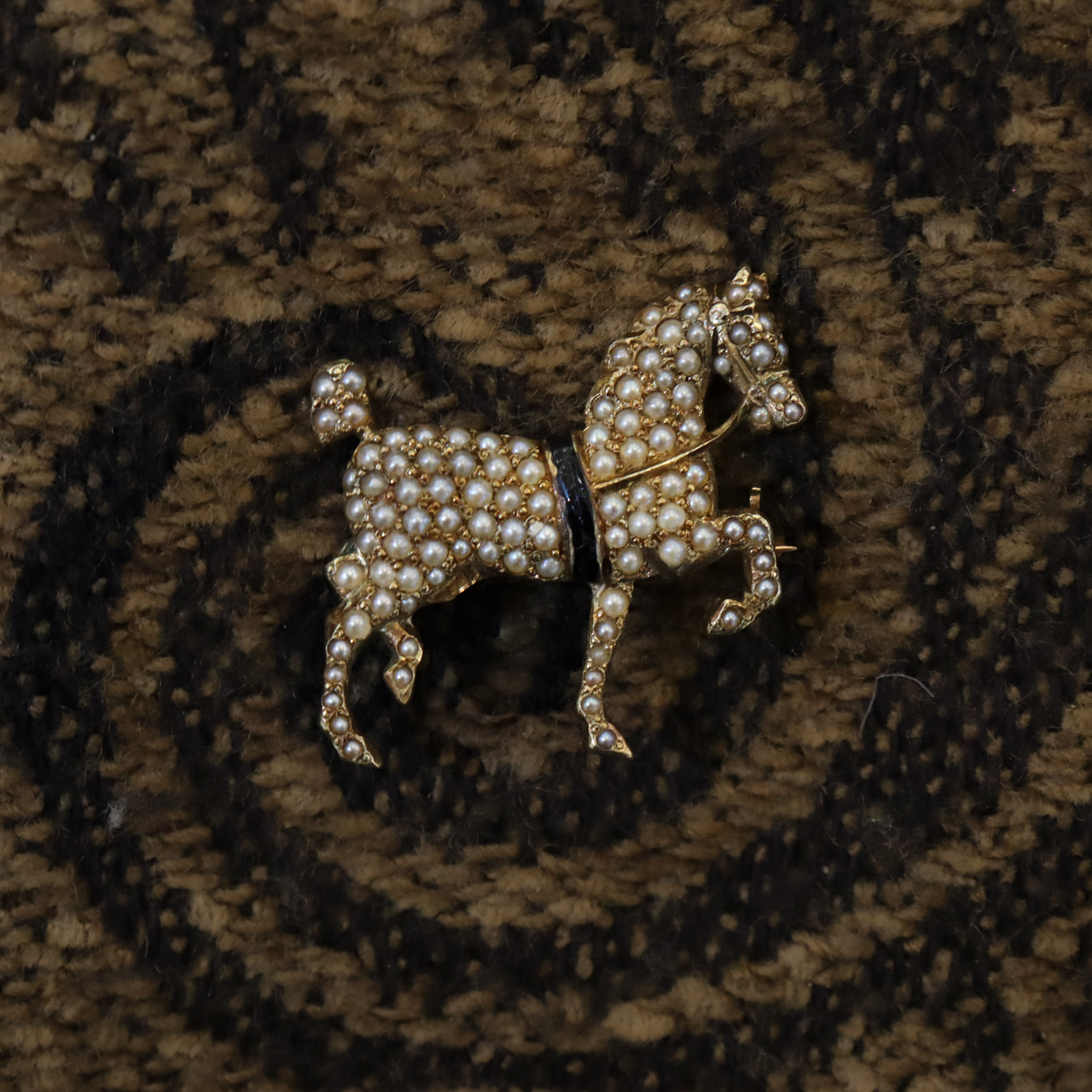 An antique equestrian brooch, set with cream seed pearls and the gold coloured with age to a rustic yellow.