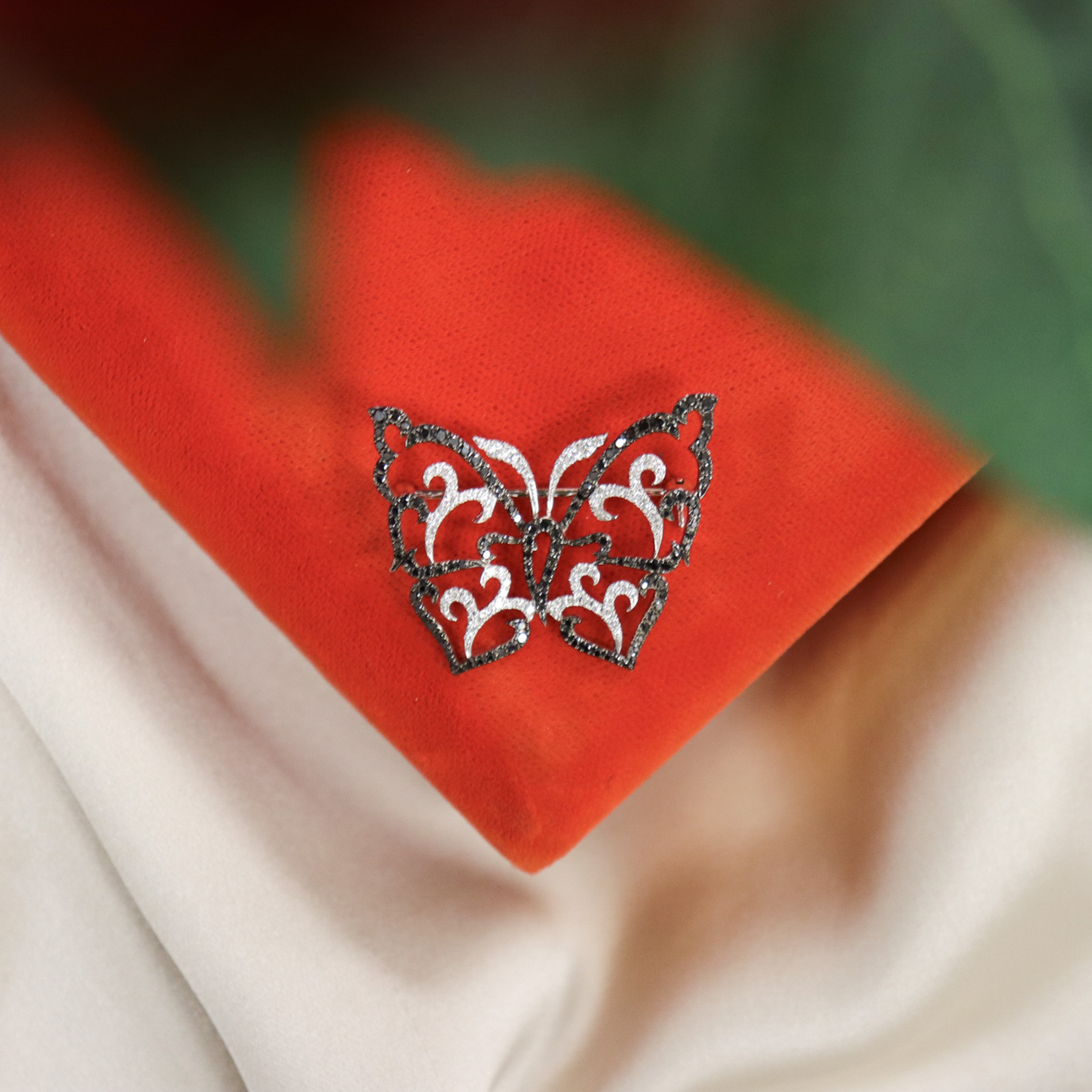A whimsical butterfly brooch, pave set with black & white diamonds. Don't be fooled by its delicate style, this substantially built brooch is a true treasure. Made by Birks, this timeless piece could add character to an everyday suit jacket or elegant sparkle to a cocktail dress.