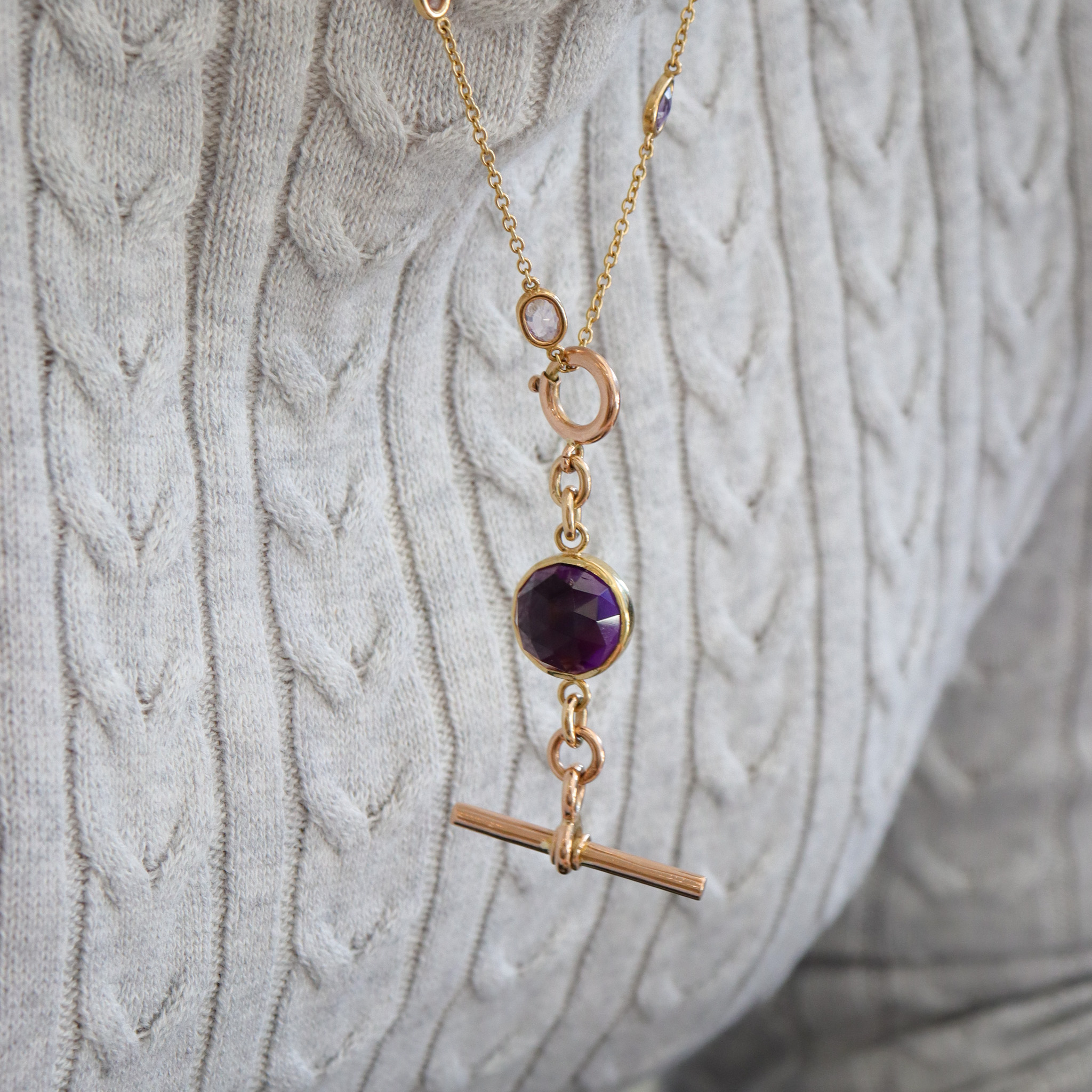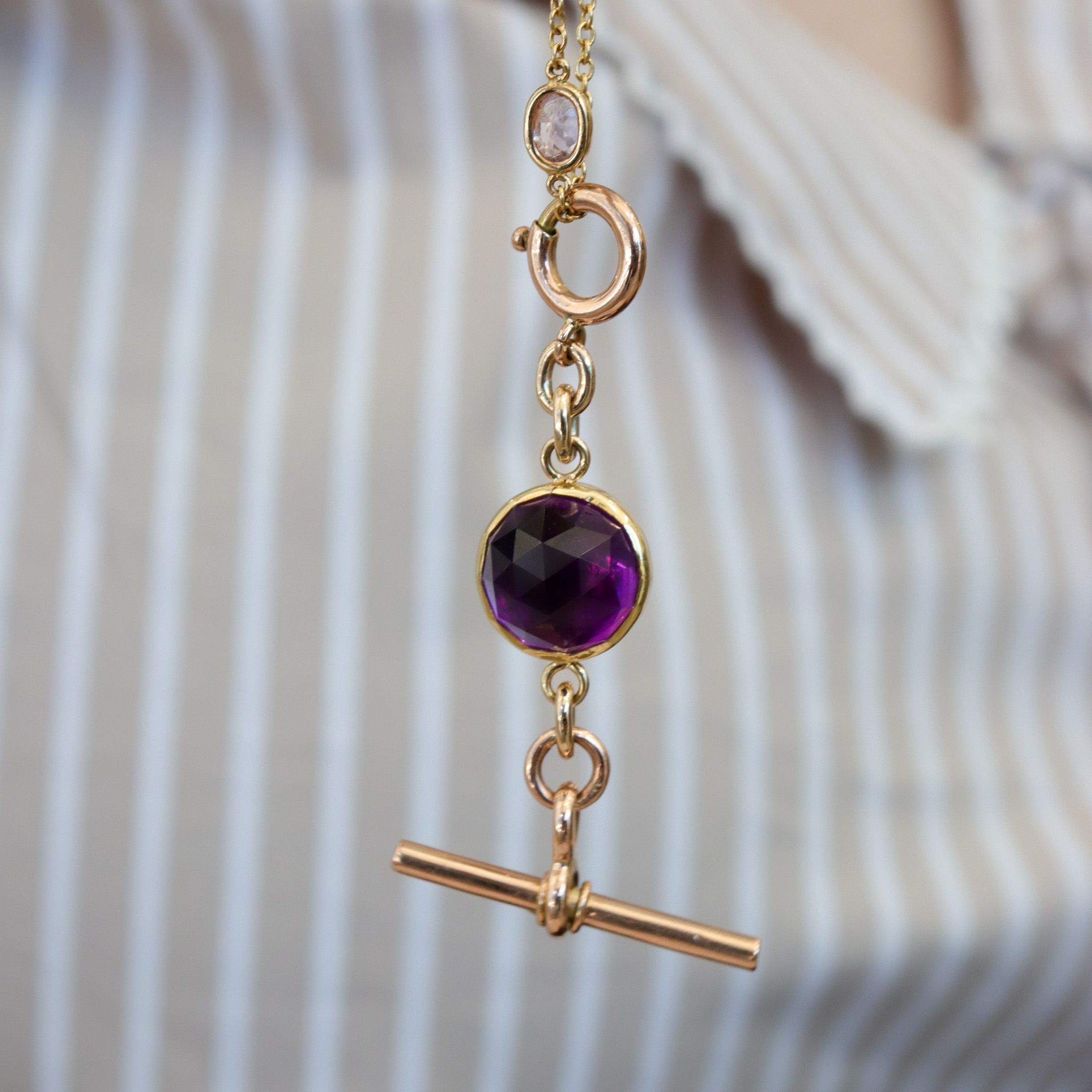 This juicy rose-cut amethyst sits in a buttery 18k yellow gold setting and is extended by a large 10k rosy-yellow gold antique spring ring and T-bar. A bold pop of colour and versatile addition to your collection; this can be used as a chain extender, pendant, bag charm - get creative with it!