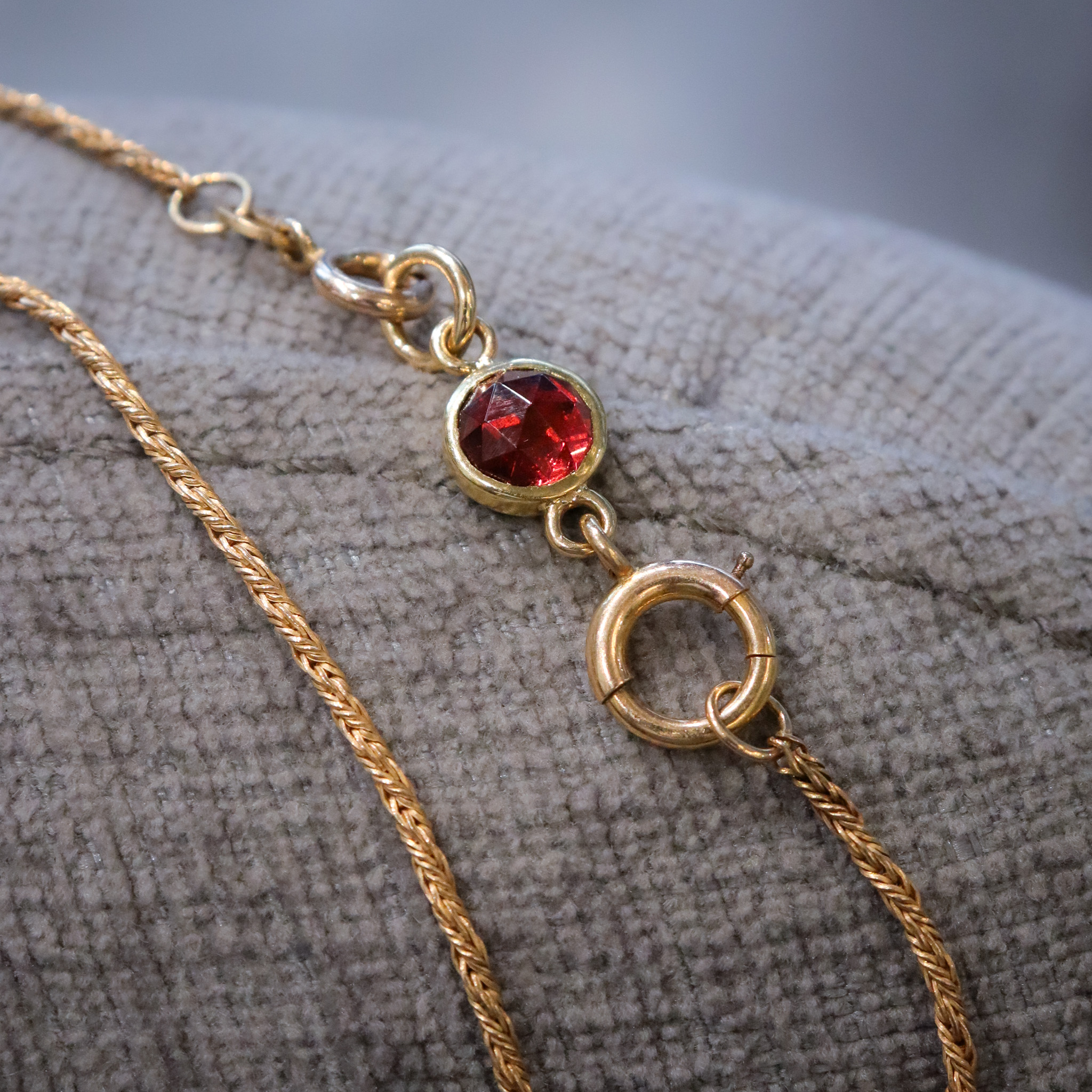 This warm rose-cut garnet sits in a buttery 18k yellow gold setting and is extended by a large 14k yellow gold antique spring ring. A versatile addition to your collection; this can be used as a chain extender, pendant, bag charm - get creative with it!