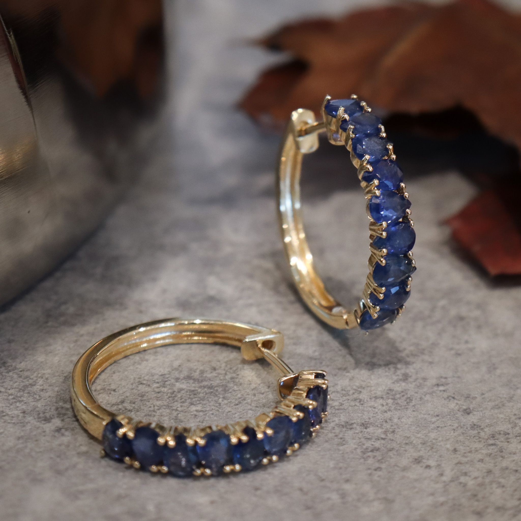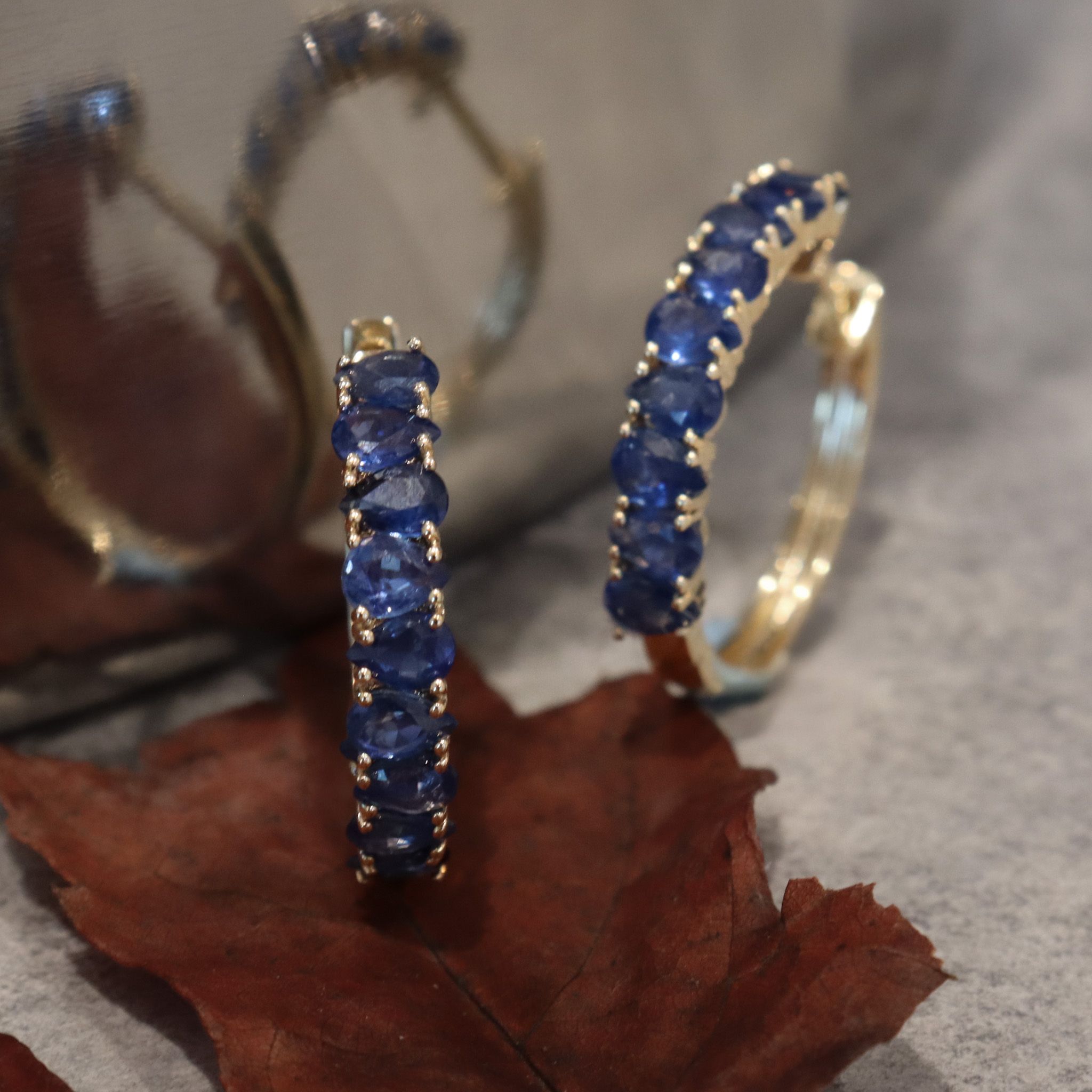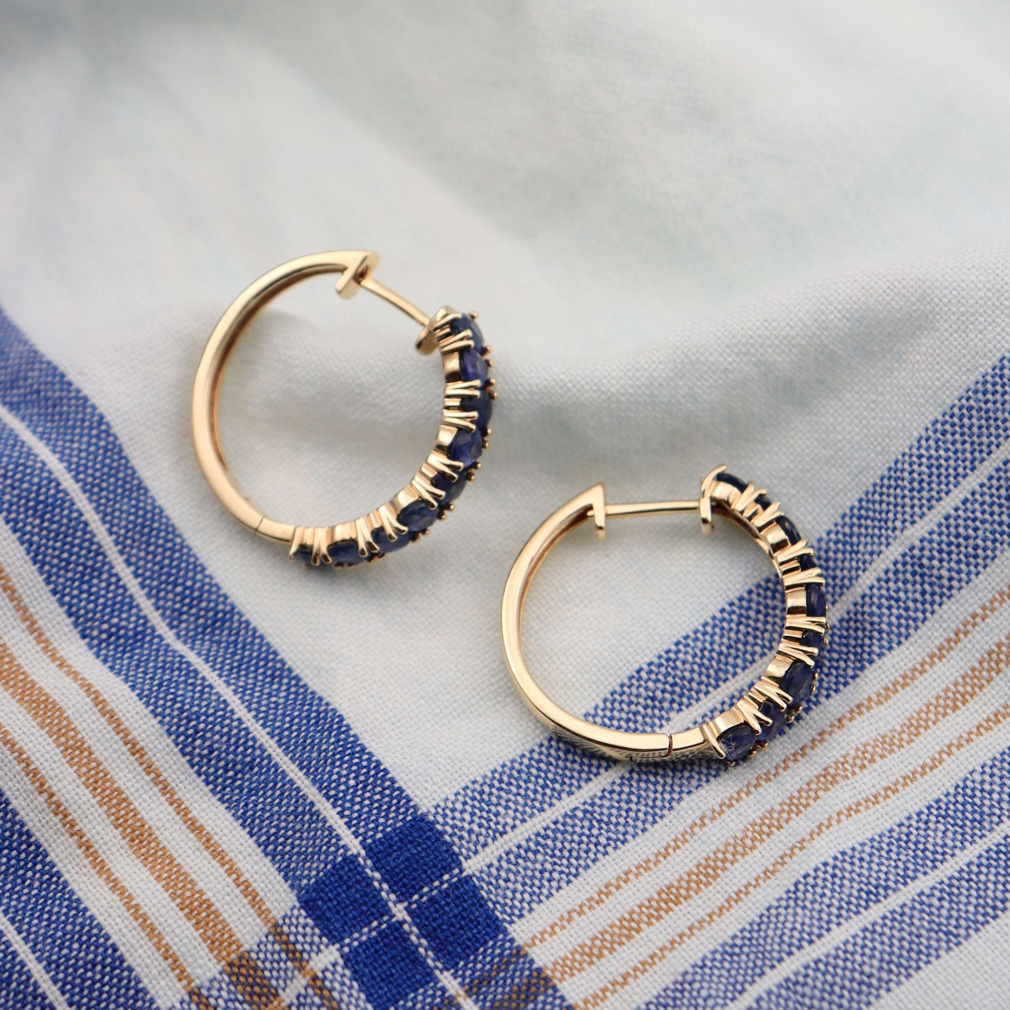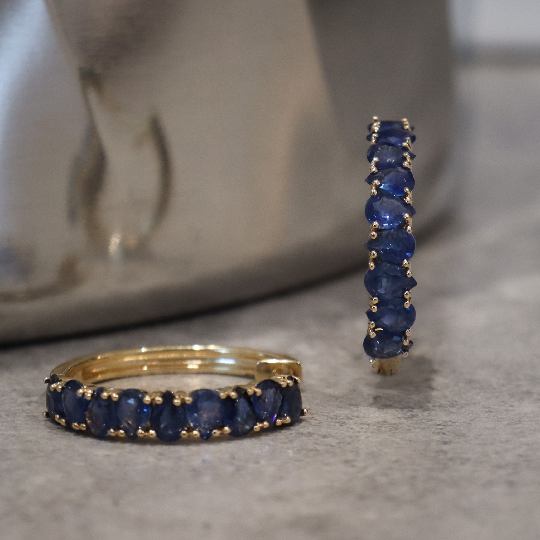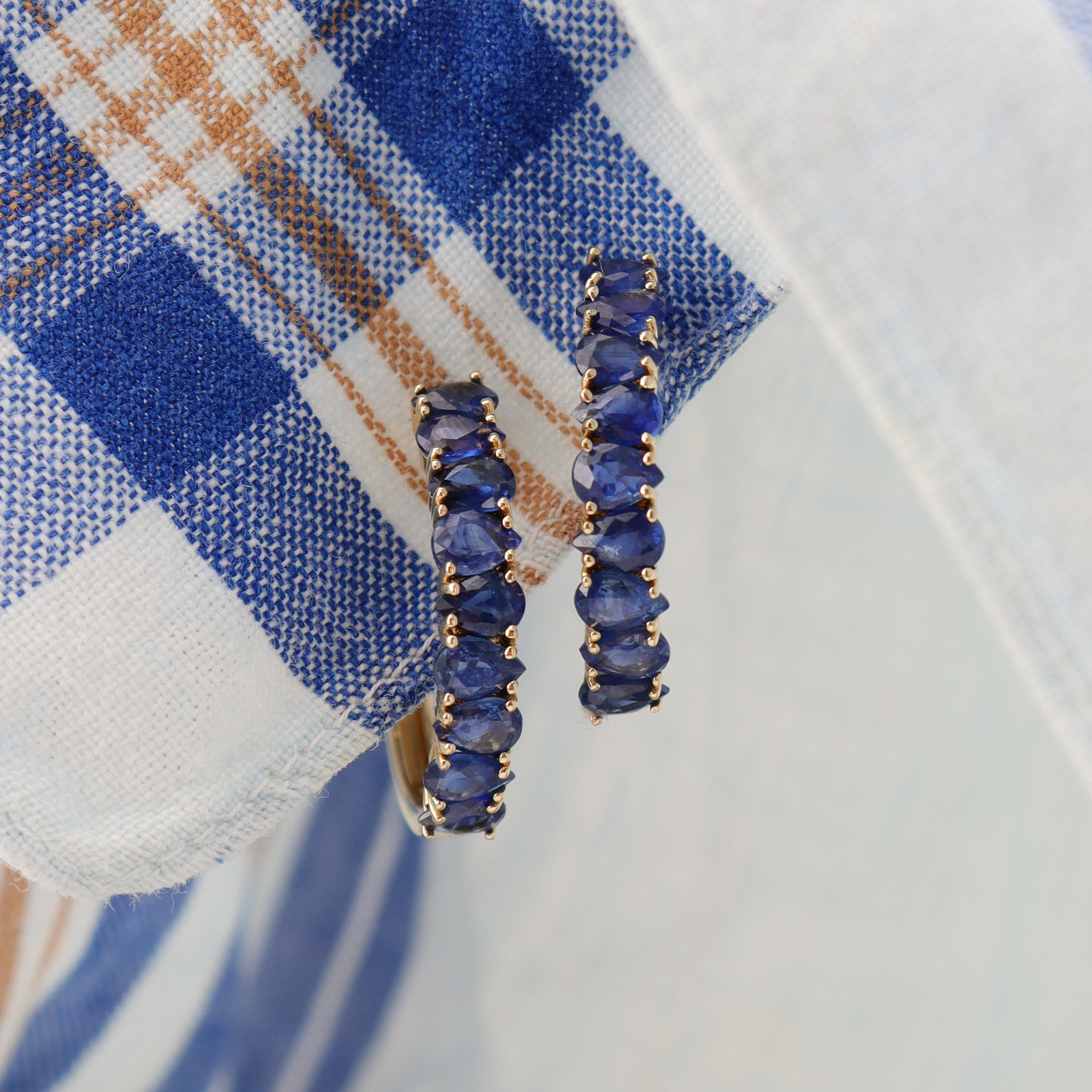 An alternating line-up of pear-shaped nearly-cornflower blue sapphires are a sophisticated and unique variation of a classic gemstone hoop.