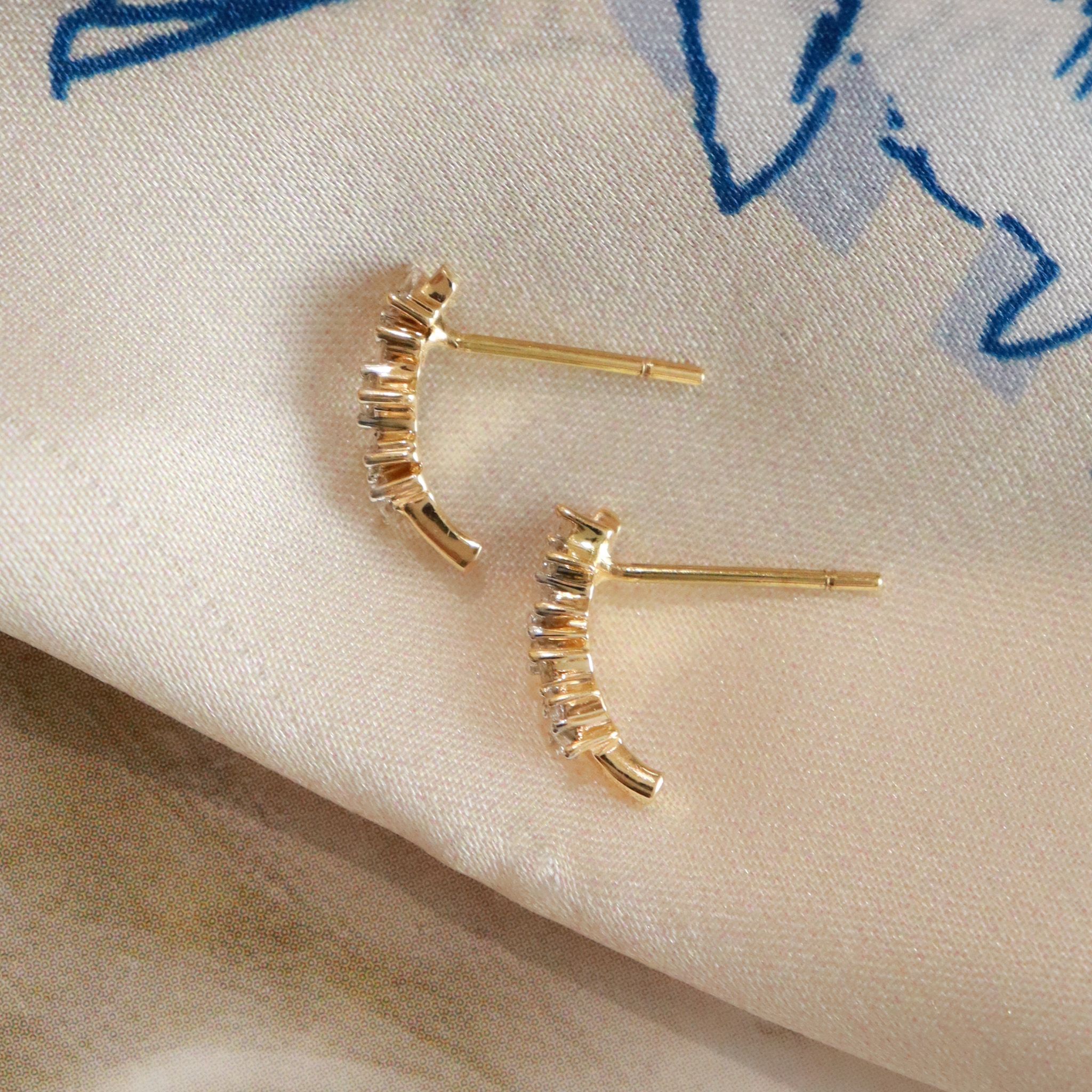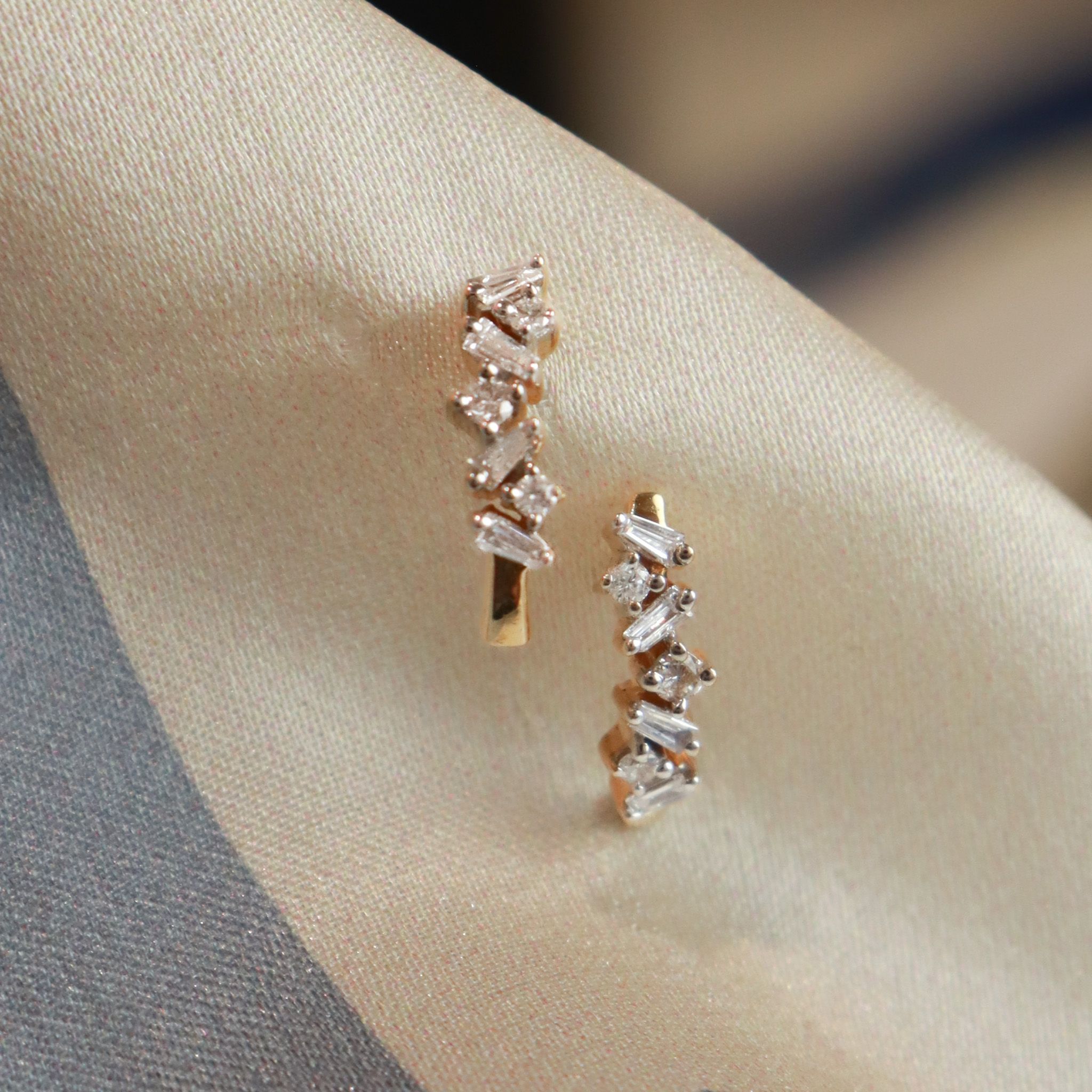 A playful arrangement of baguette & round brilliant cut diamonds, set in a solid pair of J shaped earrings.