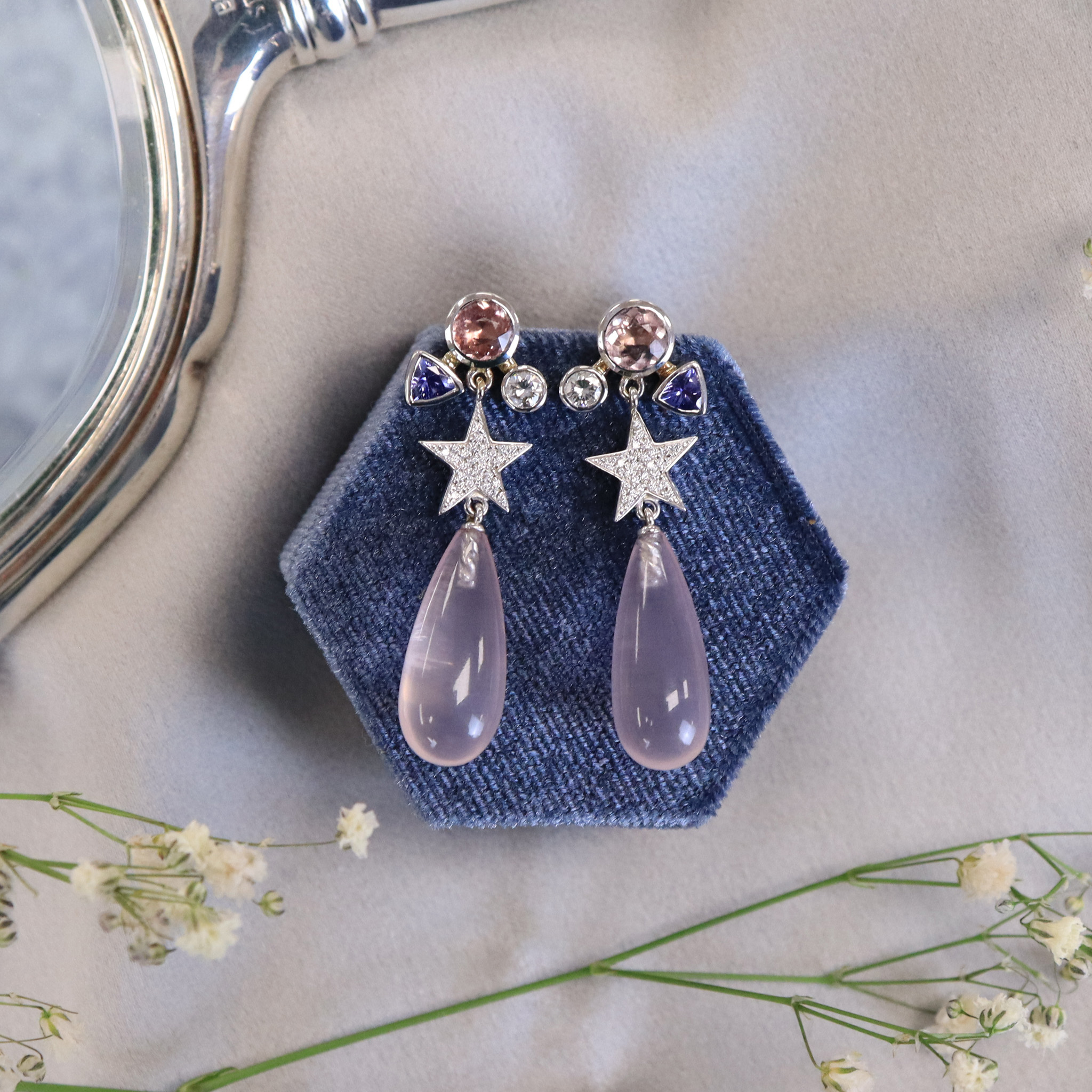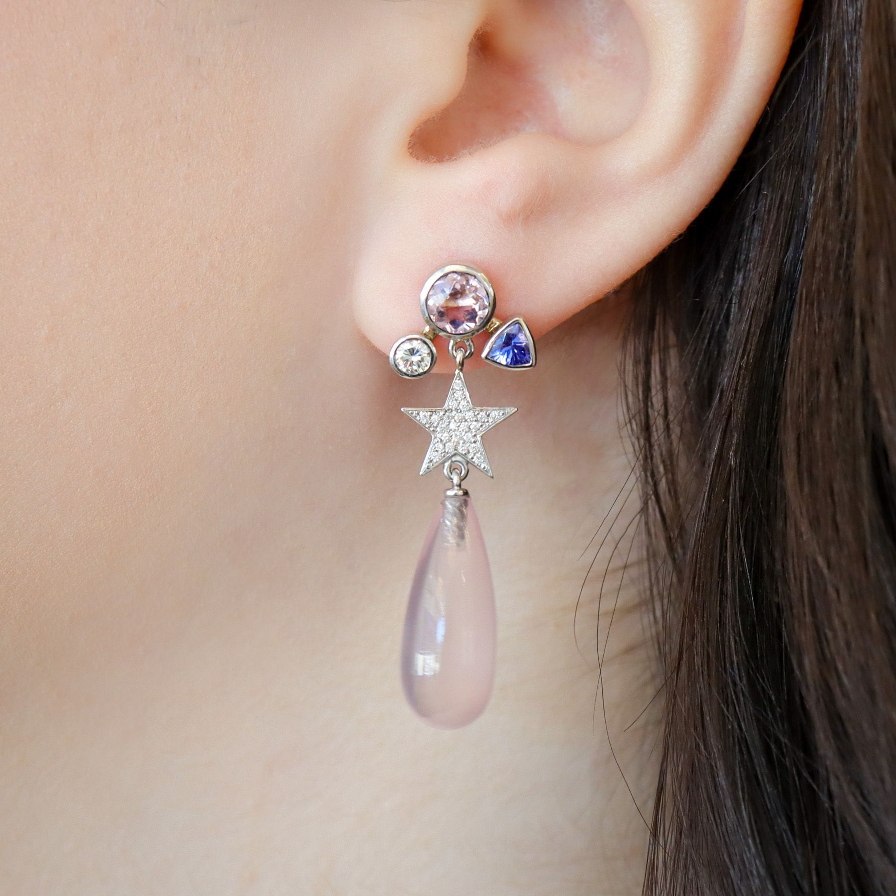 Tourmaline, Tanzanite, Diamond & Rose Quartz make a soft and feminine but eye catching pair of dangle earrings. The mix of faceted & carved gemstones give a refreshing style to an elegant drop. One of a kind, in our limited time celestial line, these star set beauties will make you sparkle.