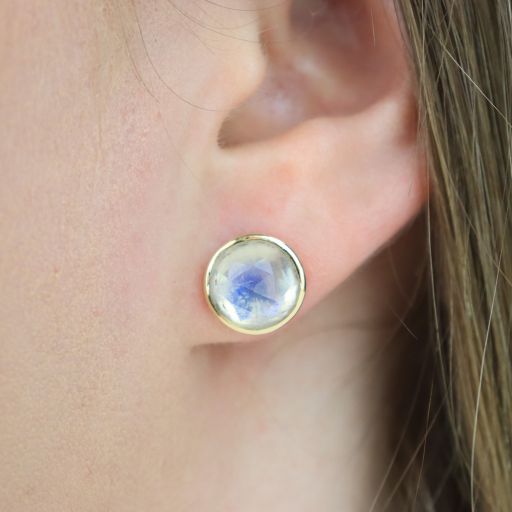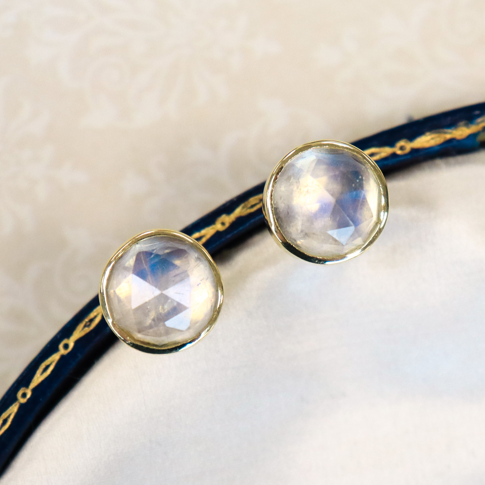 Flashes of blue give a soft colour to these 18ky Rose Cut Moonstone earrings, built in-house by our goldsmiths. These earrings are simple and easily wearable with any outfit.