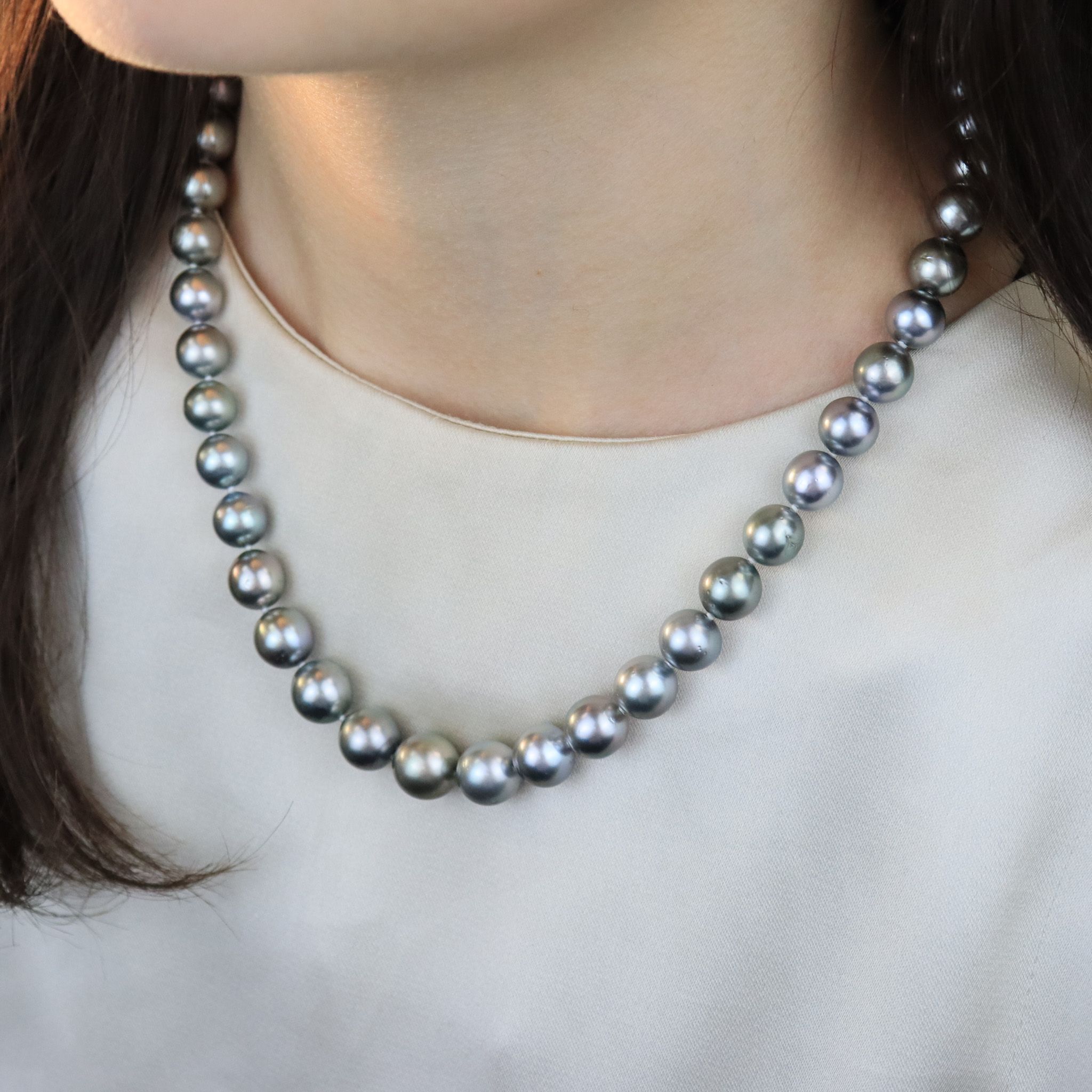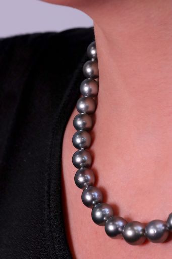 Silvery-black pearls drape across the neck with this Black Tahitian strand. 18 inches in length with a 14k rose gold clasp, this is a versatile piece to wear for generations.