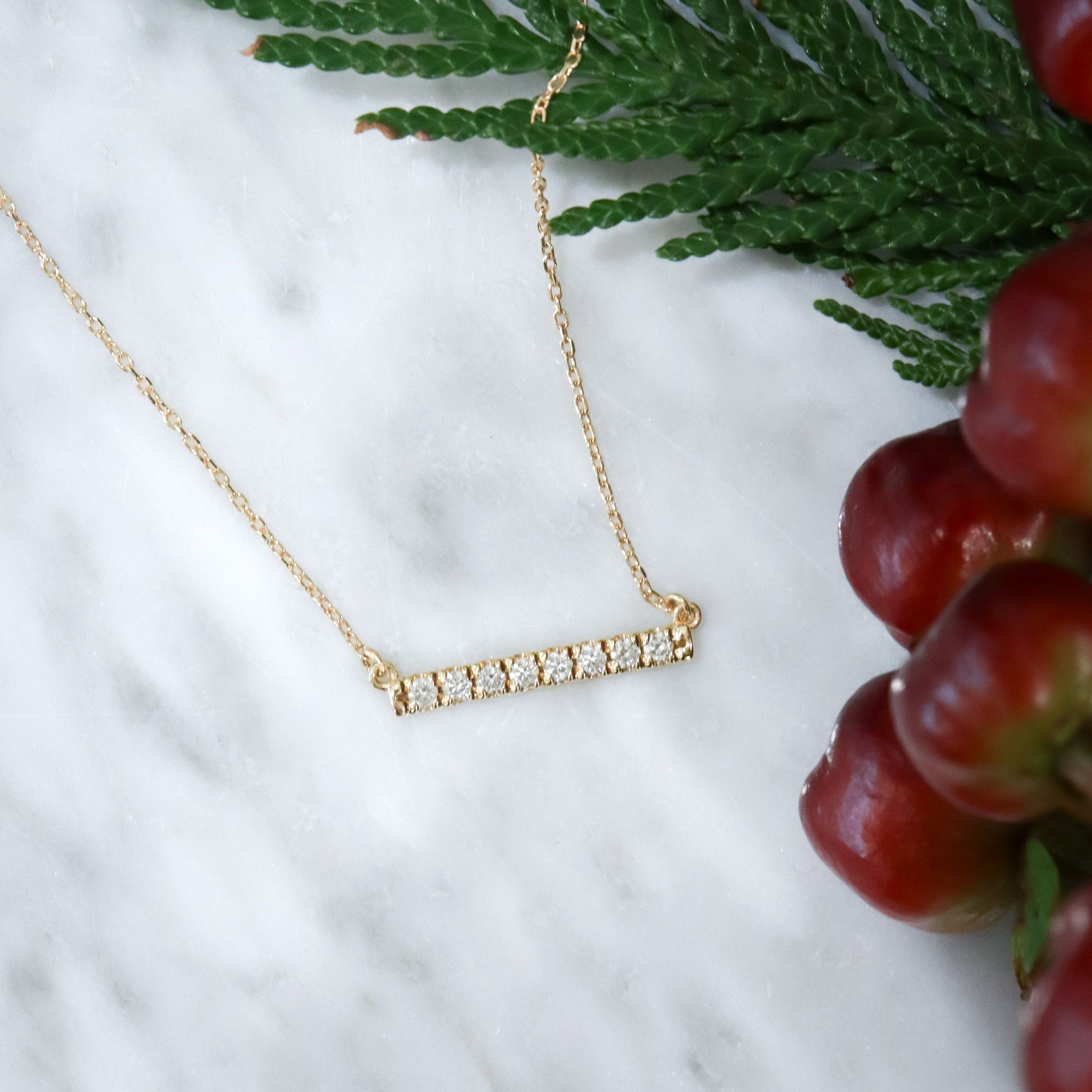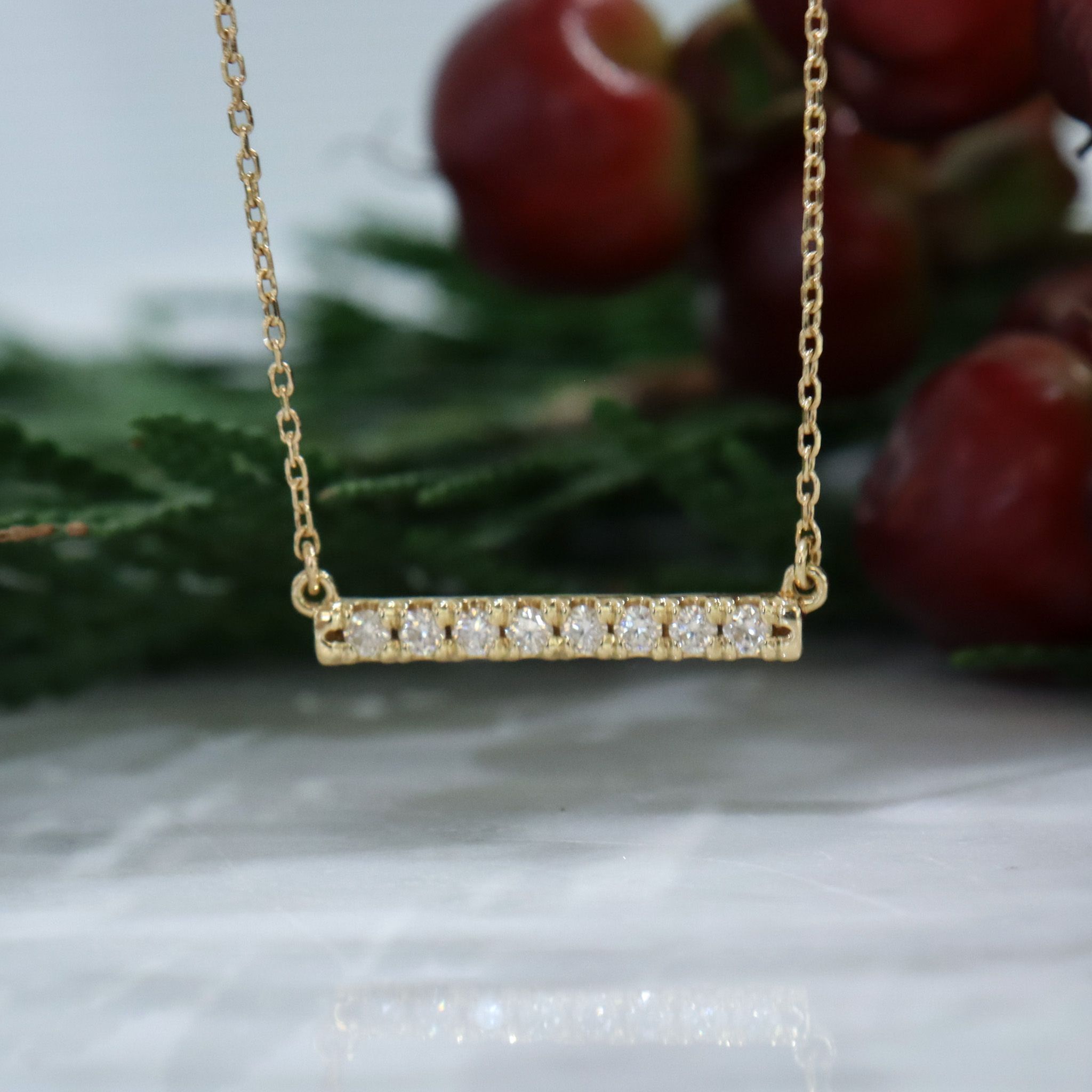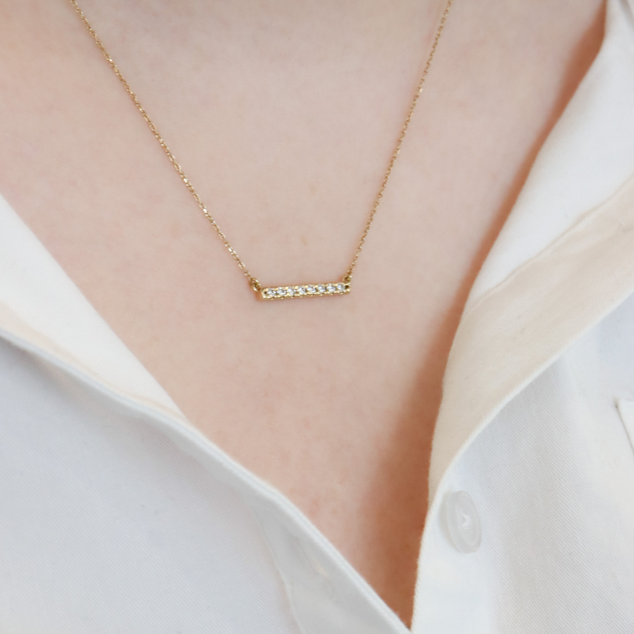 One of those modern designs that are destined to be a classic design years from now. This French-set diamond bar necklace is an easy wear, with a sparkling fine cable link chain for a delicate look and feel. Wearable at 16 inches or 18 inches; you can wear this piece on its own or layered with other pieces.