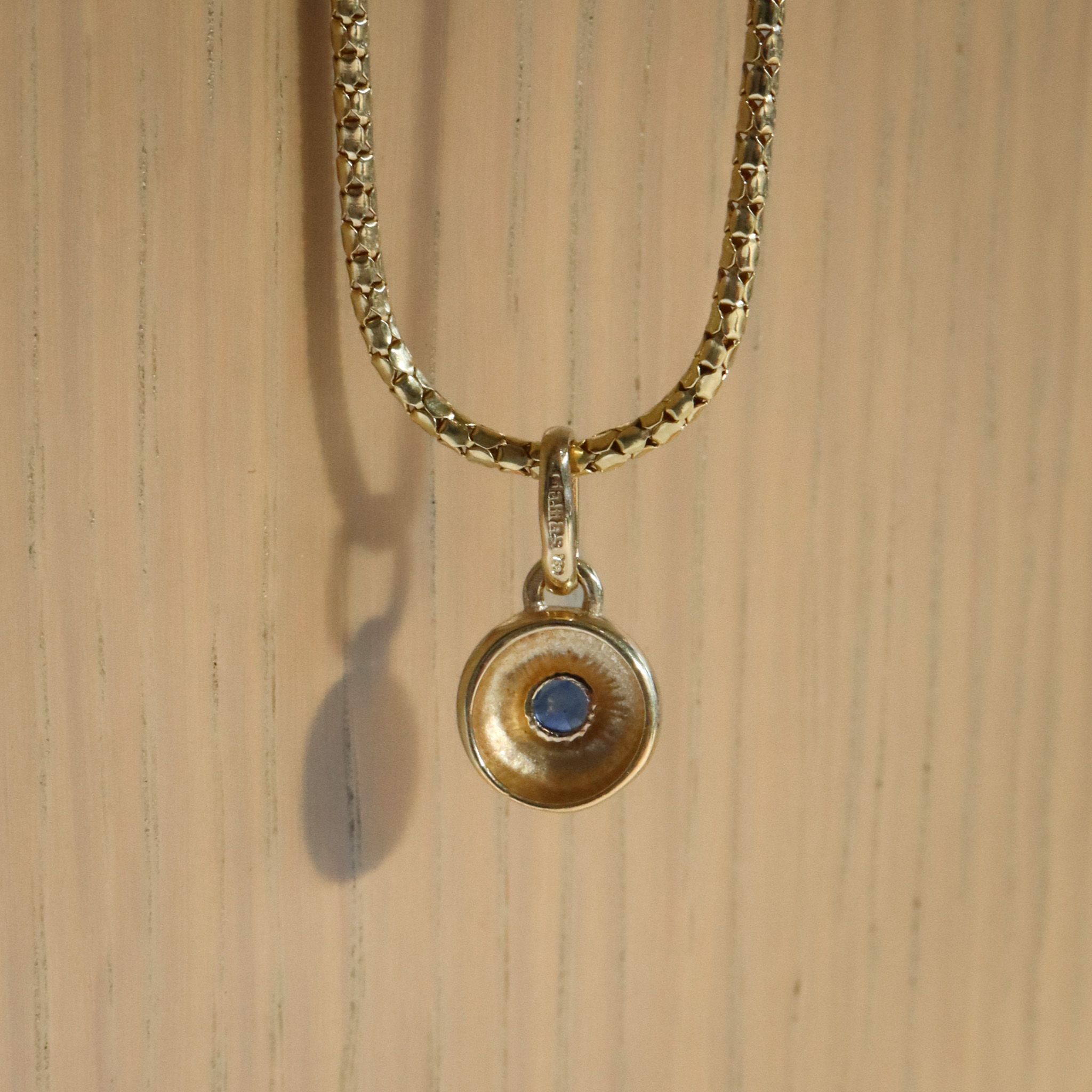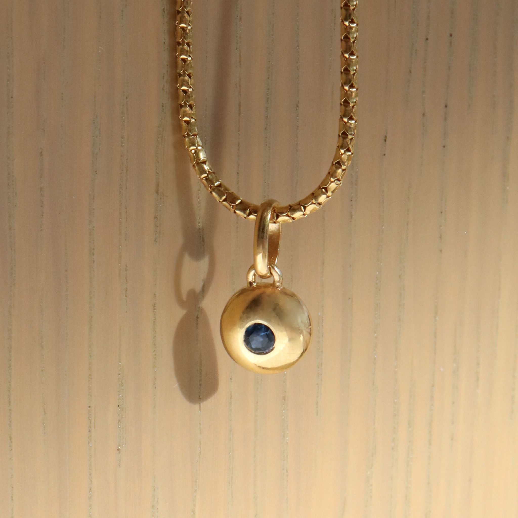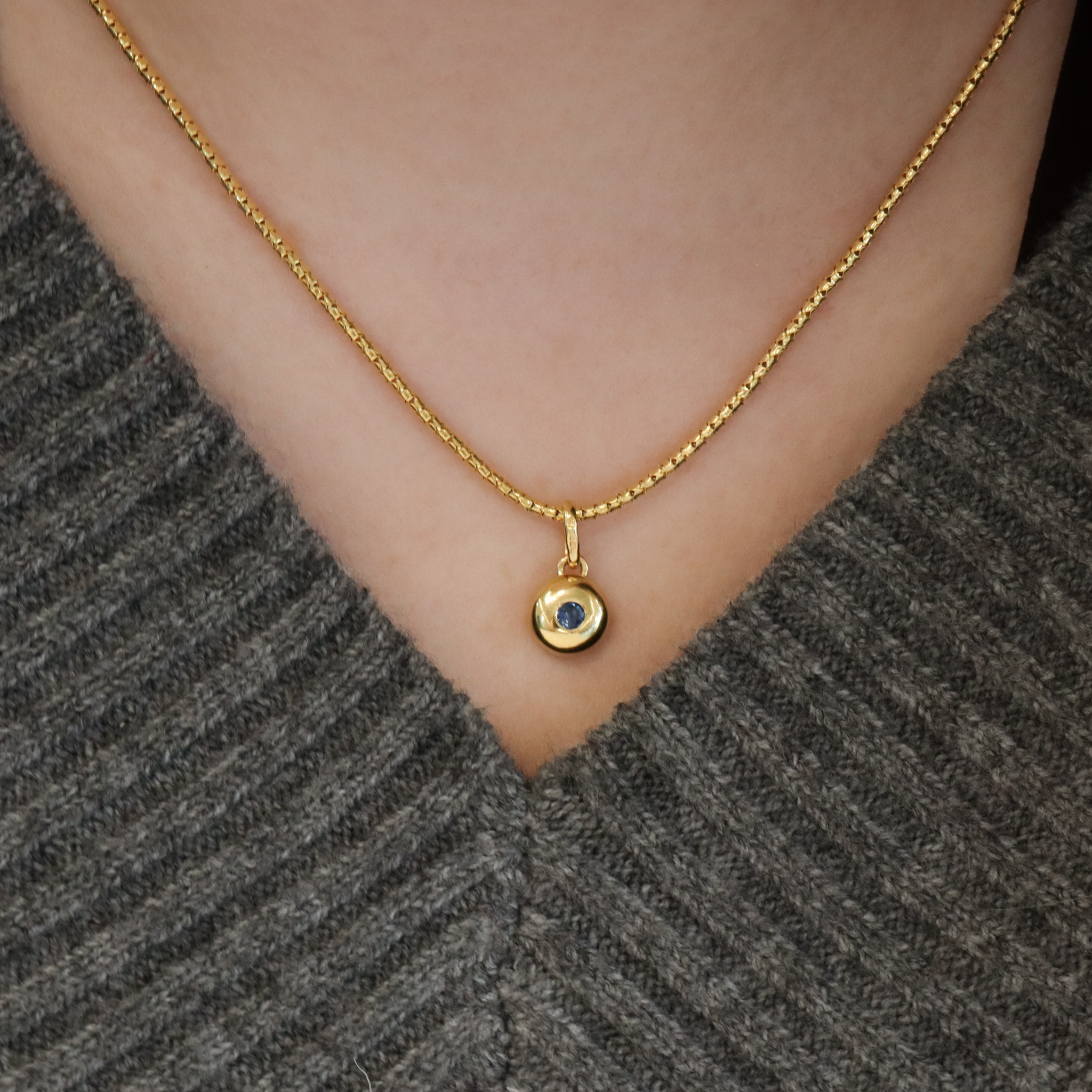 A charming blue sapphire is nestled in a puffy yellow gold domed setting, delicately accenting the unique fancy chain it's strung on.