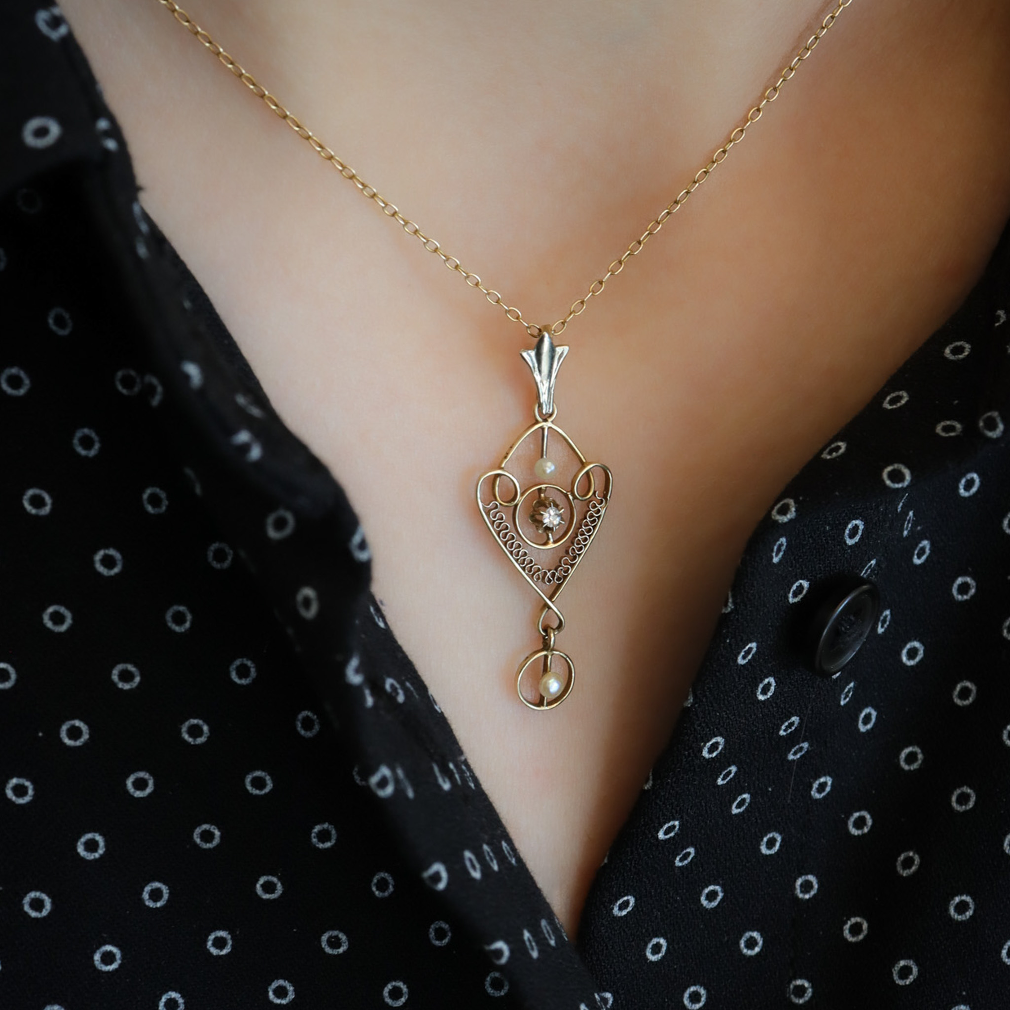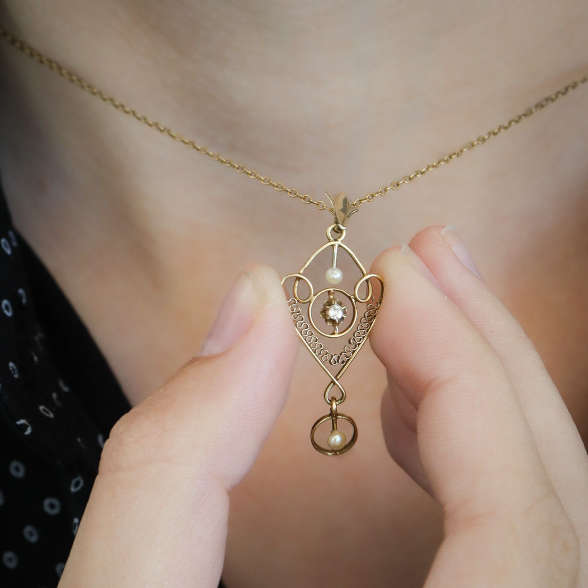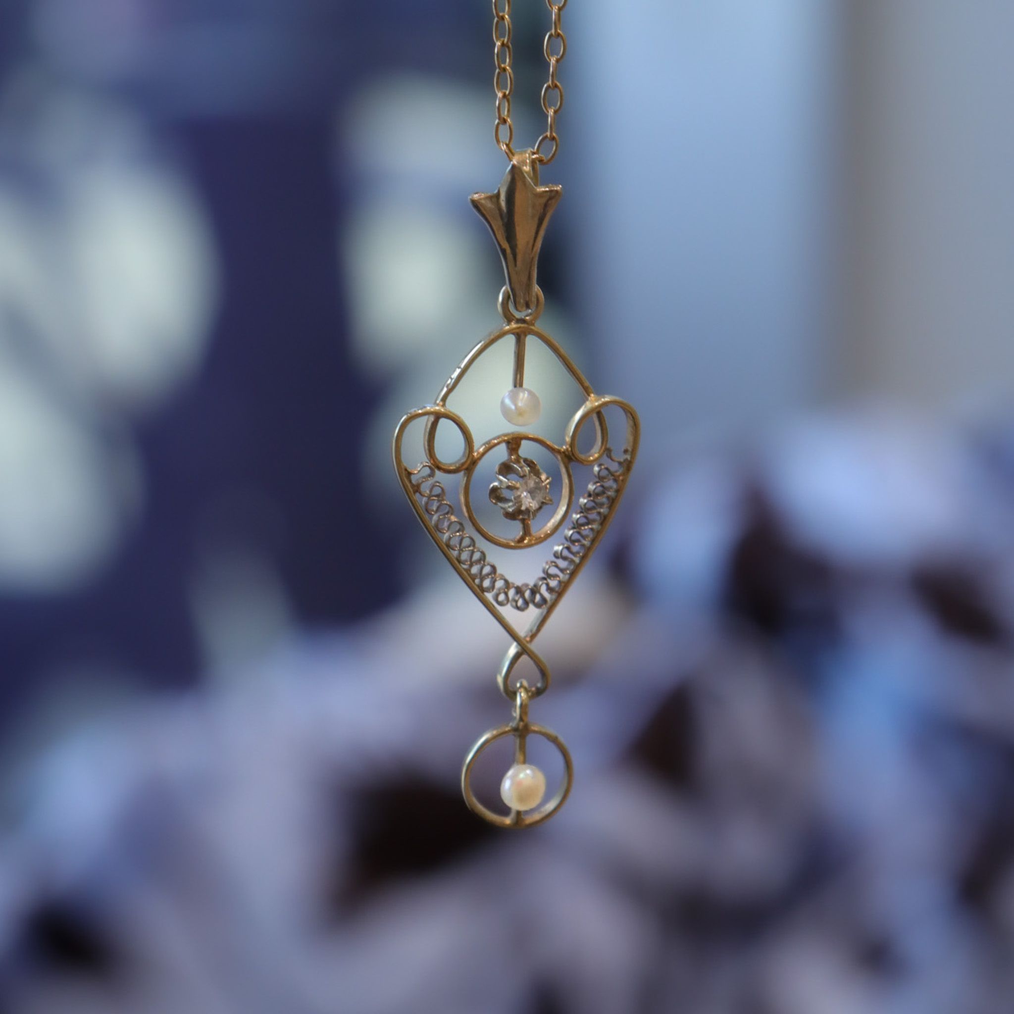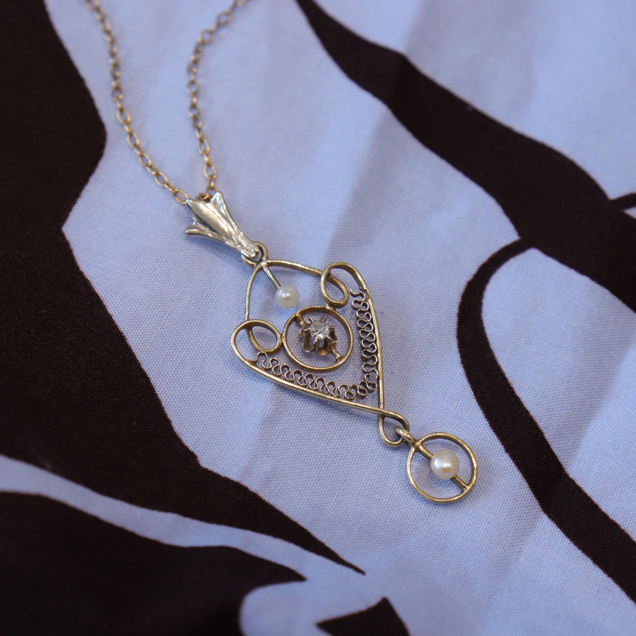 This delicate Edwardian necklace is adorned with 2 seed pearls and a diamond, all accented by swirling 14k gold.