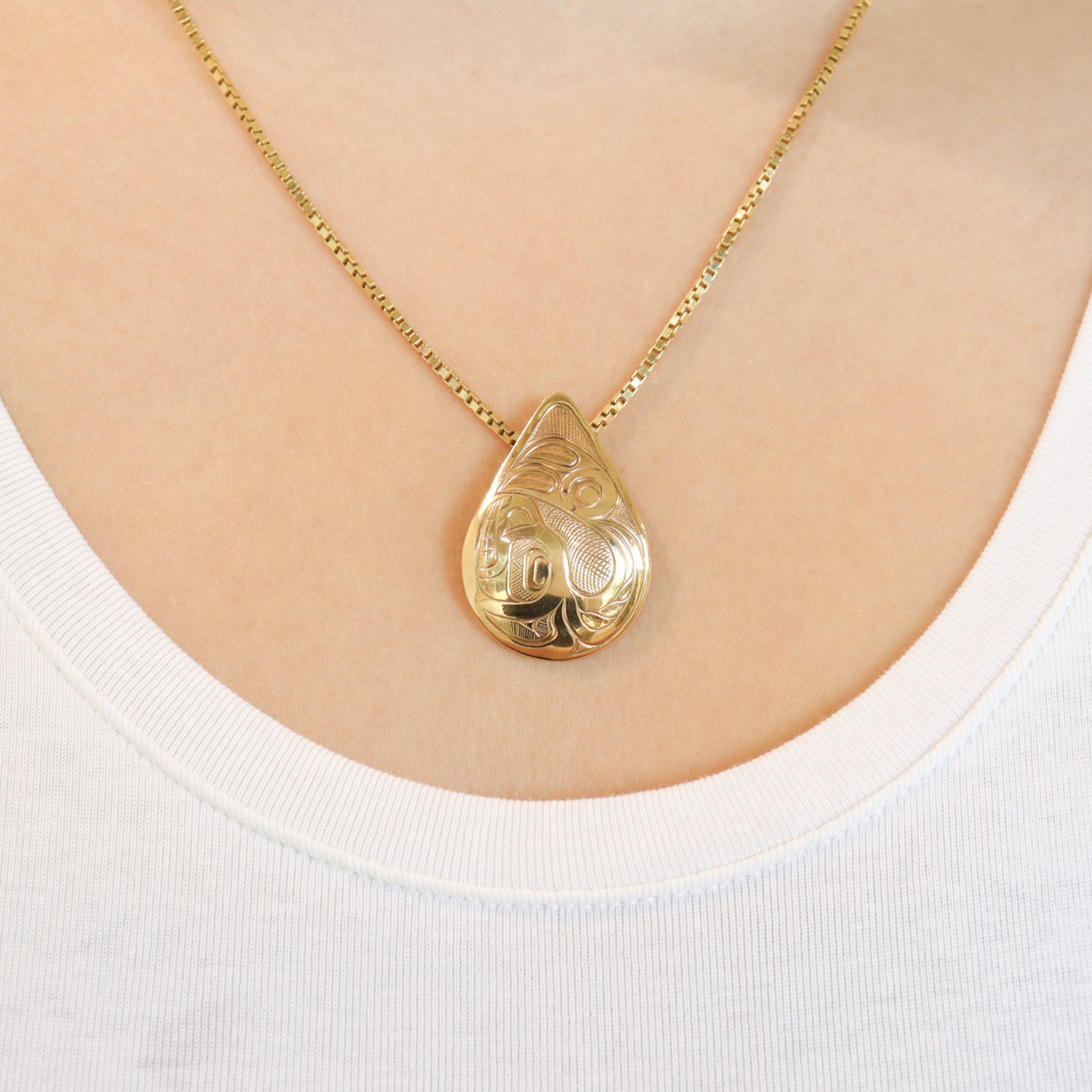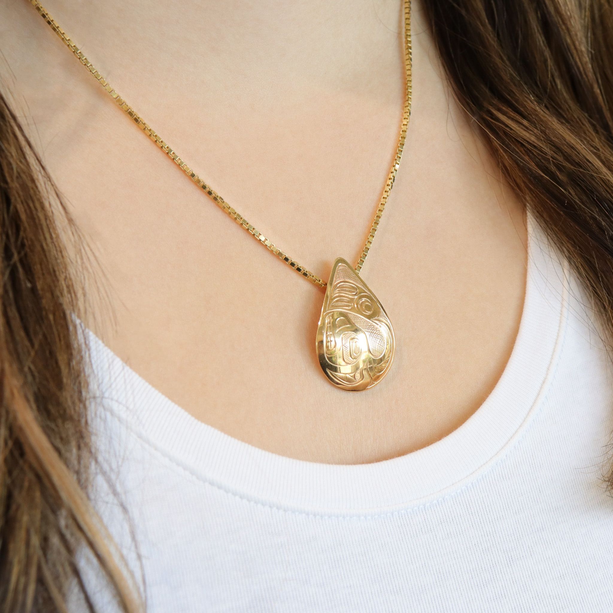 This signed 14ky necklace showcases the distinct style of the renowned Indigenous artist Joe Jack. Highly sought after, he creates stunning animal motifs in a traditional west coast Indigenous style. Joe Jacks art is a wonderful display the enriched heritage & diverse culture of Canada.