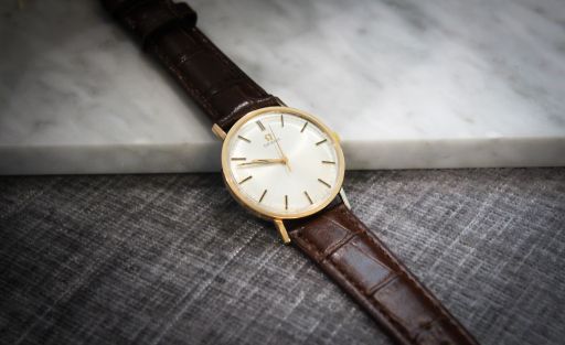 14k gold omega watch, circa 1960's. A chic & timeless design for a dress or everyday watch. The watch contains an original 601 Omega Movement in good working order. Comes with a brown leather strap.