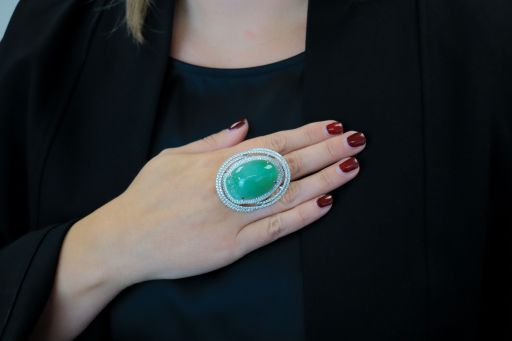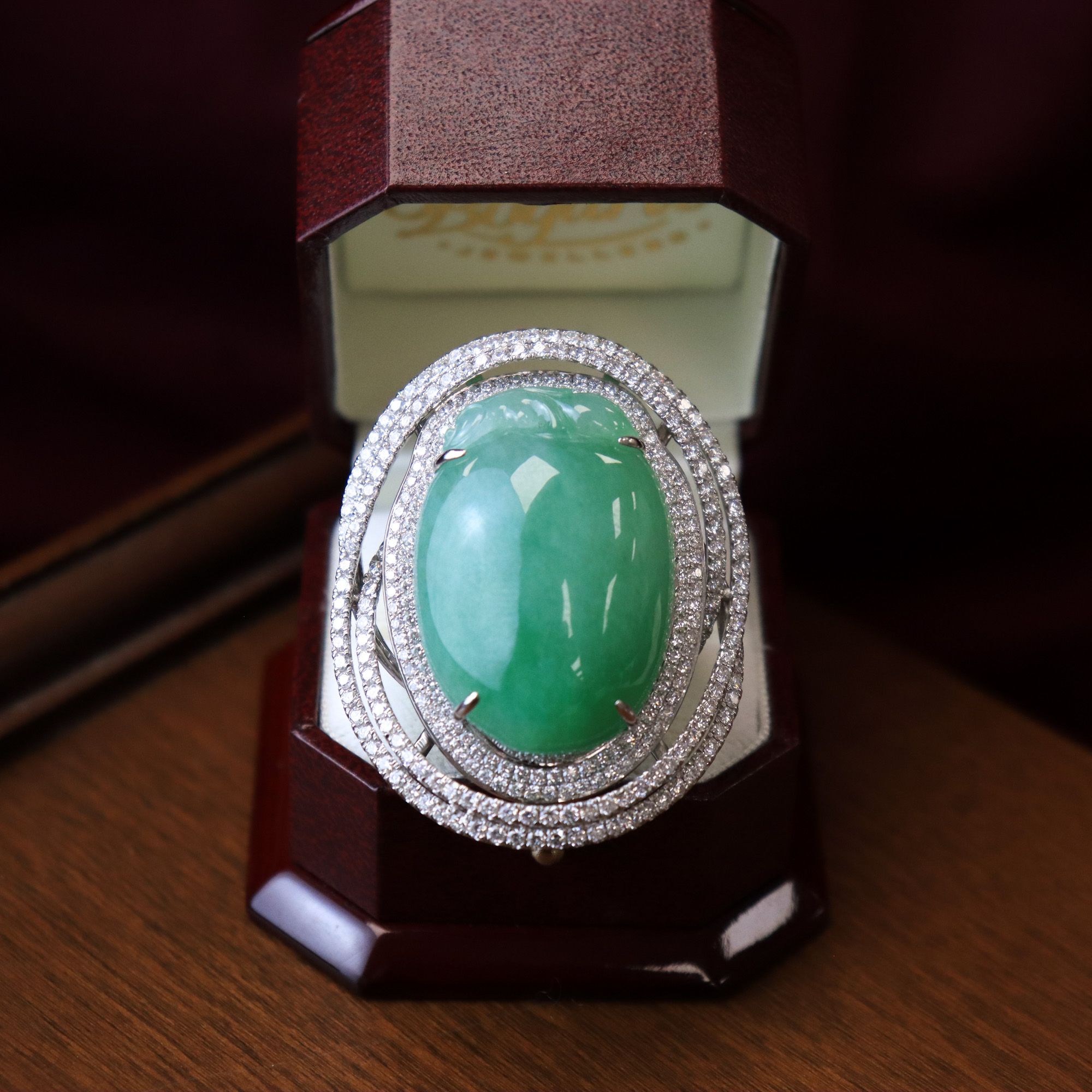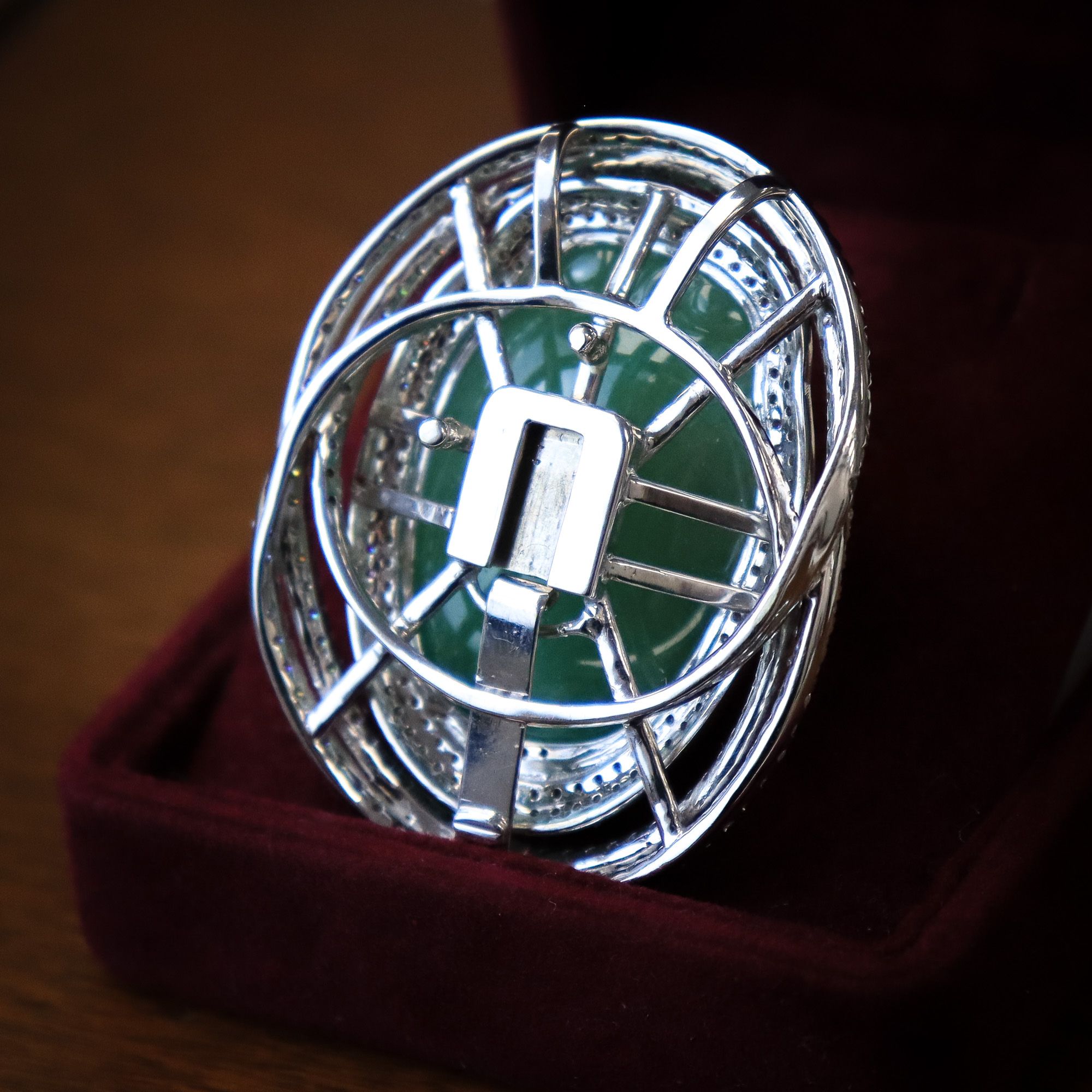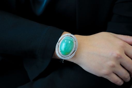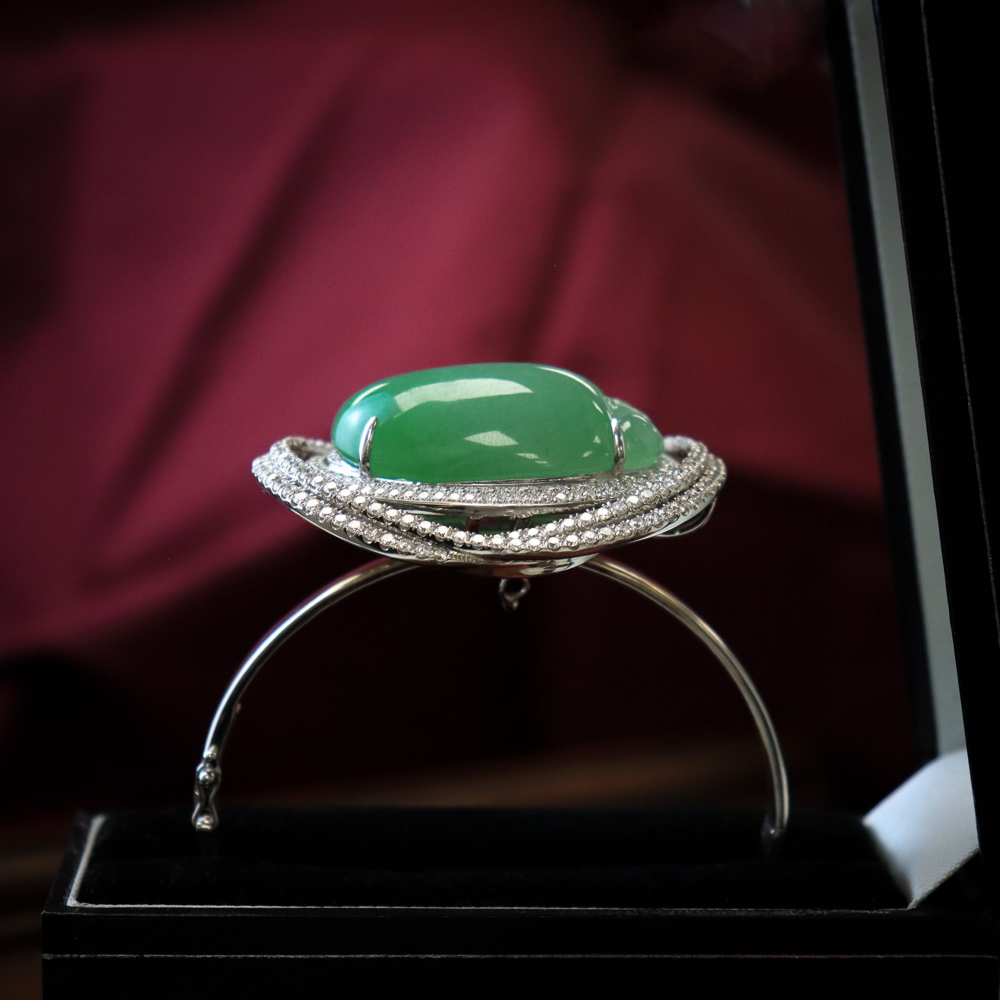 An entire suite of jewellery in one! This diamond encrusted Jade pendant transforms into 3 pieces of jewellery. In the centre of the pendant is a large carving of a peach surrounded by ribbons of round brilliant cut diamonds. Fabricated with an adaptive closure, this pendant can be affixed to a ring or bracelet. Massive in scale, this unique piece makes a luxurious statement any way you choose to wear it!