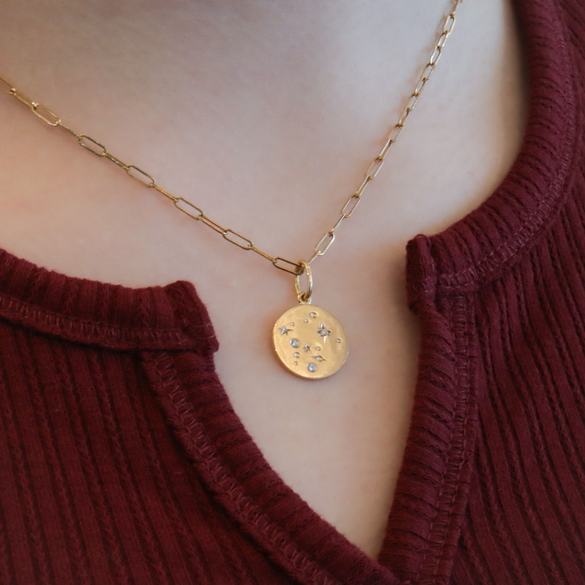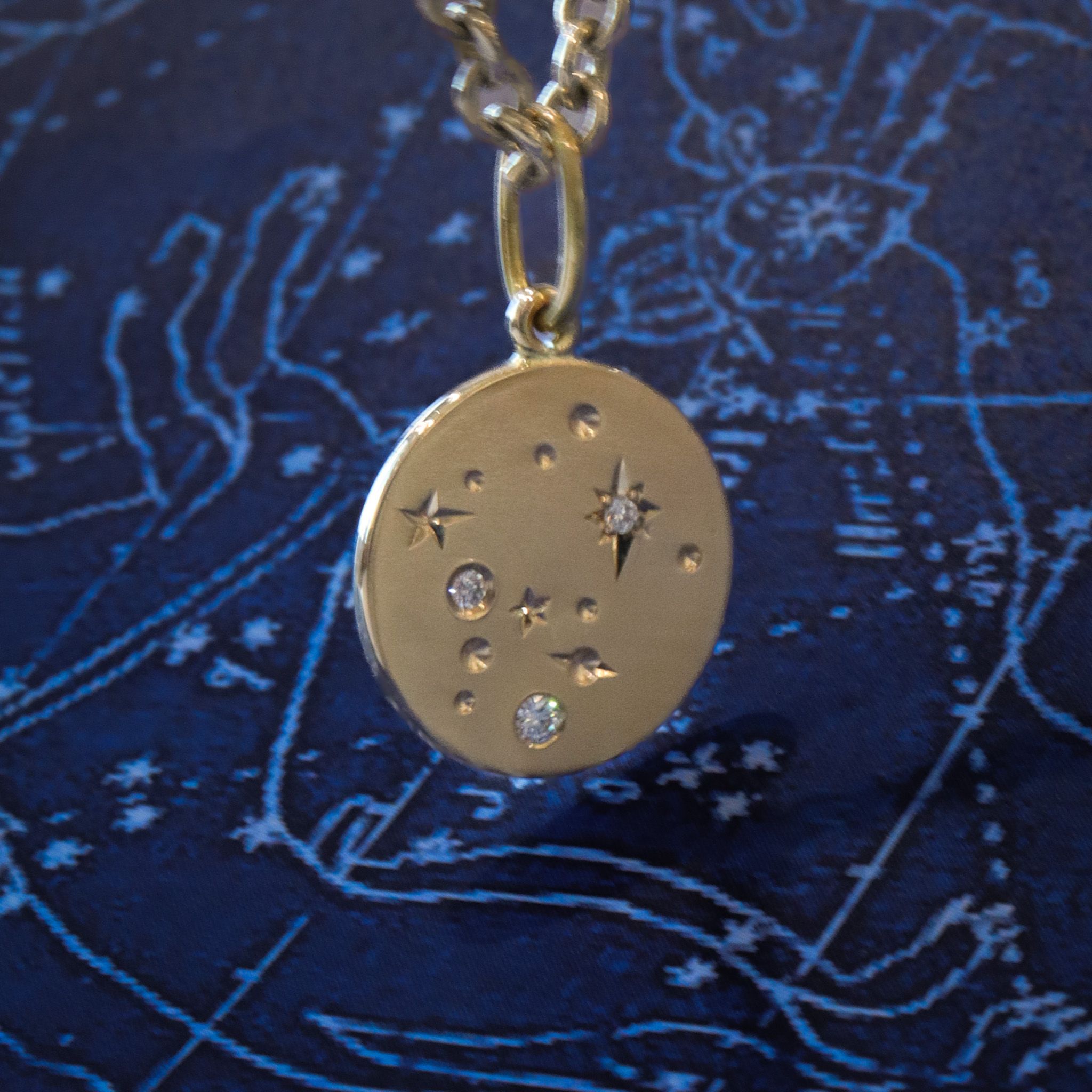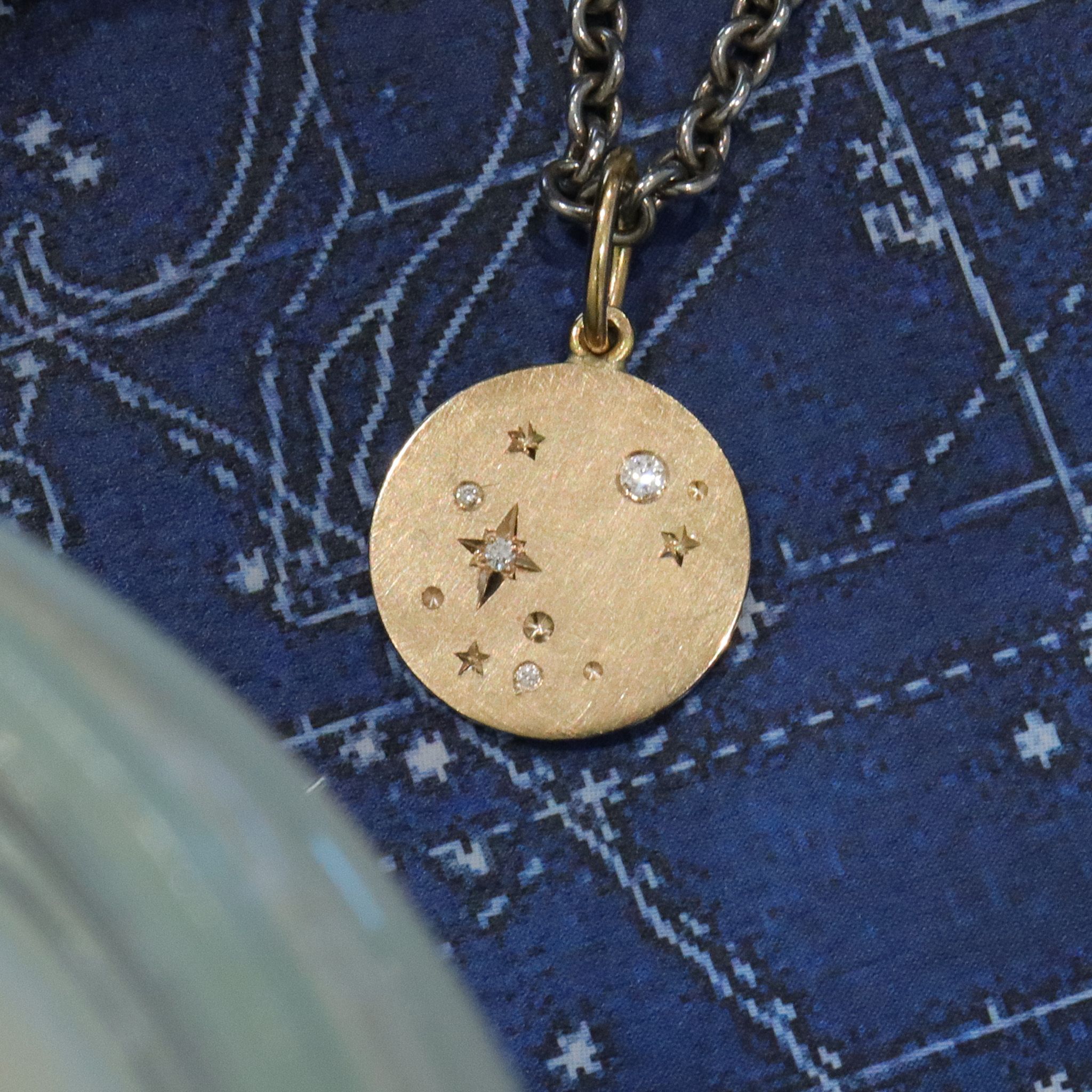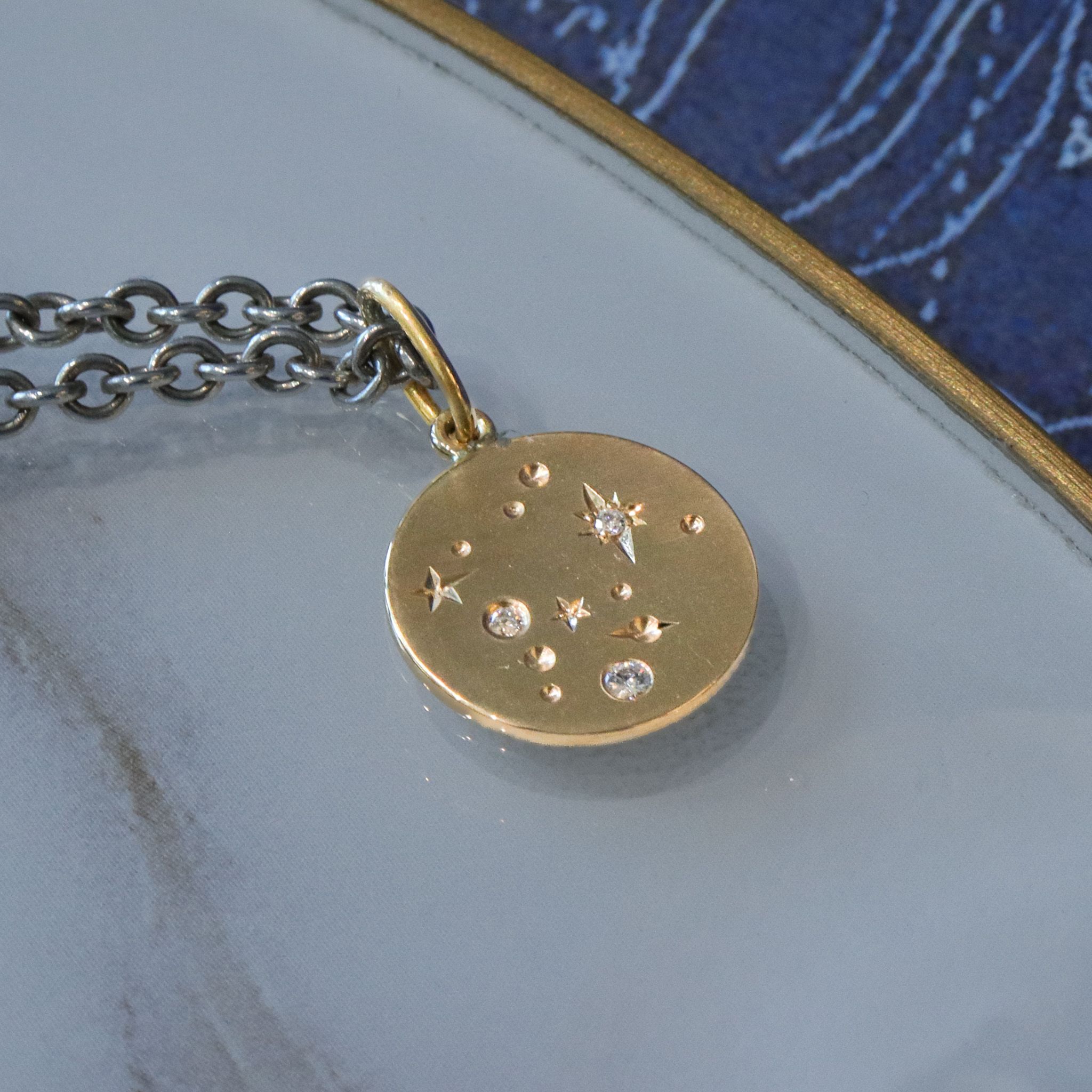 Two whimsical gold disks, embedded with diamonds and stars. Part of our Celestial collection.