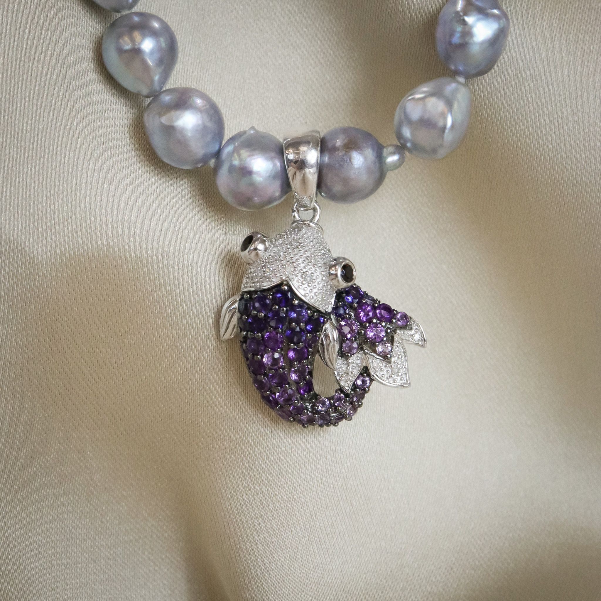 Fun and whimsical, this sterling fish can be worn as both a pendant or a pearl enhancer. The multi-stone gradient and garnet eyes makes this little guy pop!