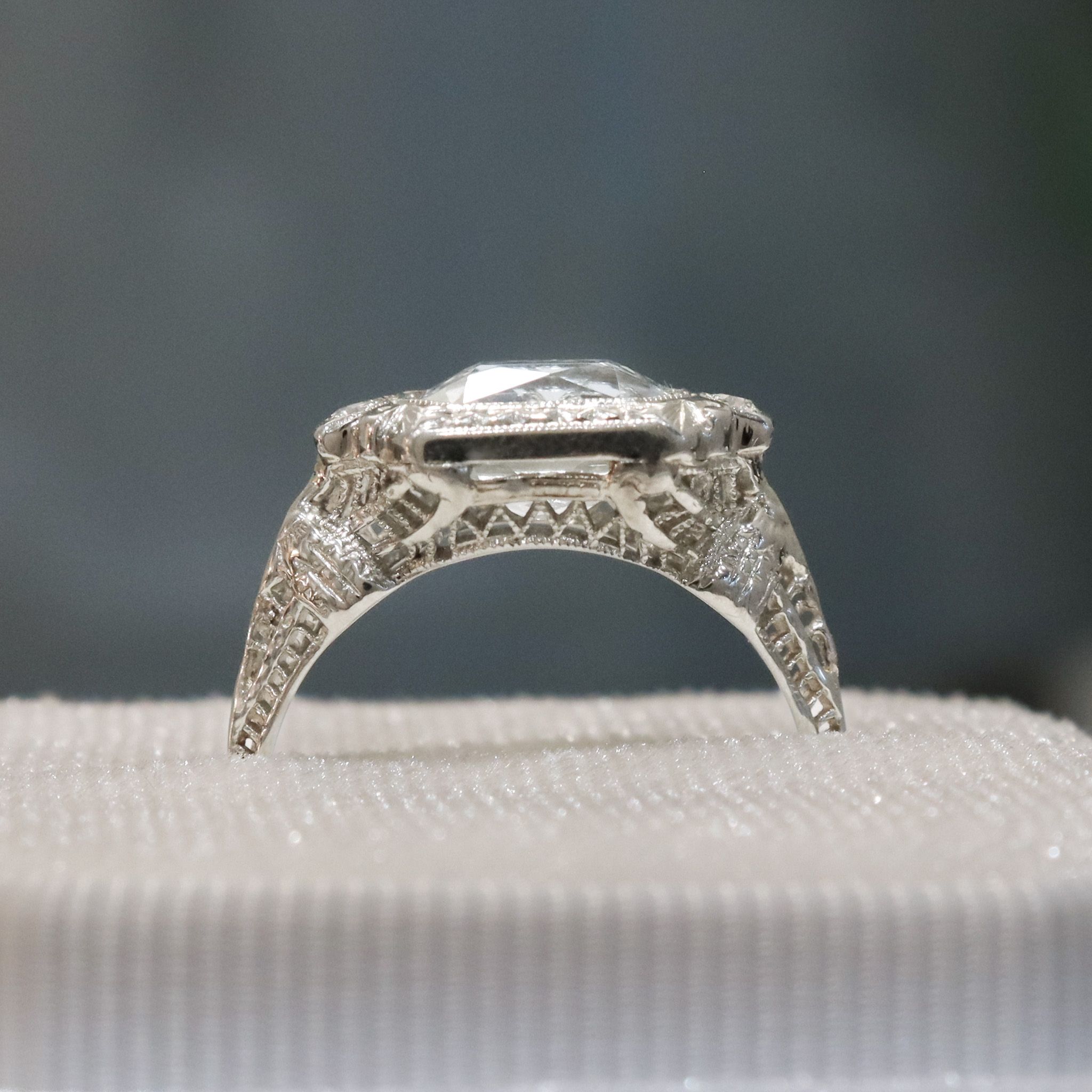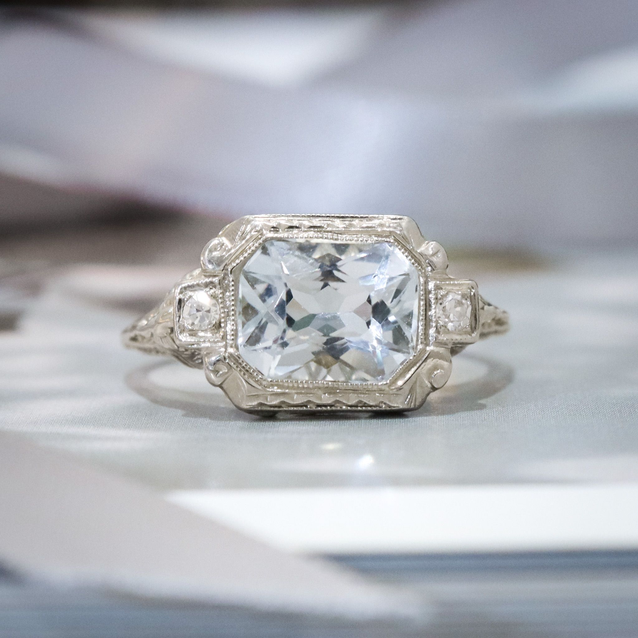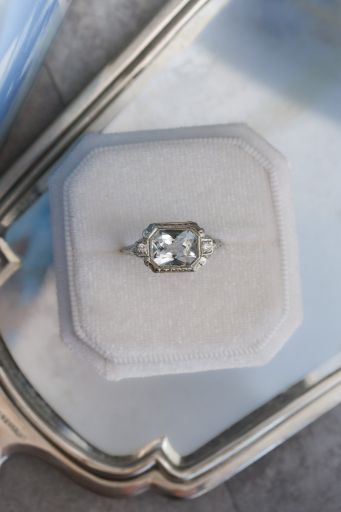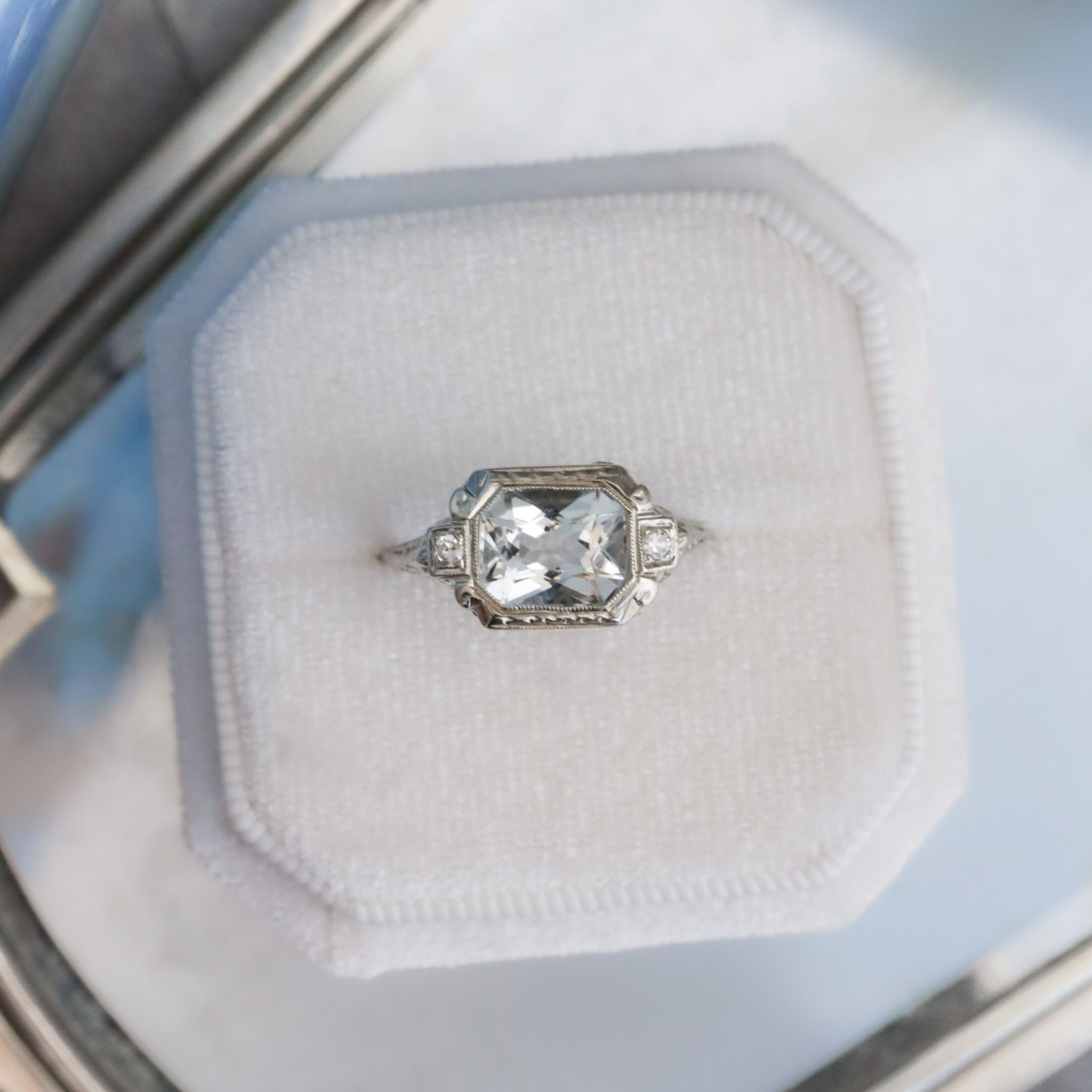 Long and layered pearl necklaces were in high demand, especially with intricate, gemstone-embellished clasps to be worn in the front. Onyx, diamond, aquamarine, and ruby were the key stones of the 20s, typically used as a clean contrast to the detail of the gold. After the creation of 18k white gold, it was often combined with platinum after the First World War. The sturdiness of platinum meant safe gem coverage, while the white gold was much more affordable. Rings often had white gold bands, with a platinum setting for the stone.