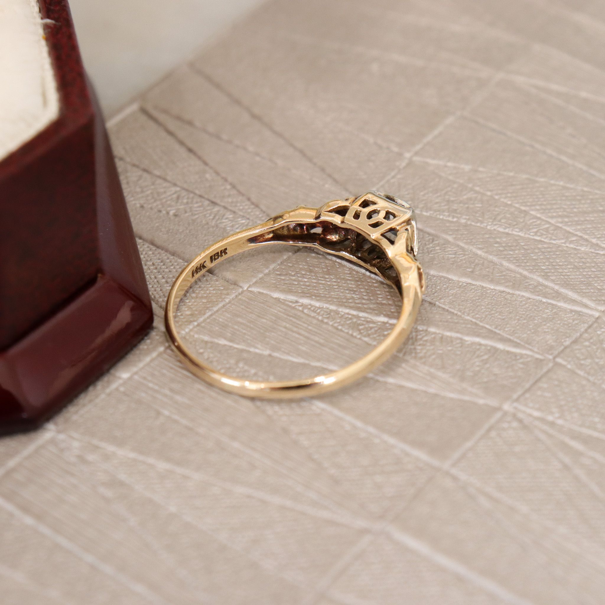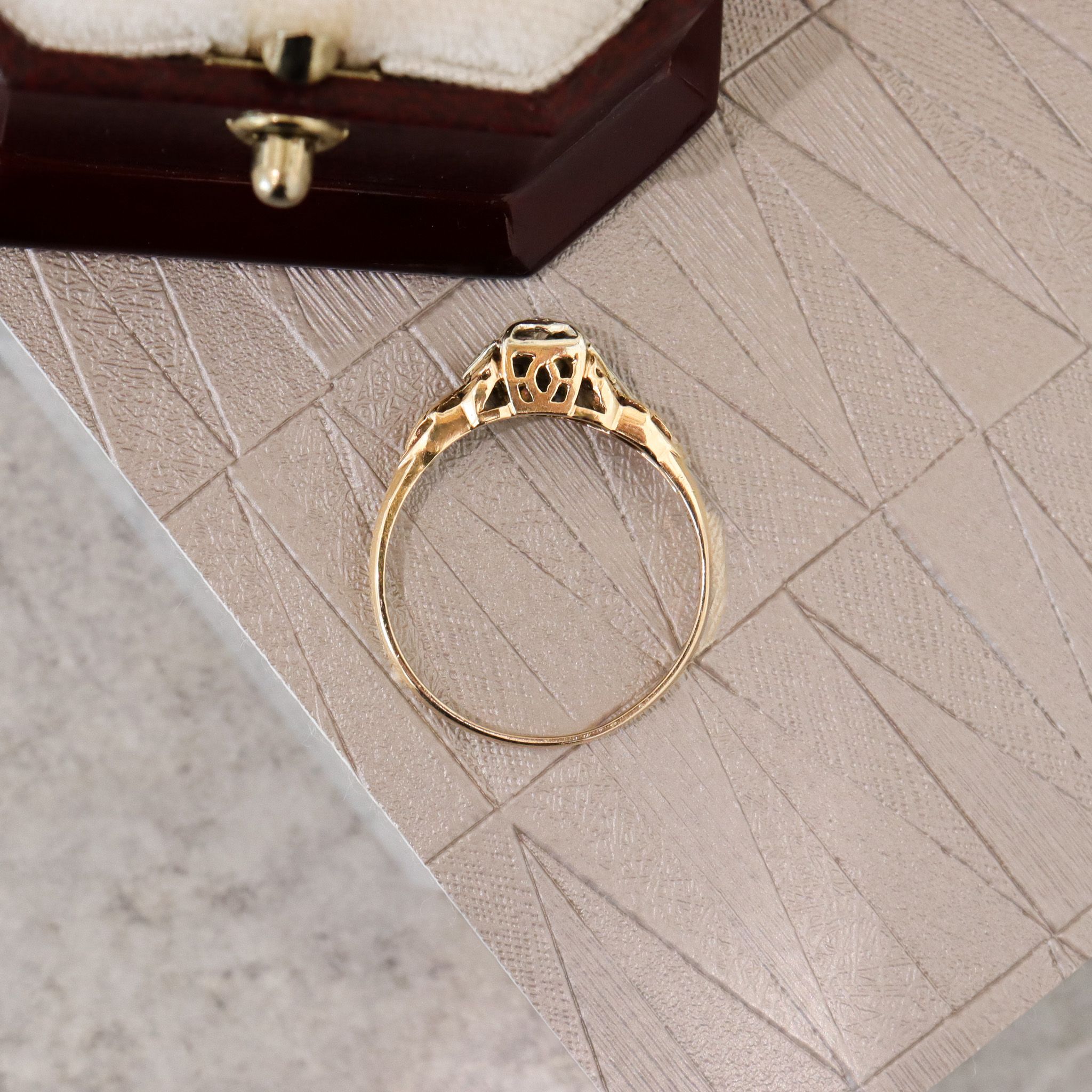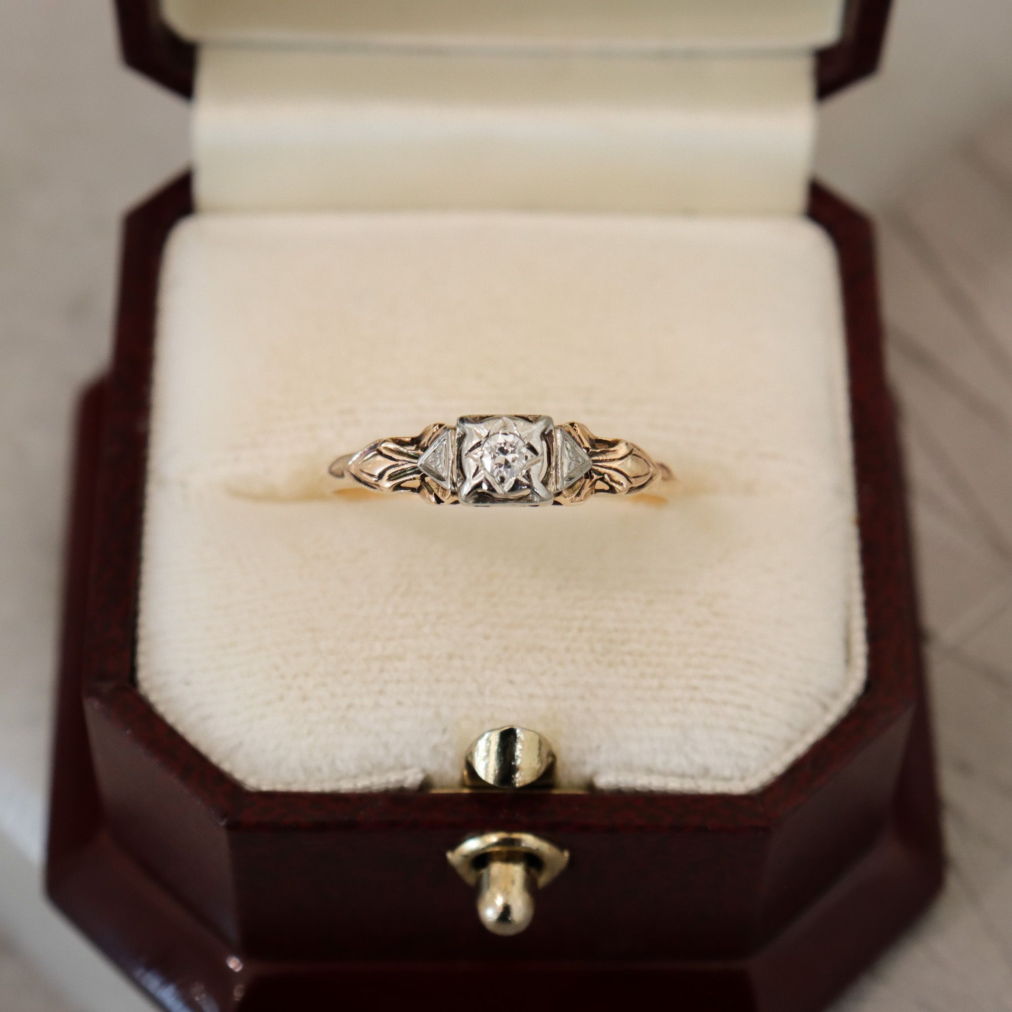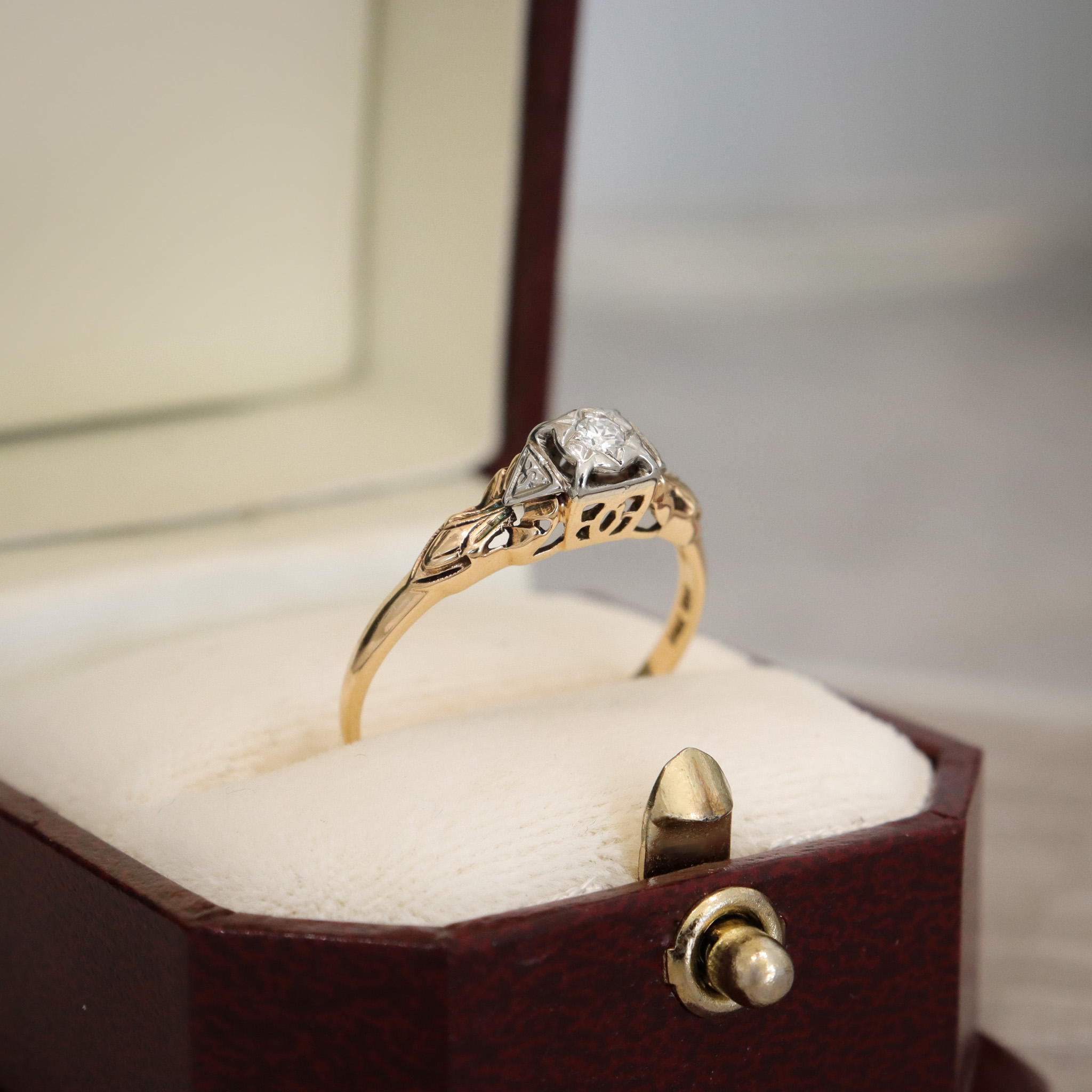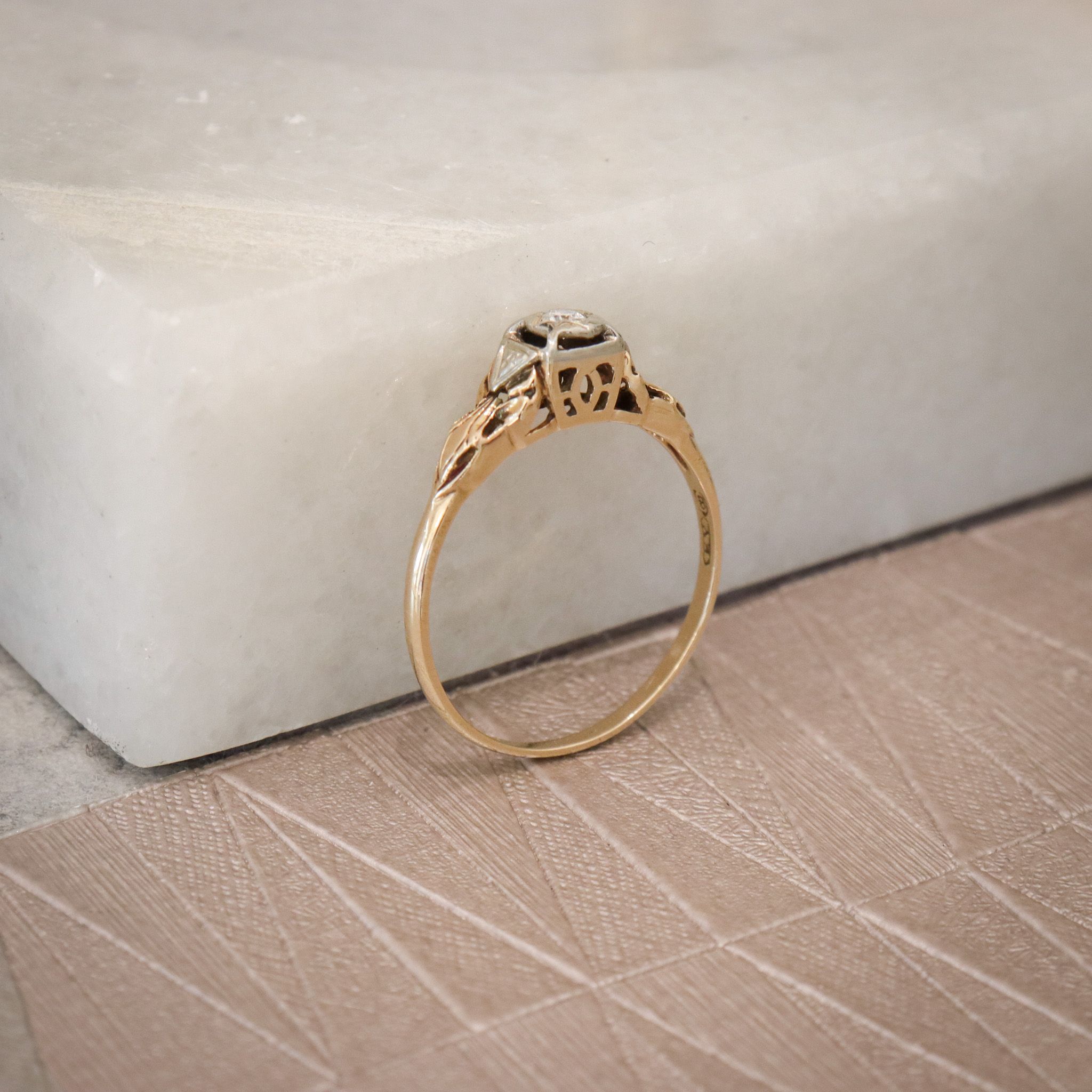 This charming 14ky and 18kw gold ring features a claw-set solitaire diamond in a decorative gold setting.