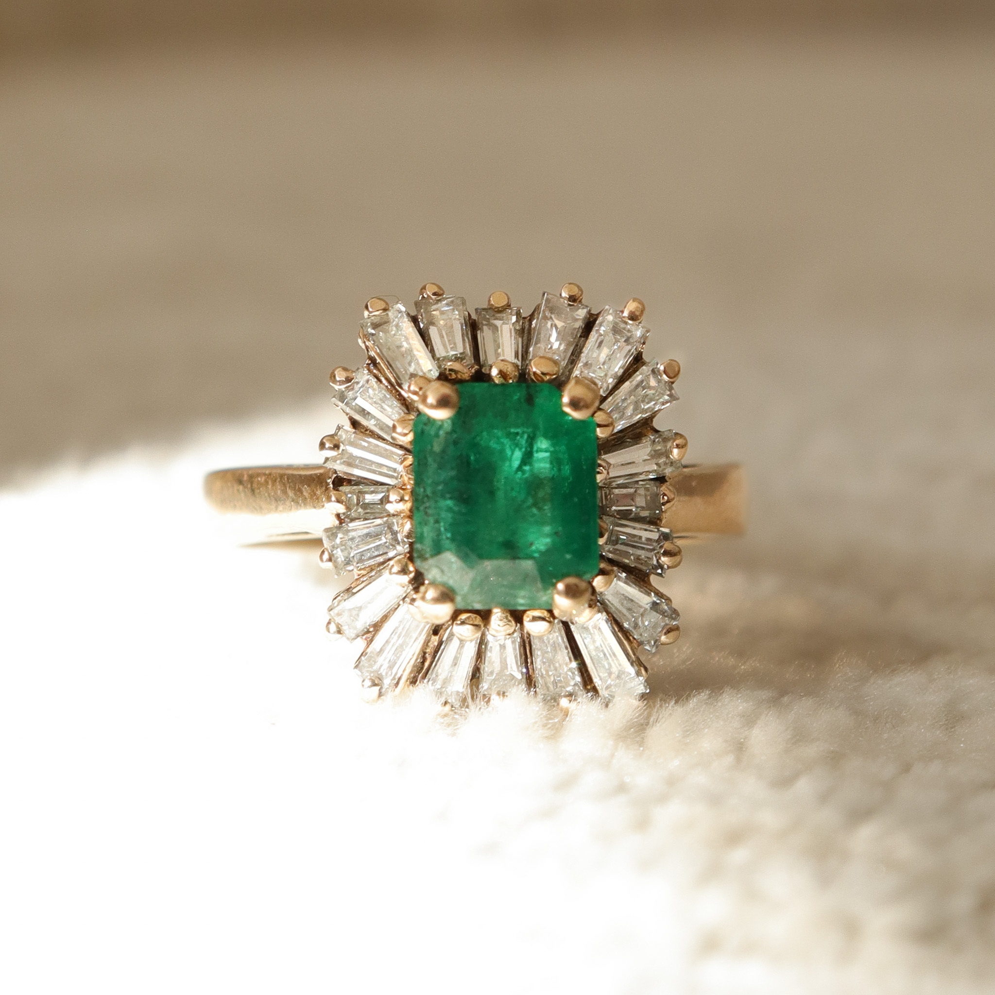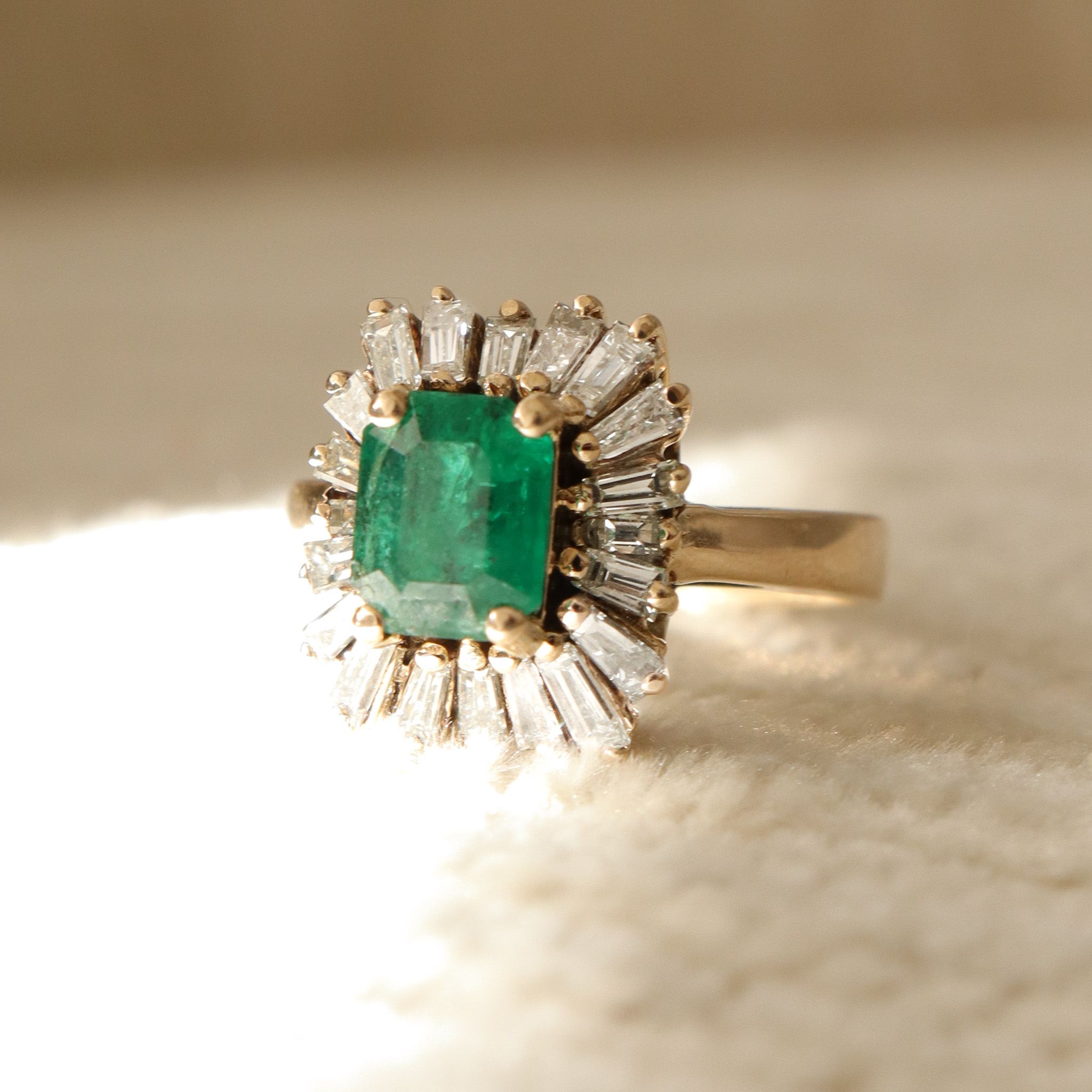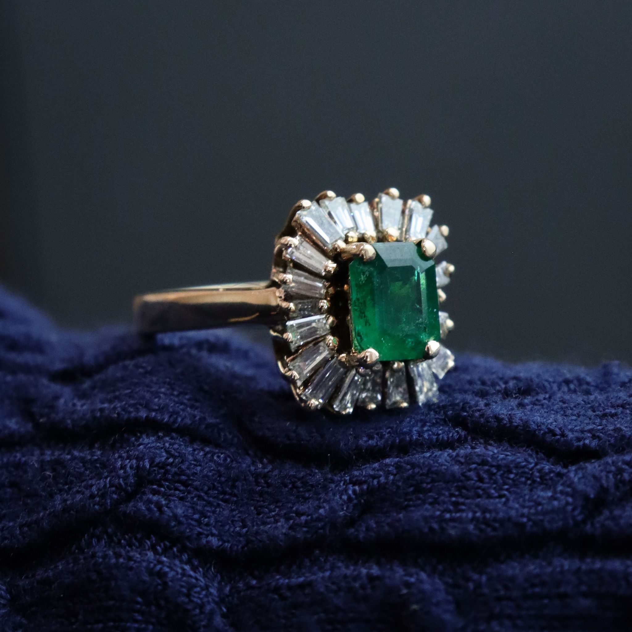 This natural emerald is surrounded by a dazzling tutu of tapered baguette diamonds. Set in 14k yellow gold, this retro beauty is certainly a conversation starter and ready for it's next chapter.