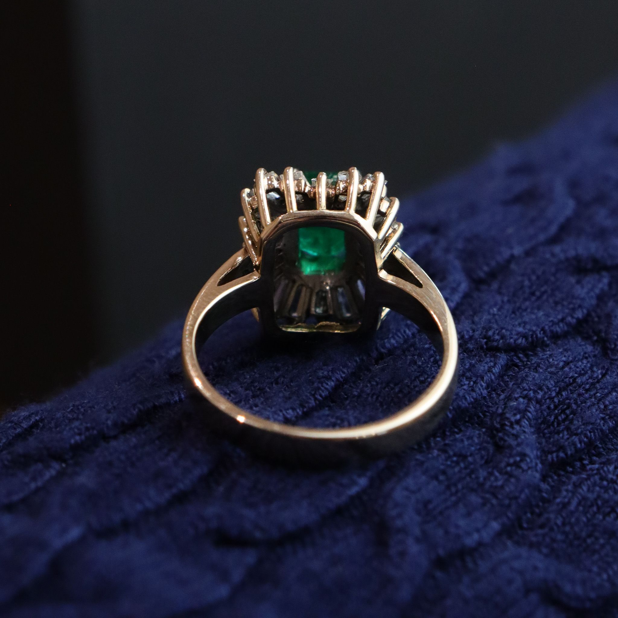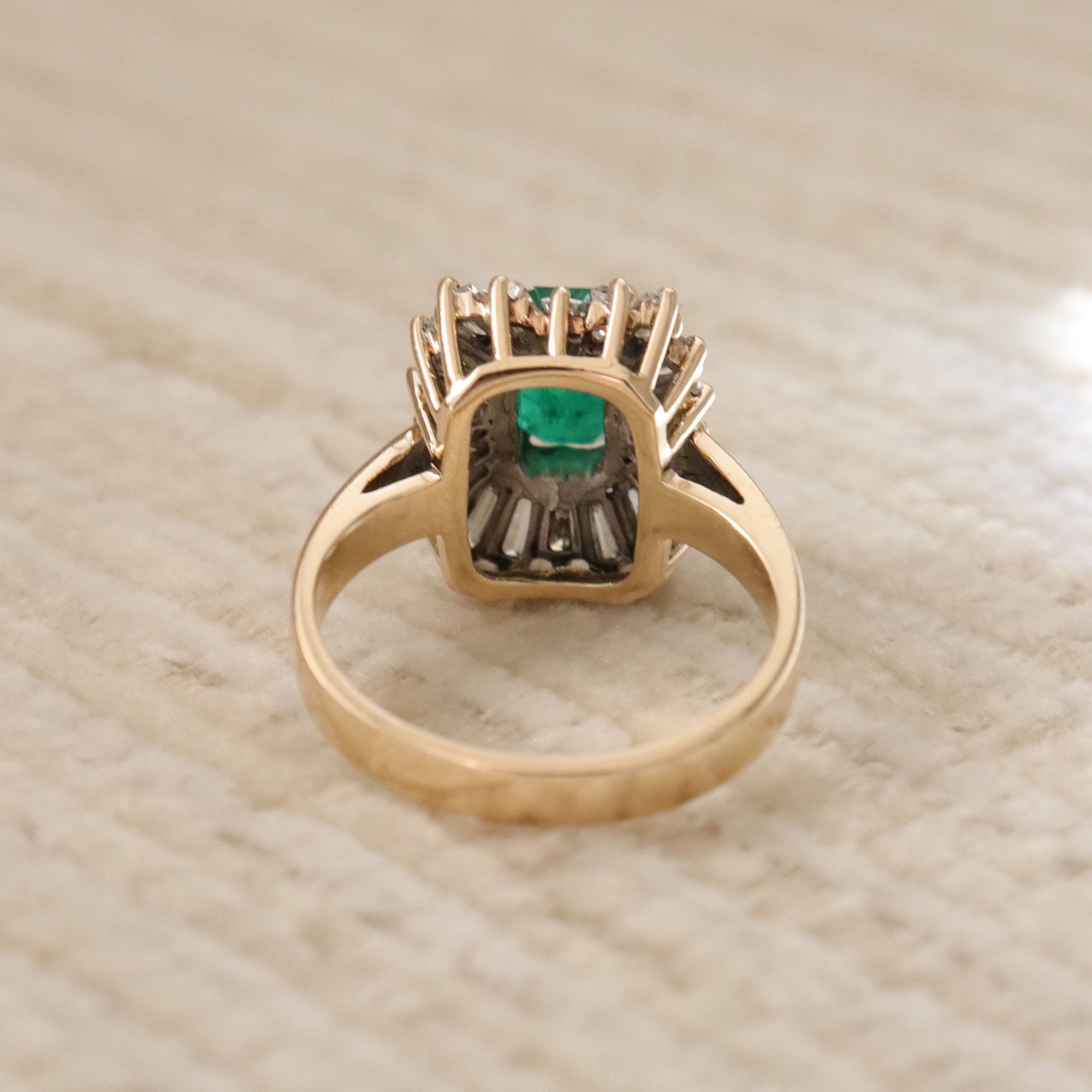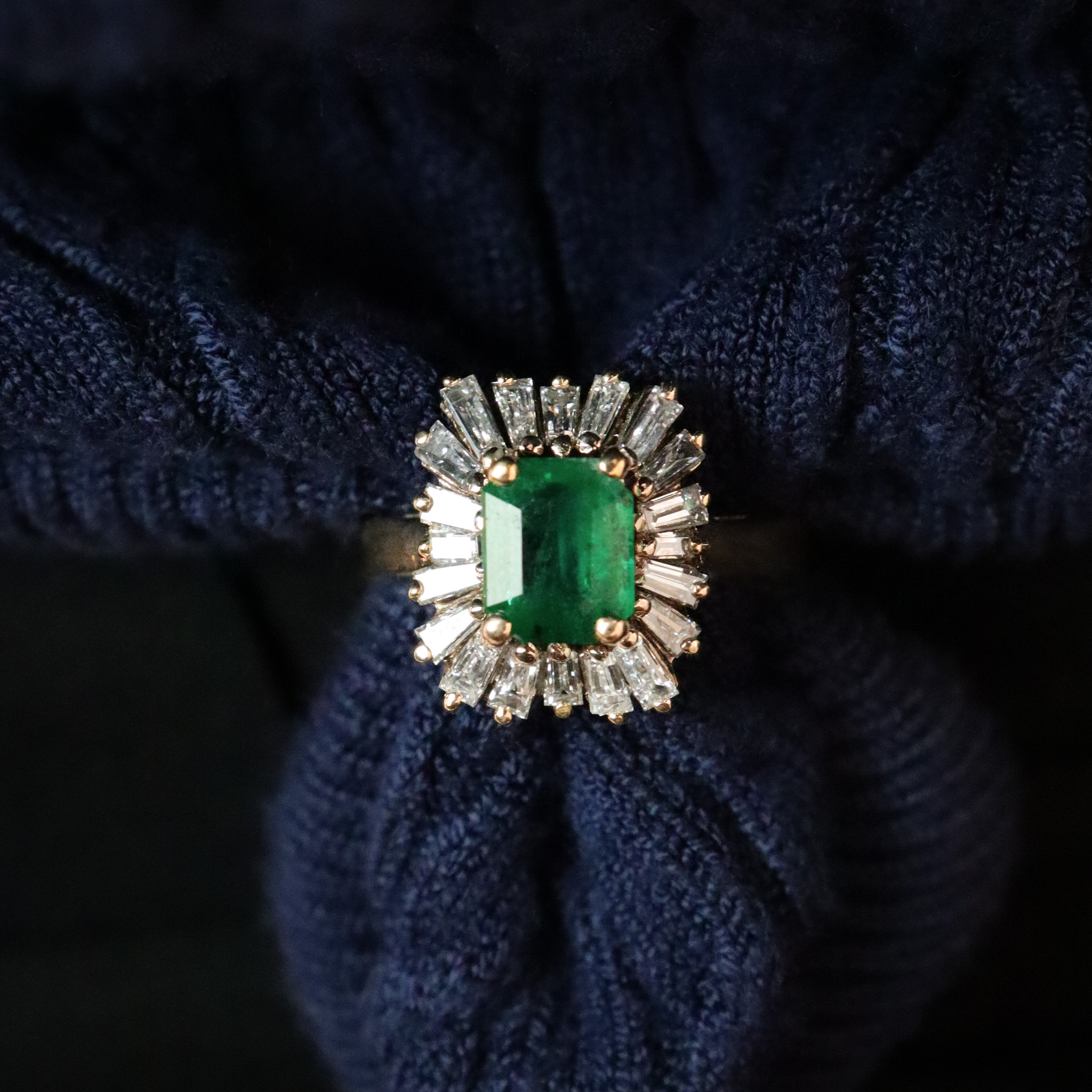 This natural emerald is surrounded by a dazzling tutu of tapered baguette diamonds. Set in 14k yellow gold, this retro beauty is certainly a conversation starter and ready for it's next chapter.
