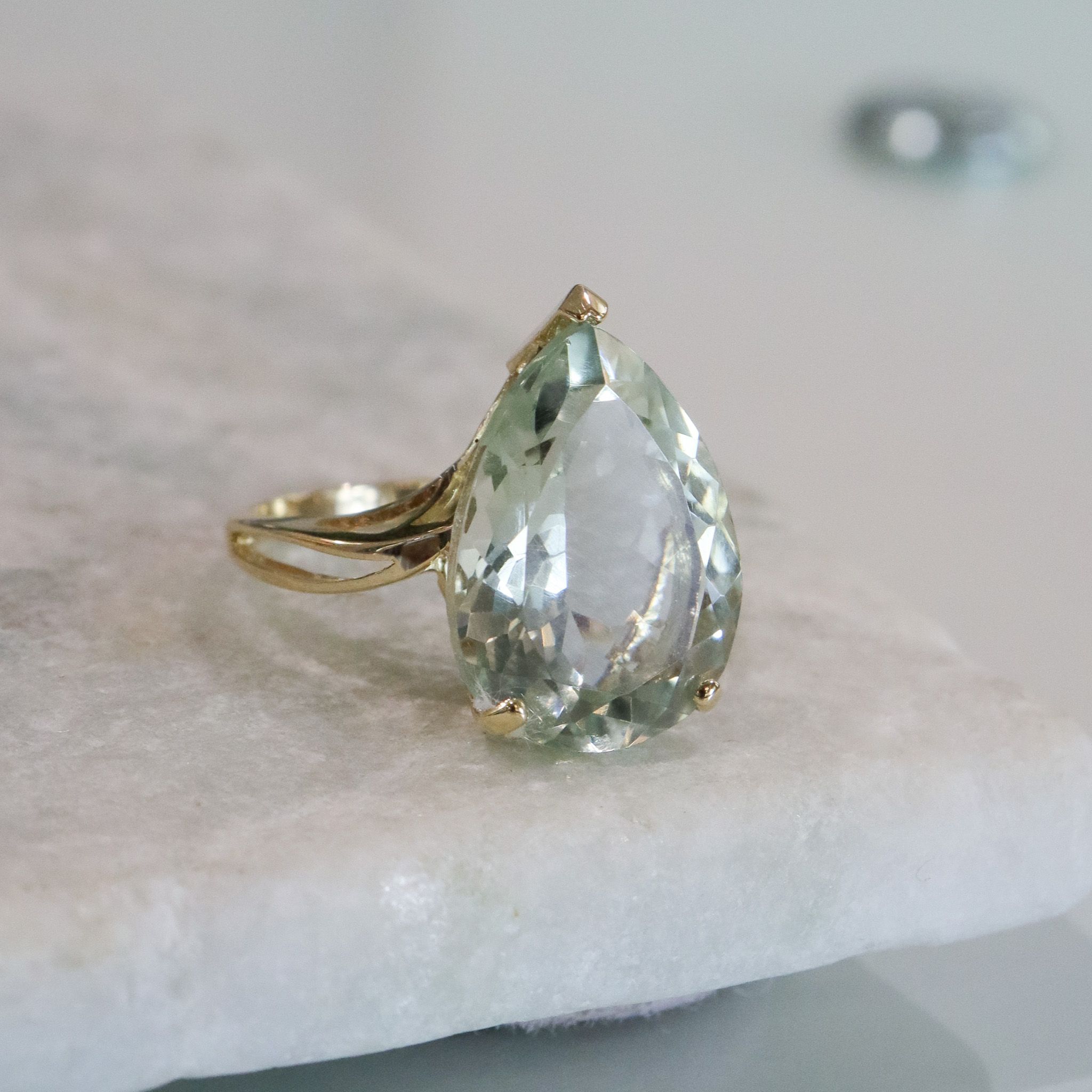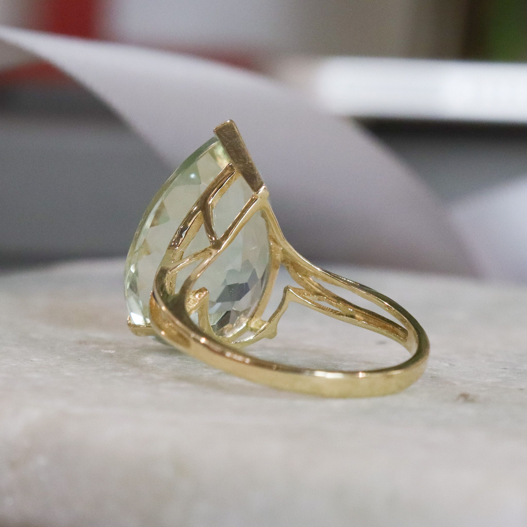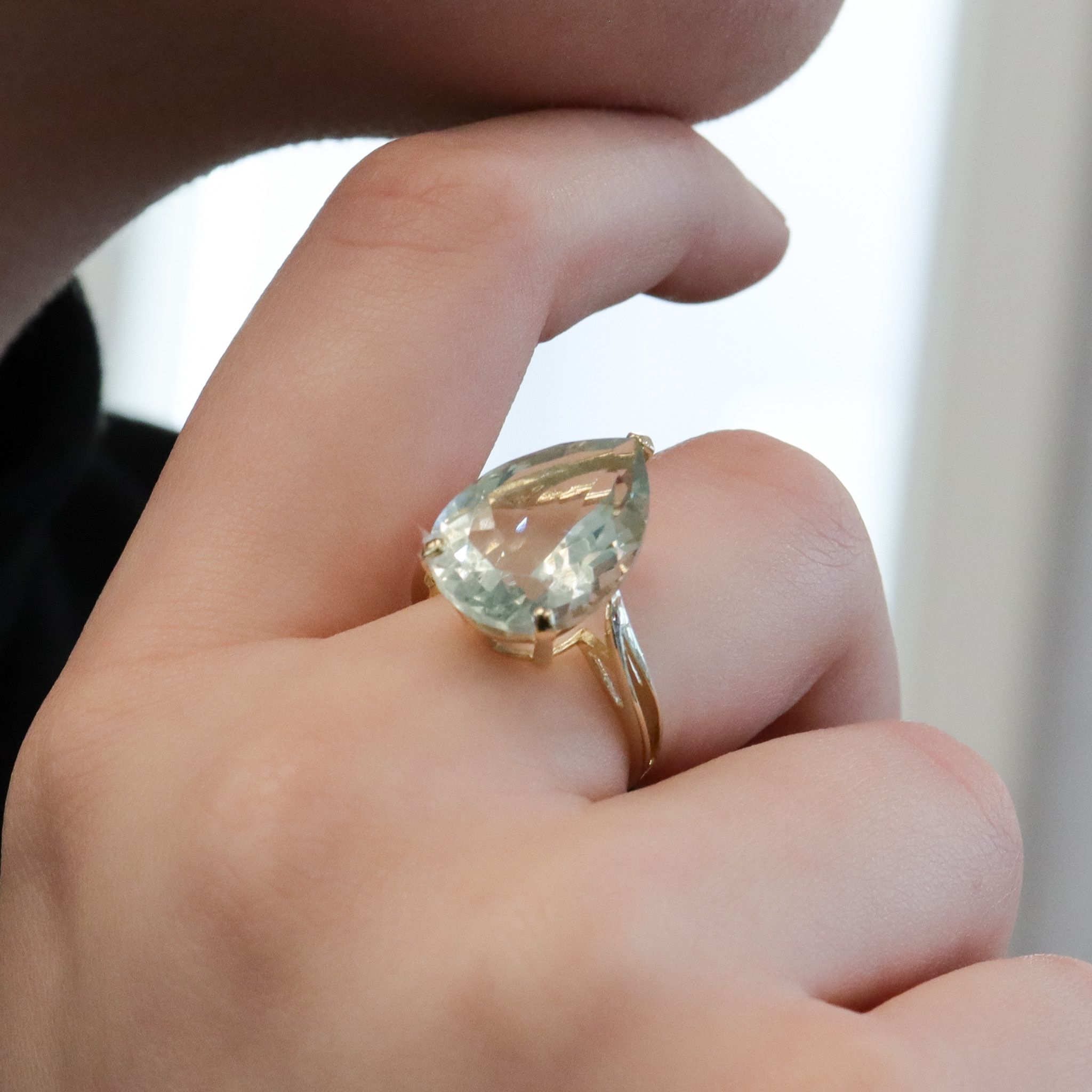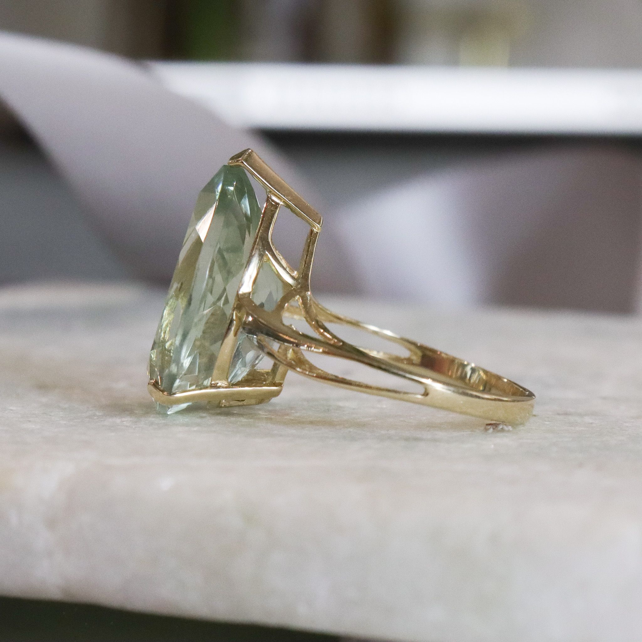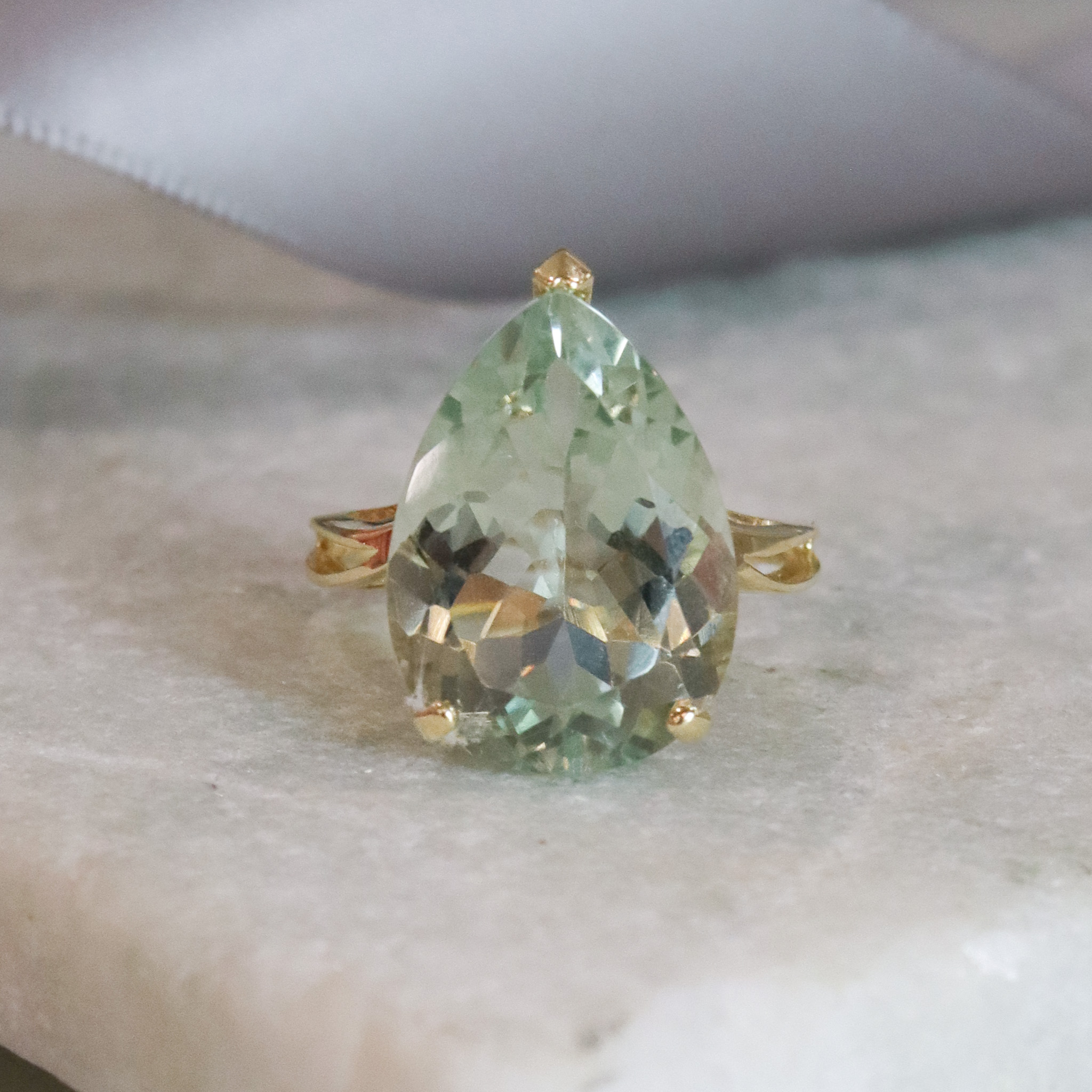 This is a ring where the stone is the star of the show. One large pastel prasiolite (green amethyst) is held by 14k yellow gold, in a setting that wants you to see the stone as much as possible. A fun statement ring, without the usual bold colours.
