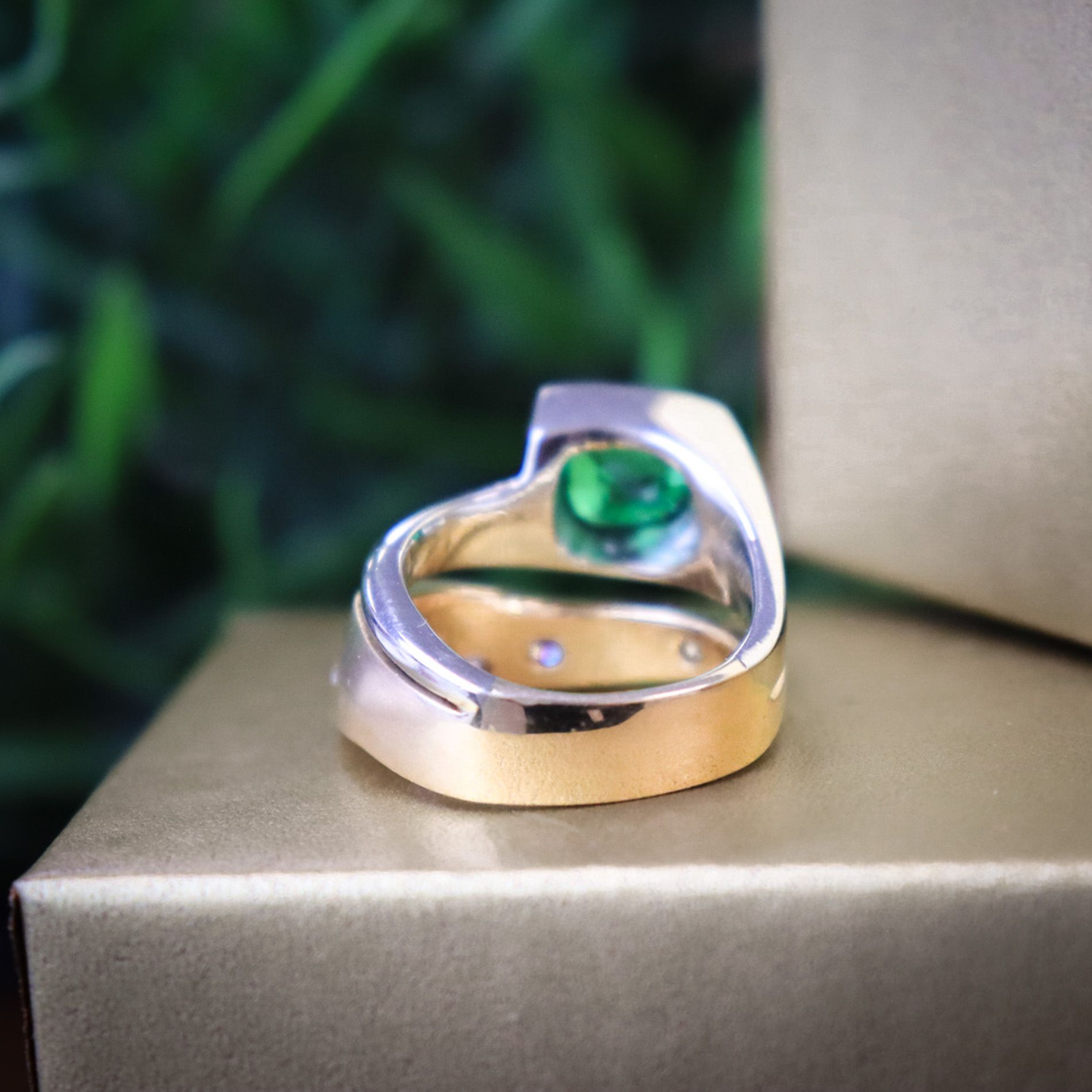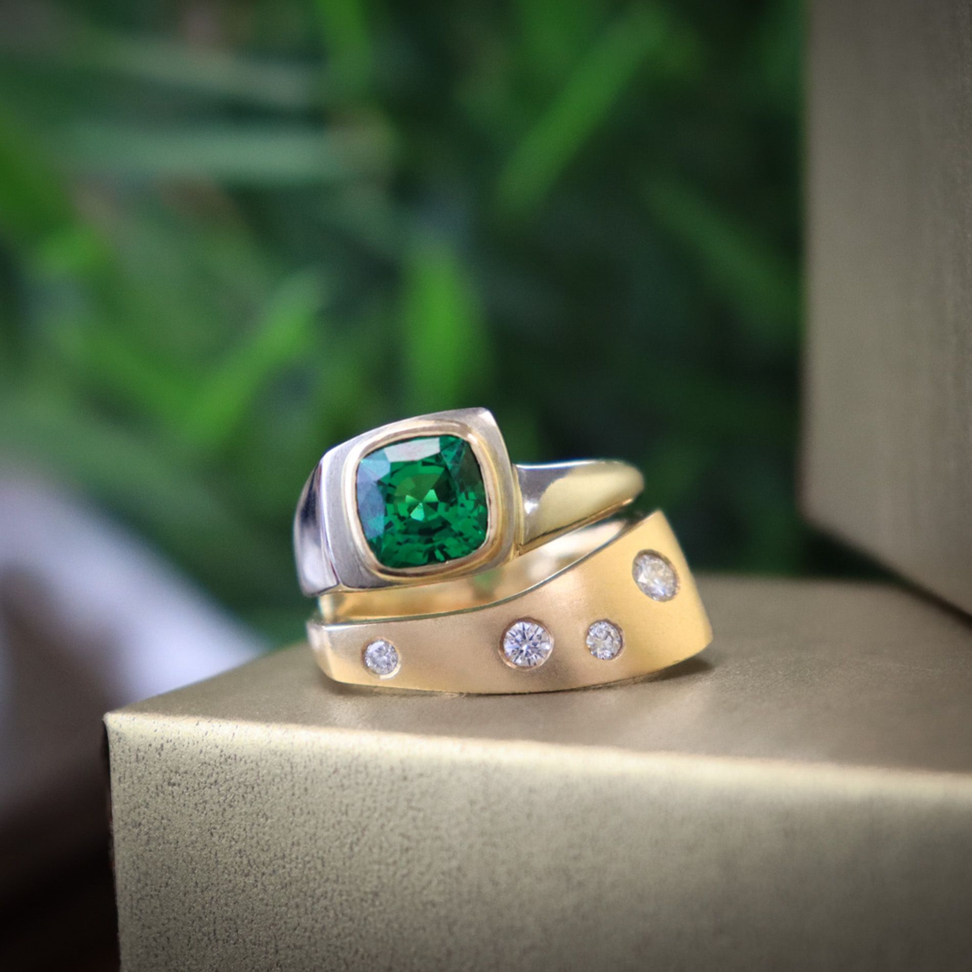 A lovely 2.70ct cushion cut Tsavorite & Diamond ring, created by the renowned Halifax goldsmith James Bradshaw. This modern design is a playful jest on the traditional two ring set, re-imagined with opposing bands of 14k yellow & white gold. No solitaire diamond here, instead a captivating pop of vibrant gemstone green. This signed, never-been-worn piece was acquired from the personal collection of Bradshaw.