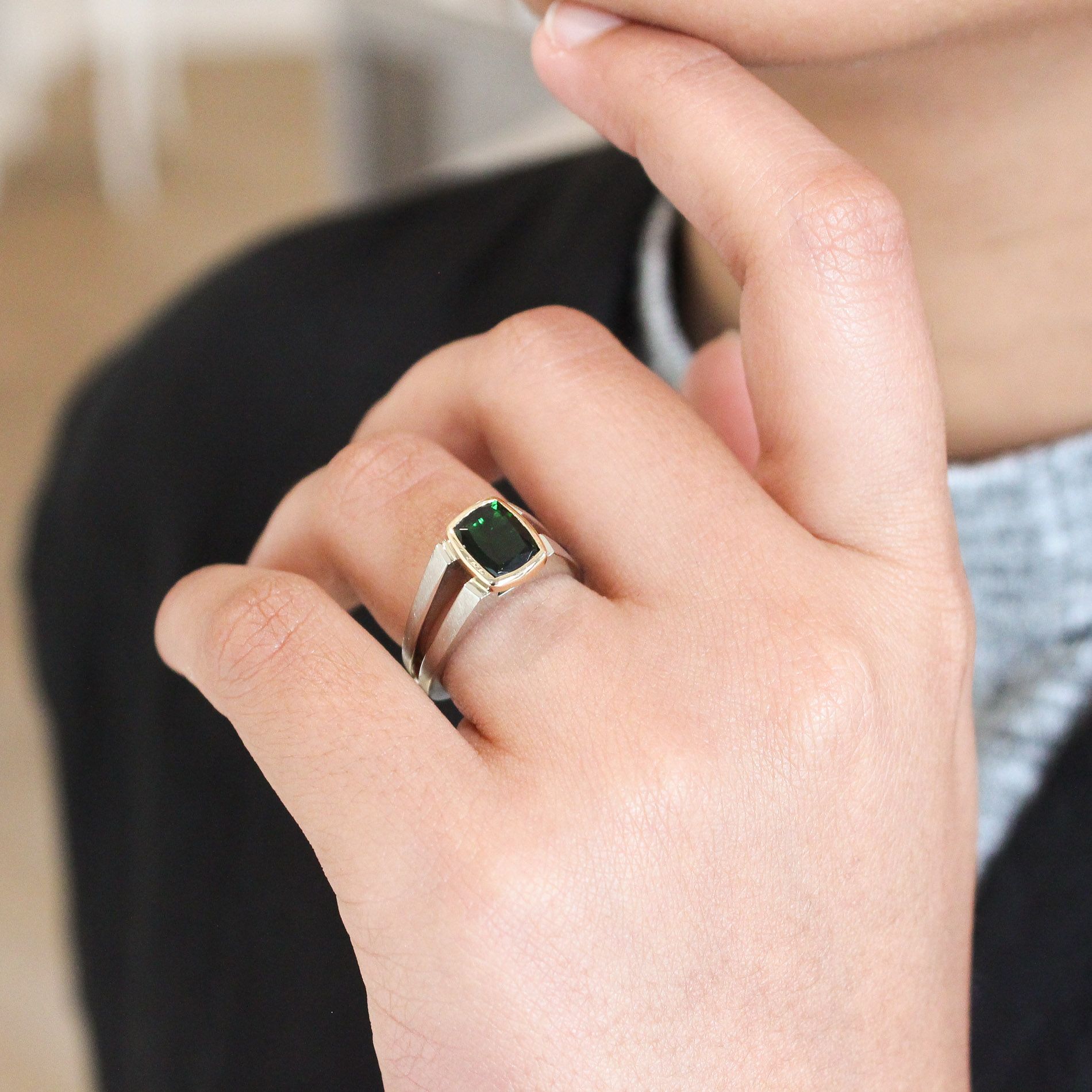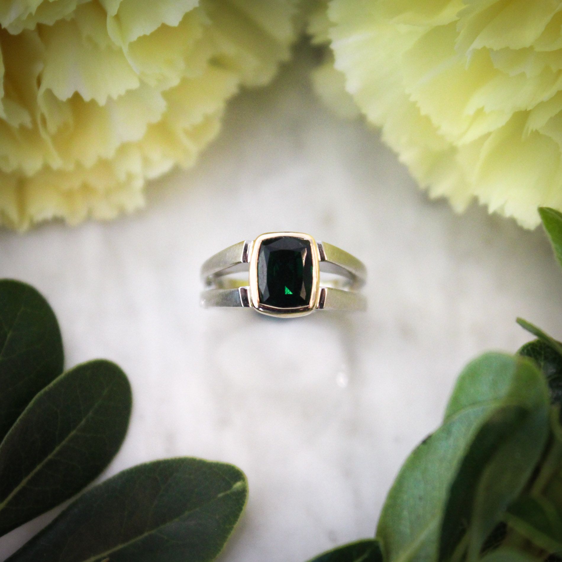 Bold, clean lines dominate Goldsmith James Bradshaw's work and this ring showcases his style beautifully. A deep, moody green 1.10ct Tsavorite is set in a 14k yellow gold bezel, atop a split shank band in 14k brushed white gold. Slightly more traditional style but substantially crafted, this ring is designed to be comfortable, for everyday wear. This signed, never-been-worn piece was acquired from the personal collection of Bradshaw.