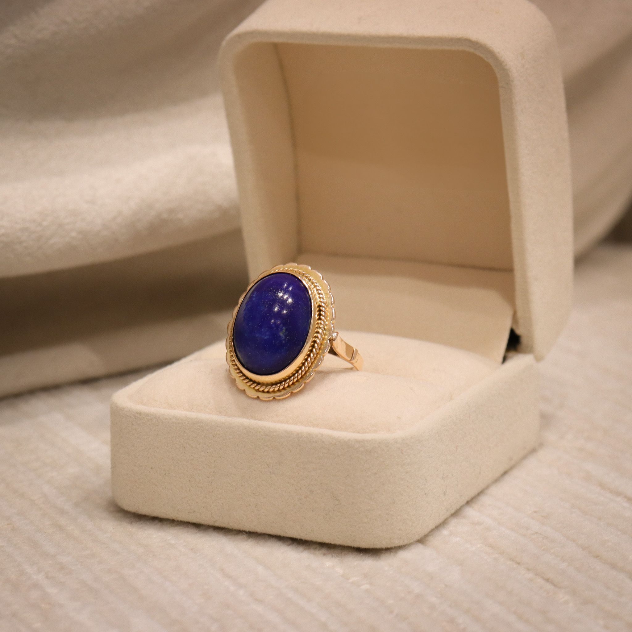 Woven gold wraps around a rich blue lapis, accentuating the sparkling gold flecks in the stone. This classic retro ring is great for stacking with other bands, or wearing as a standalone piece.