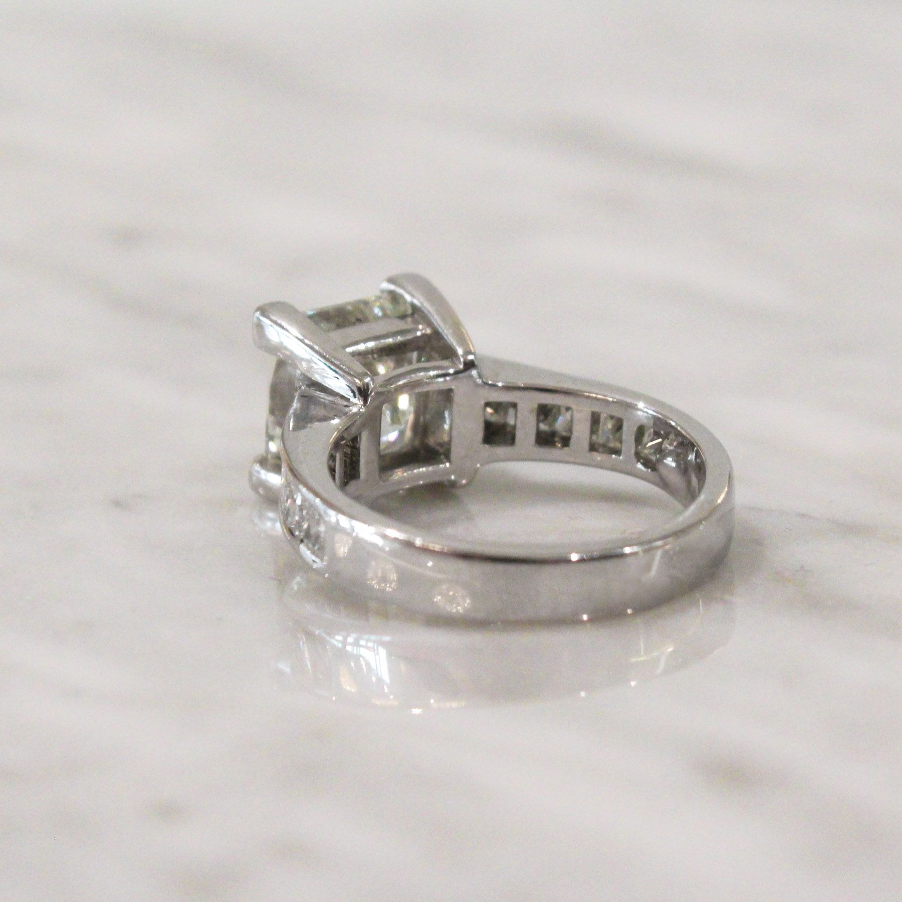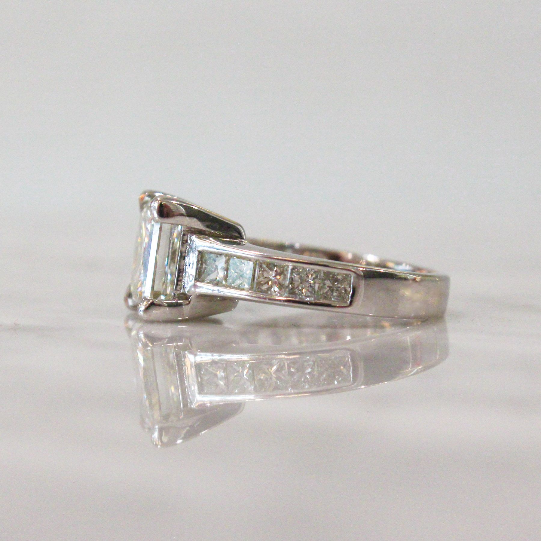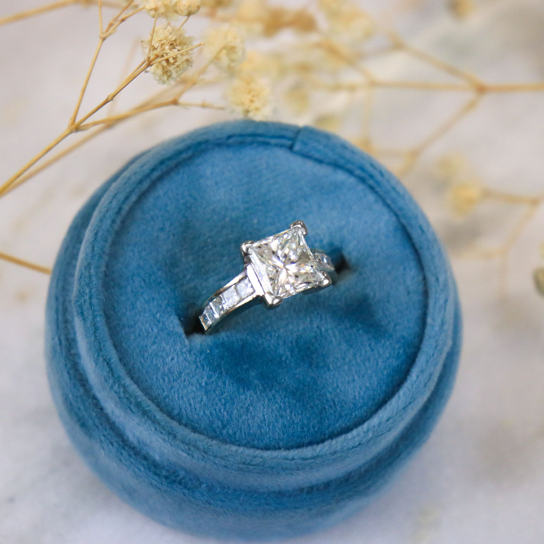 Who dreams in 3ct? We think this ring is the stuff dreams are made of! A huge 3ct diamond, a sea of sparkle, showcased in a chunky, channel set band with a additional carat of princess cut diamonds. A ring truly fit for a princess.