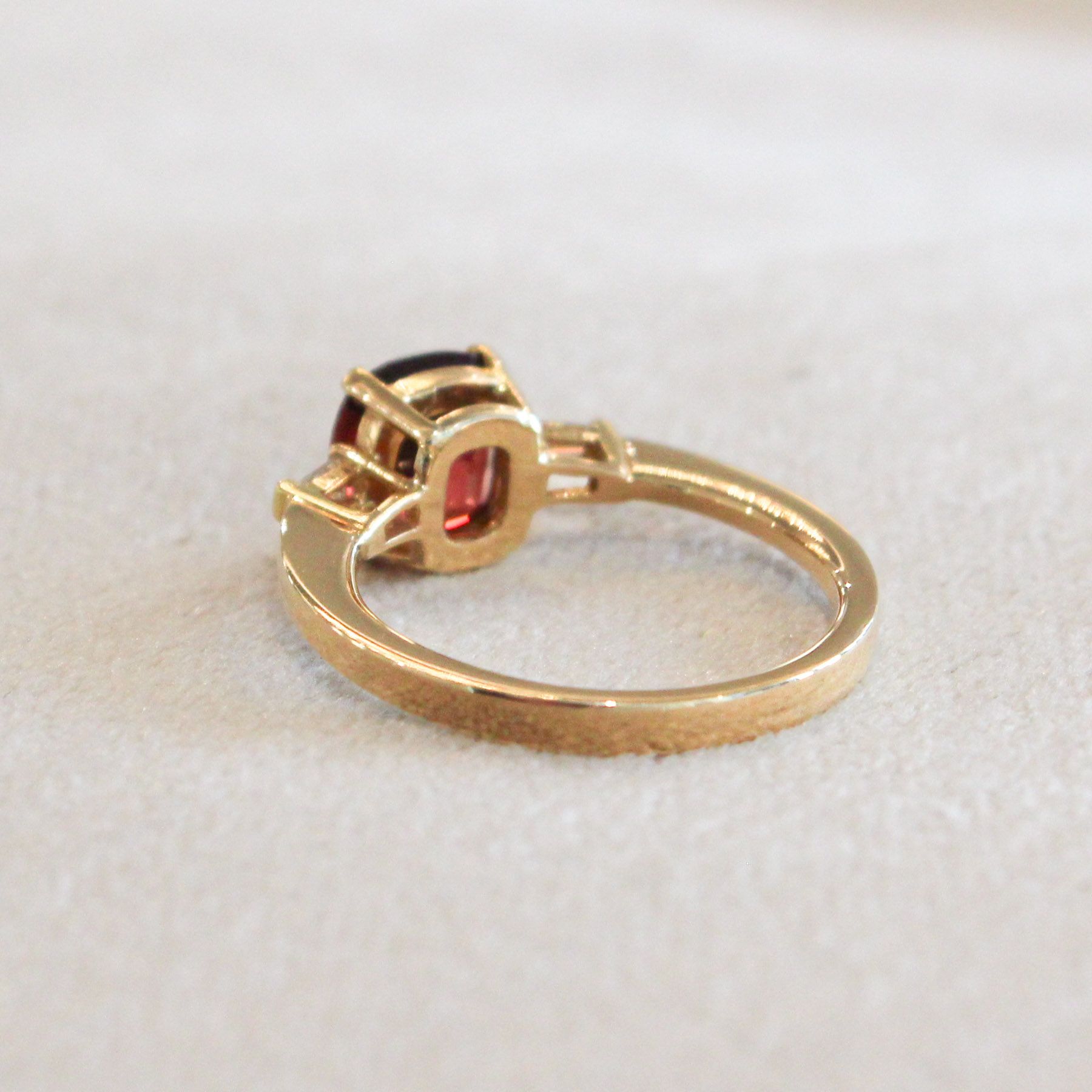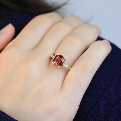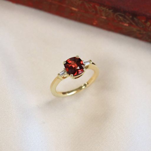 ring but given a fresh take with playful cherry red pop of colour. A cushion cut garnet is flanked by two tapered baguettes, set in a slender shank. Don't be fooled by the