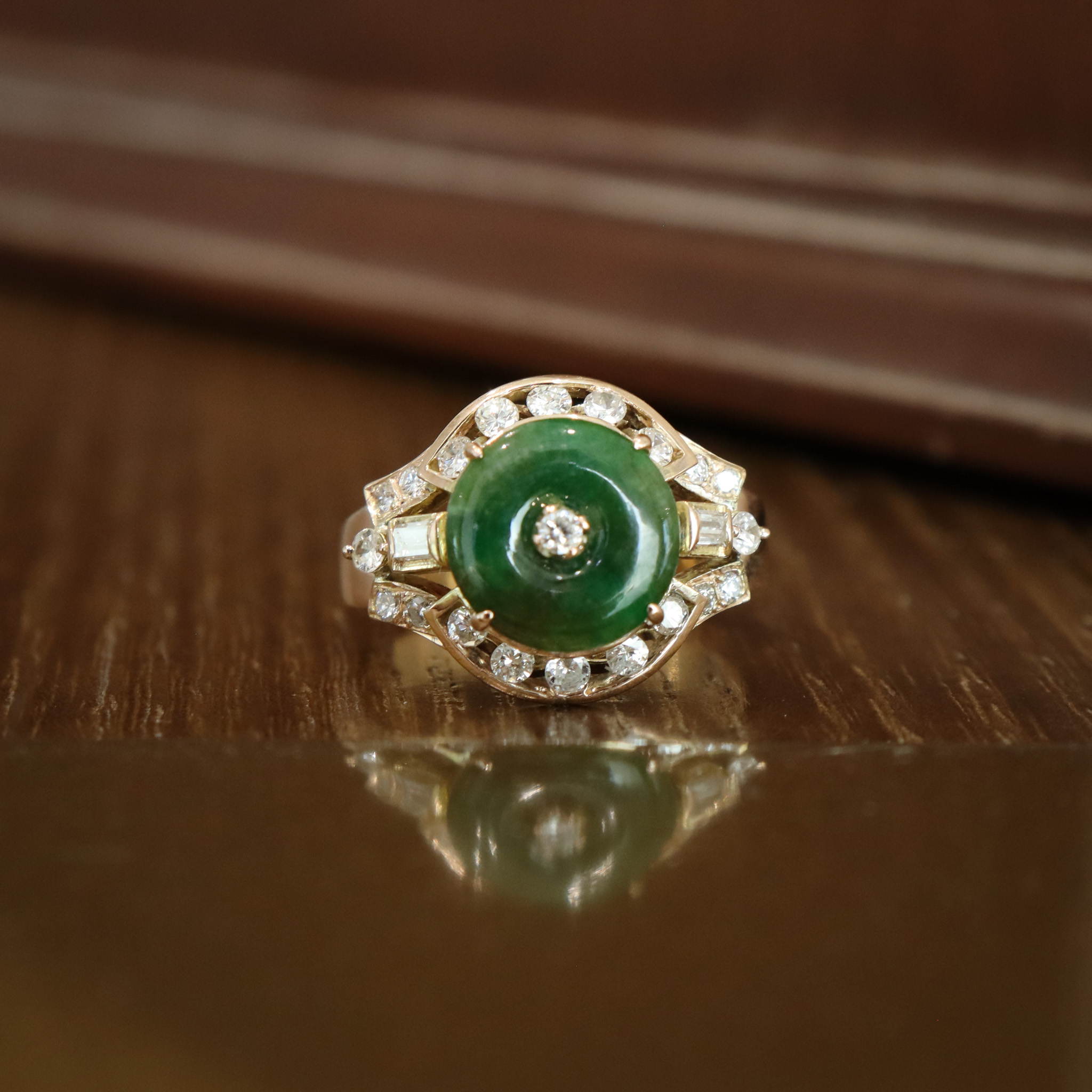 Glamorous and unique, this retro ring has a funky art-deco, yet contemporary feel to it. The mossy green jade disk is surrounded by a selection of baguette and round brilliant cut diamonds.