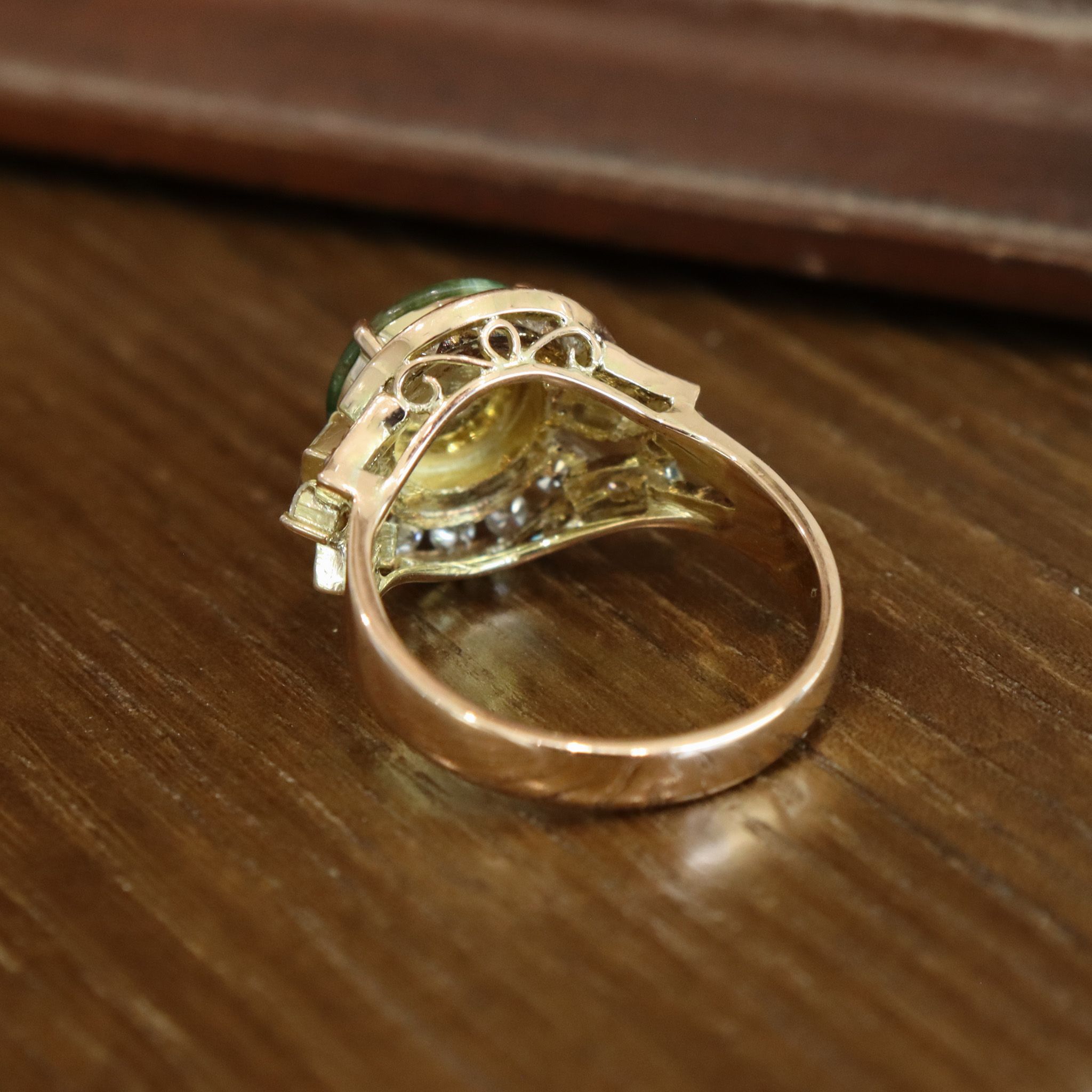 During this Era platinum and precious metals were once again rationed for the war effort. Making yellow gold the metal choice of the time. Various alloys were used to create thinner sheets of metal which gave jewellers a chance to experiment with new finishing techniques. With these new alloys came various shades of gold, sometimes seen in a single piece. Gemstones were also in short supply meaning a lot of pieces were made with more metal versus housing gemstones. Less expensive stones became more popular including topaz, amethyst, aquamarine and citrine. Diamonds were reserved for the use of pave settings and as accent stones. It was not uncommon during this time to commission a bespoke piece using metals and gemstones already owned.