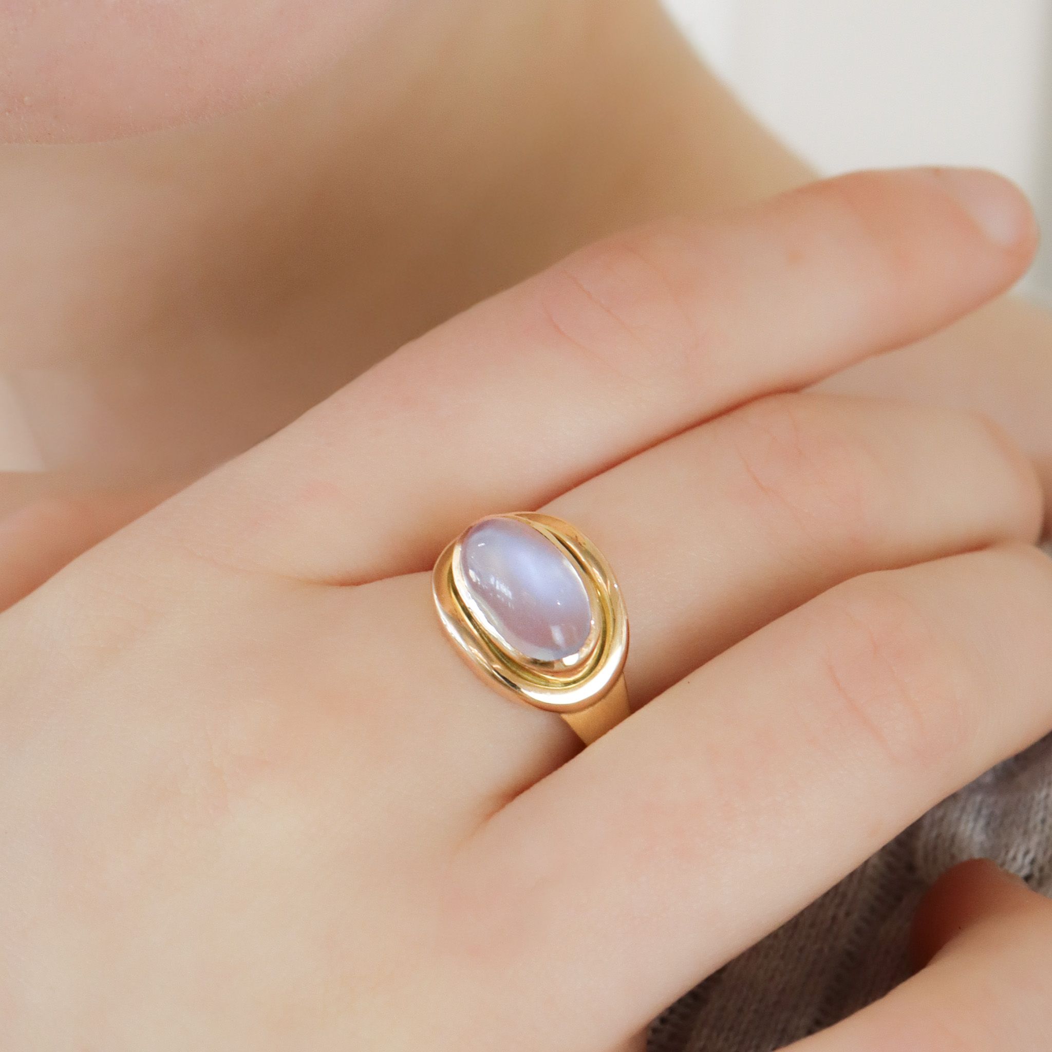 The east-west set oval cabochon echoes the shape of a droplet at rest, while the flowing gold form reflects the soft movement of water as it disperses. As alive as the sea it reflects - the Royal Blue Moonstone is a solid embodiment of the salt water it represents. A piece that captures the quiet beauty of motion, reflection, and return.