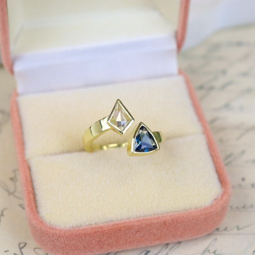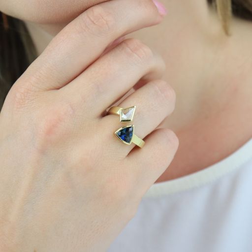 This Toi et Moi 18k yellow gold ring is hand fabricated in house by our diligent goldsmiths. The flat bypass shank is bezel set at either end with one kite shaped diamond & one triangle cut natural blue sapphire. The toi et moi (you and me) style is a historical symbol of love & partnership. Together, these gems create a meaningful pairing that celebrates the depth and complexity of a cherished relationship.