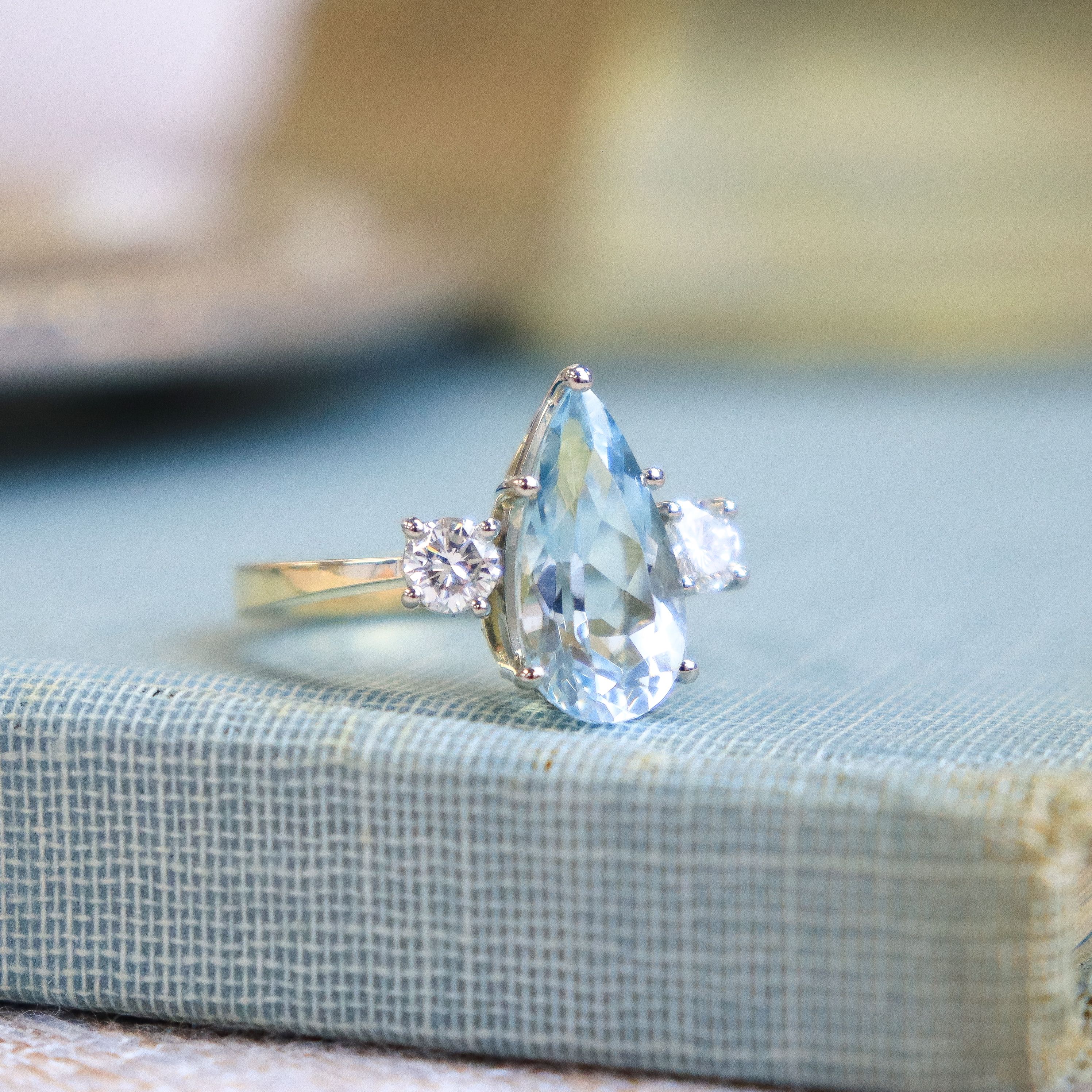 We love the elegant look of this watery, elongated aquamarine. Smartly flanked by two round brilliant cut diamonds & set in 18k white & yellow gold, this ring is a chic statement on the hand. Fabricated in house, with our signature comfort fit band, it feels just as good to wear as it looks.