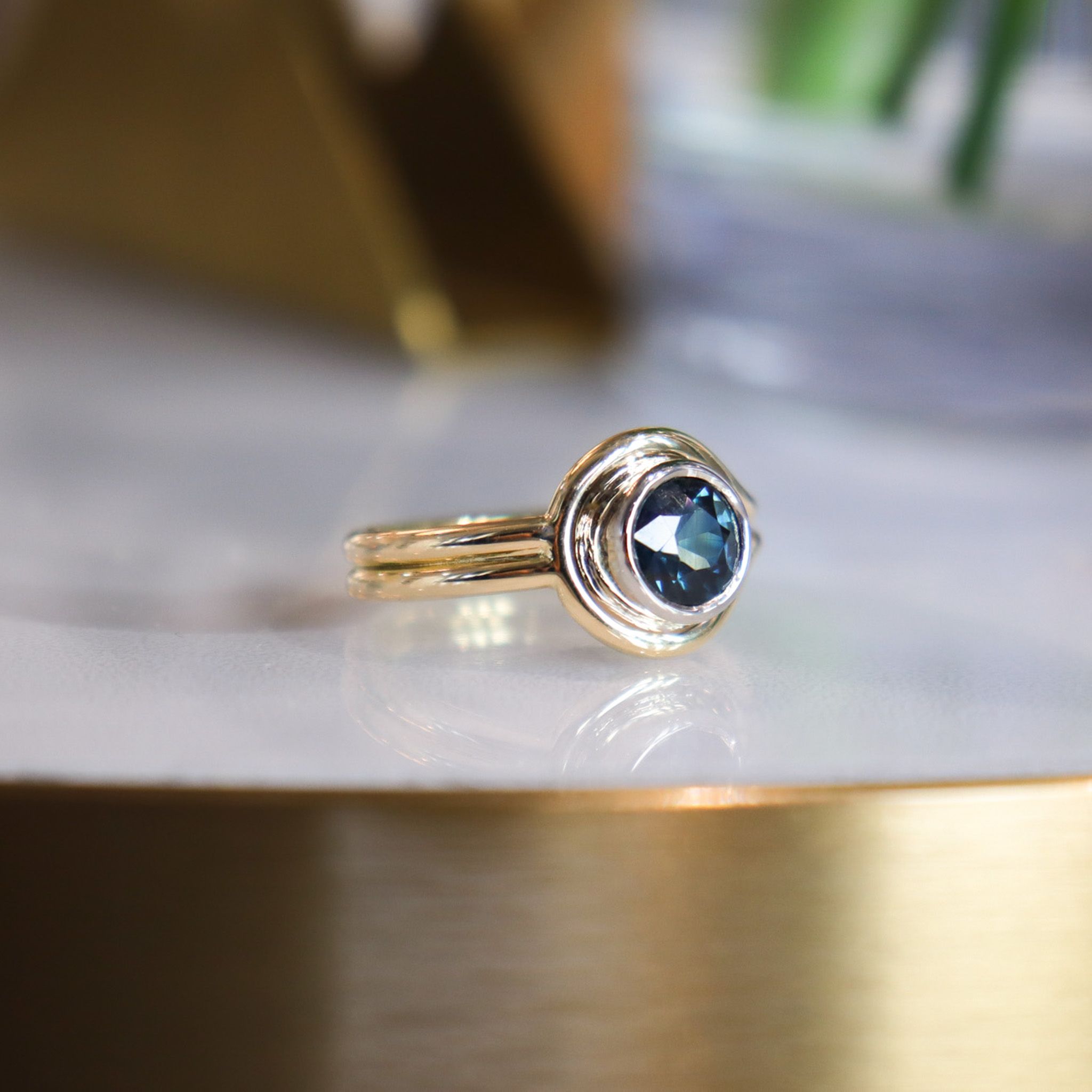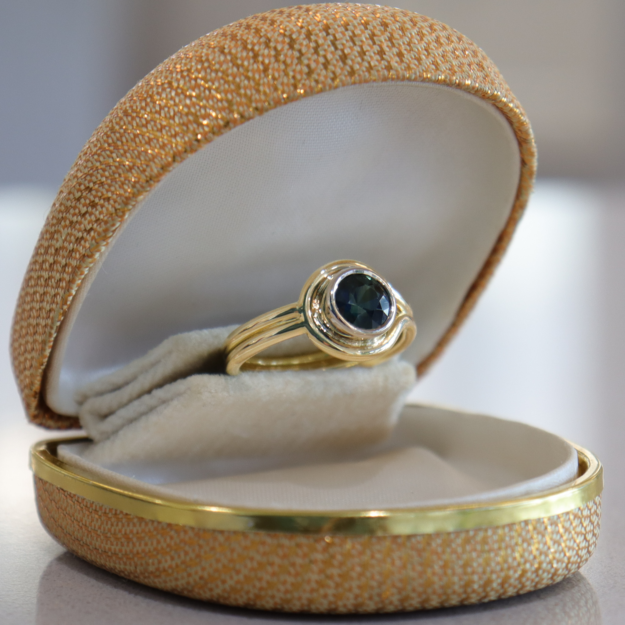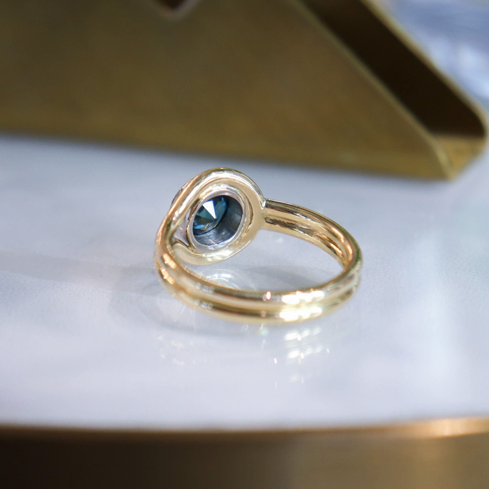 Find a stunning deep teal blue sapphire perched within a solid white gold bezel. This timeless 18k knot design was built to offer comfort, sophistication, and durability for generations to come.