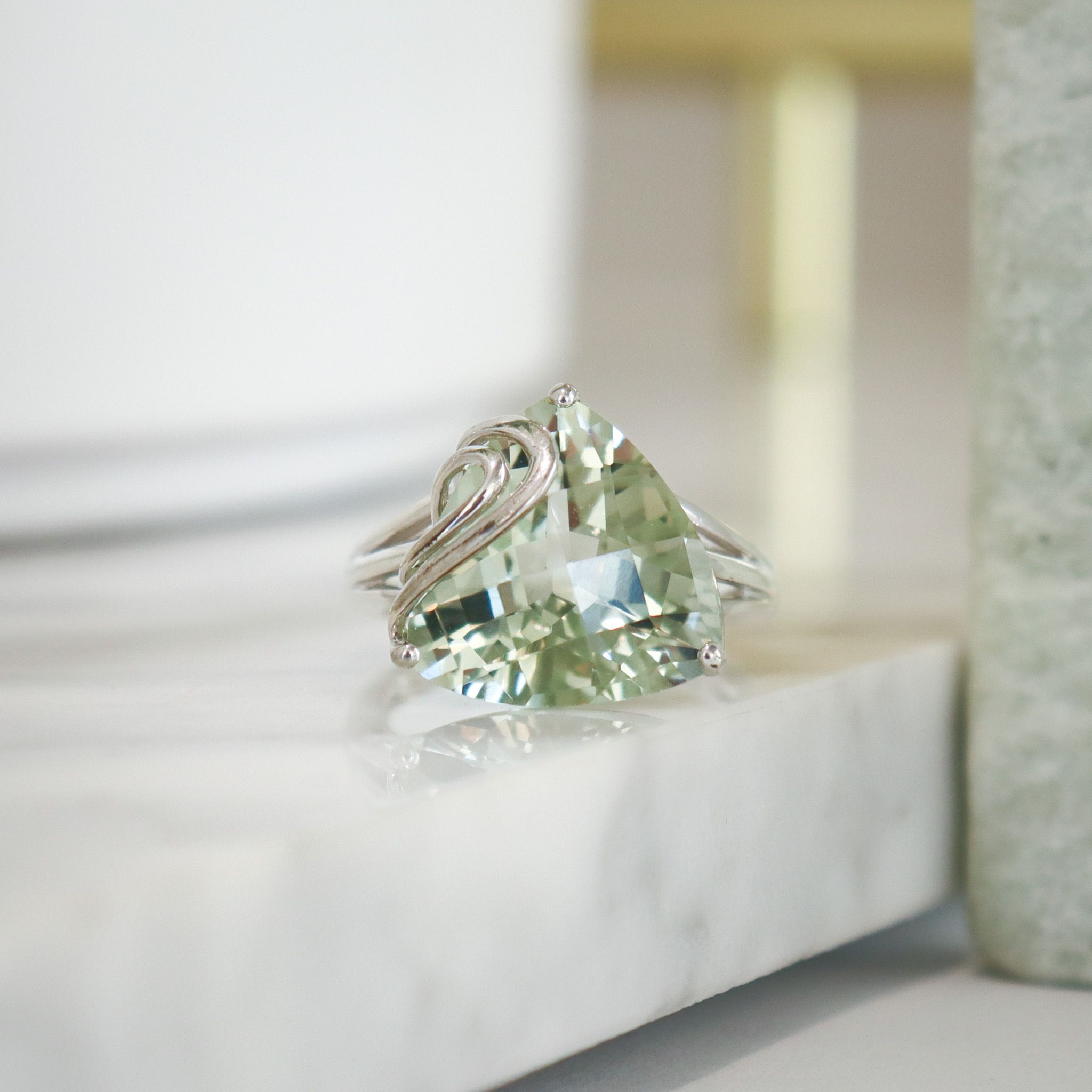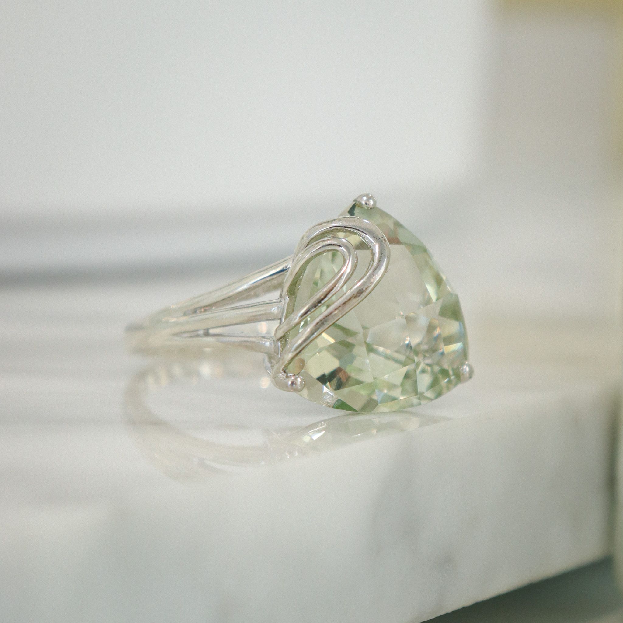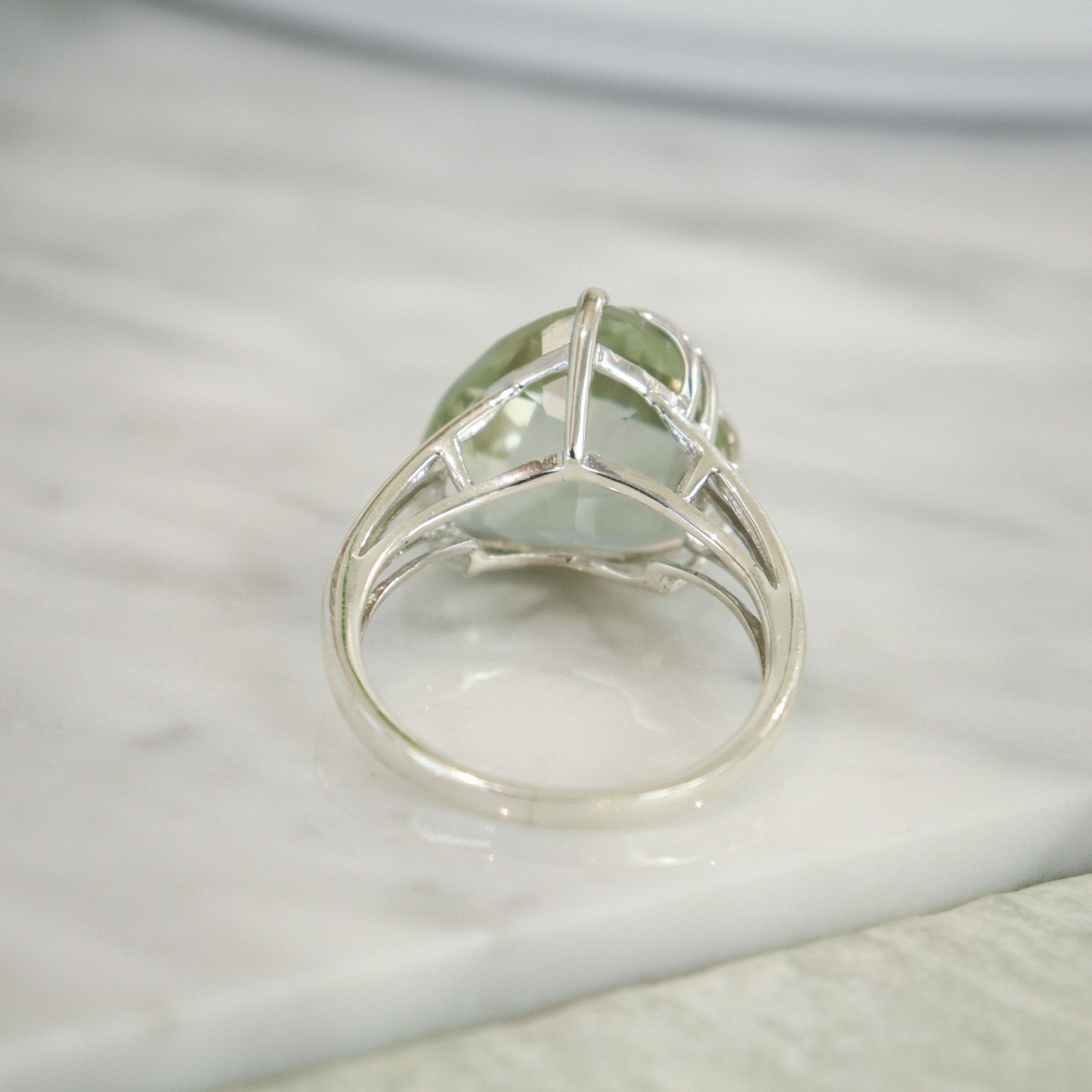 A large checkerboard prasiolite sparkles in sterling silver, making this a lovely cool-toned cocktail ring.
