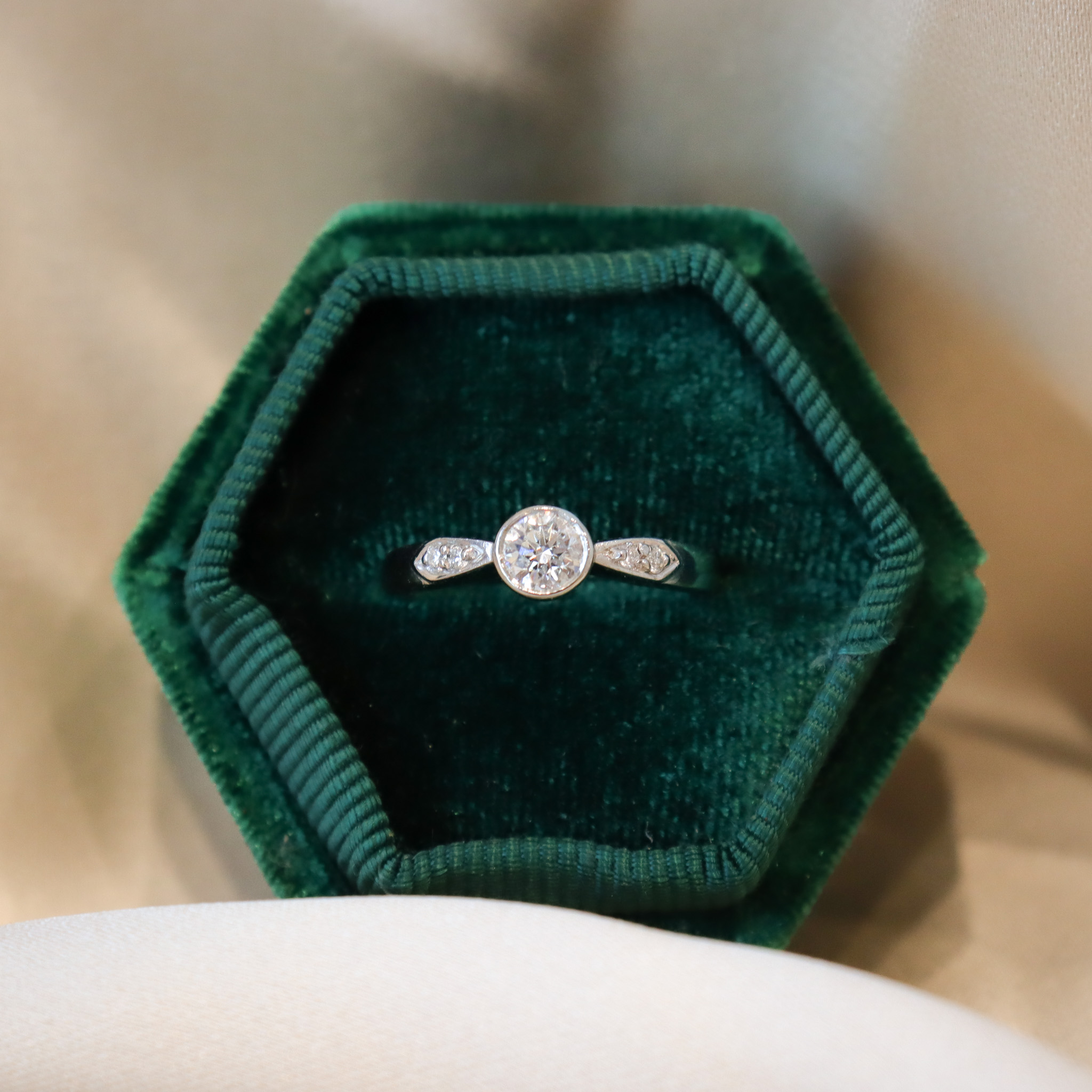 This sweet diamond ring may look dainty, but it's a fantastic piece for everyday wear! Made from sturdy platinum, and the diamond being bezel-set makes this a ring that can be worn anywhere as either a right-hand ring or an engagement ring.